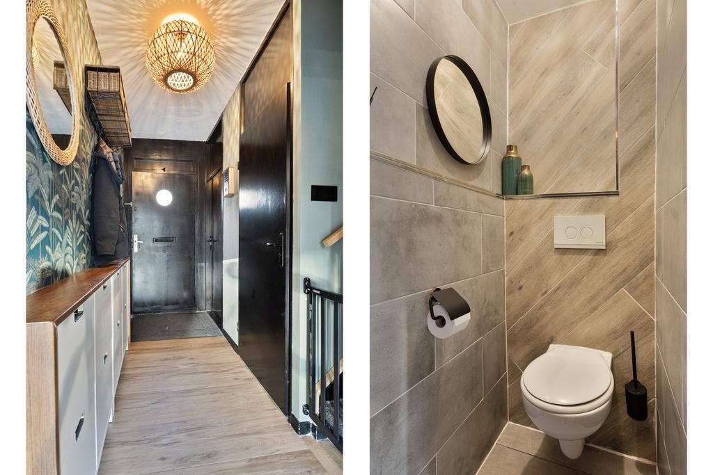 Achter de voordeur wacht een nette hal met een moderne sfeervolle toiletruimte (zwevend toilet en fonteintje), de trapopgang naar de 1e verdieping en toegang tot de woonkamer met keuken.