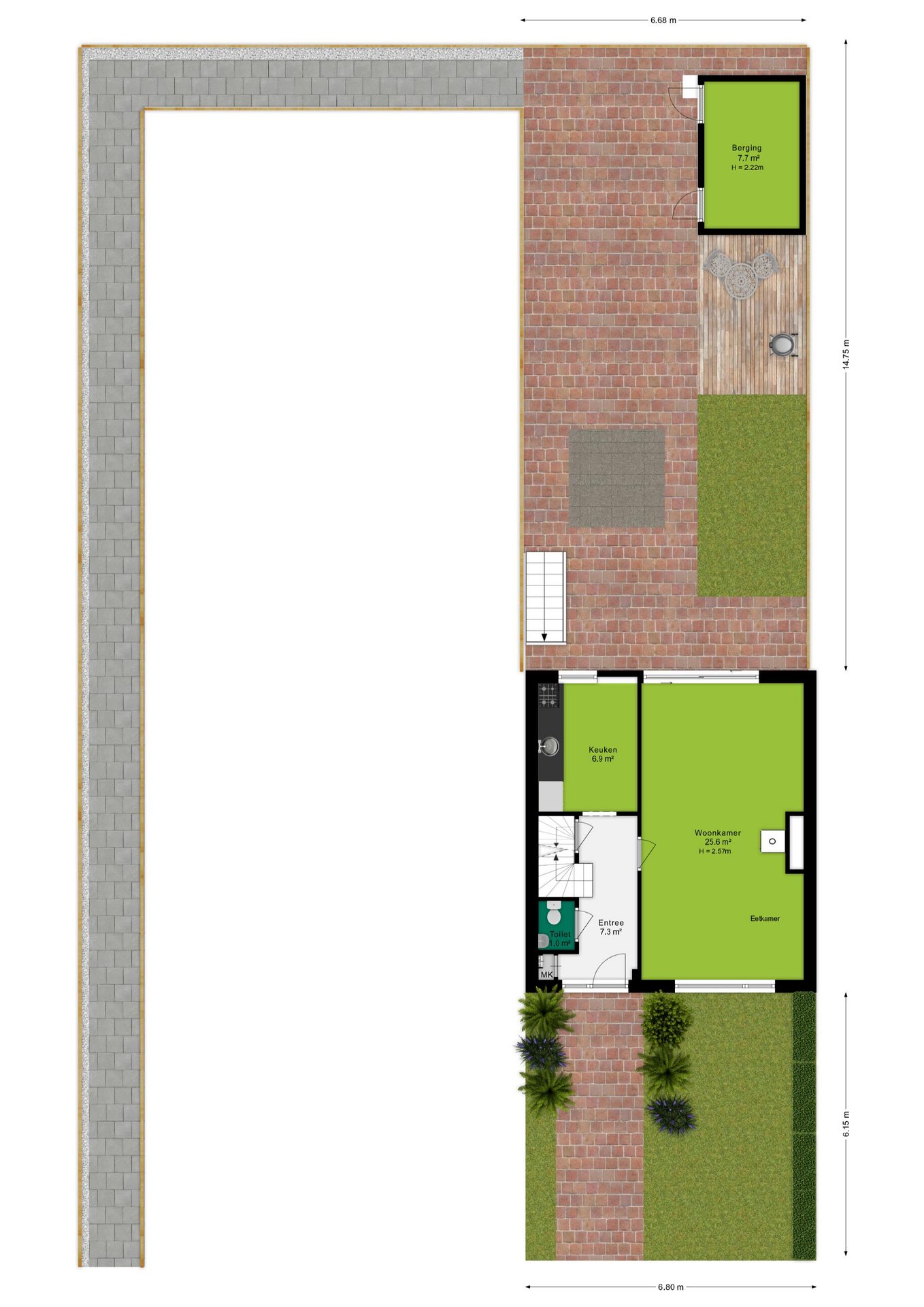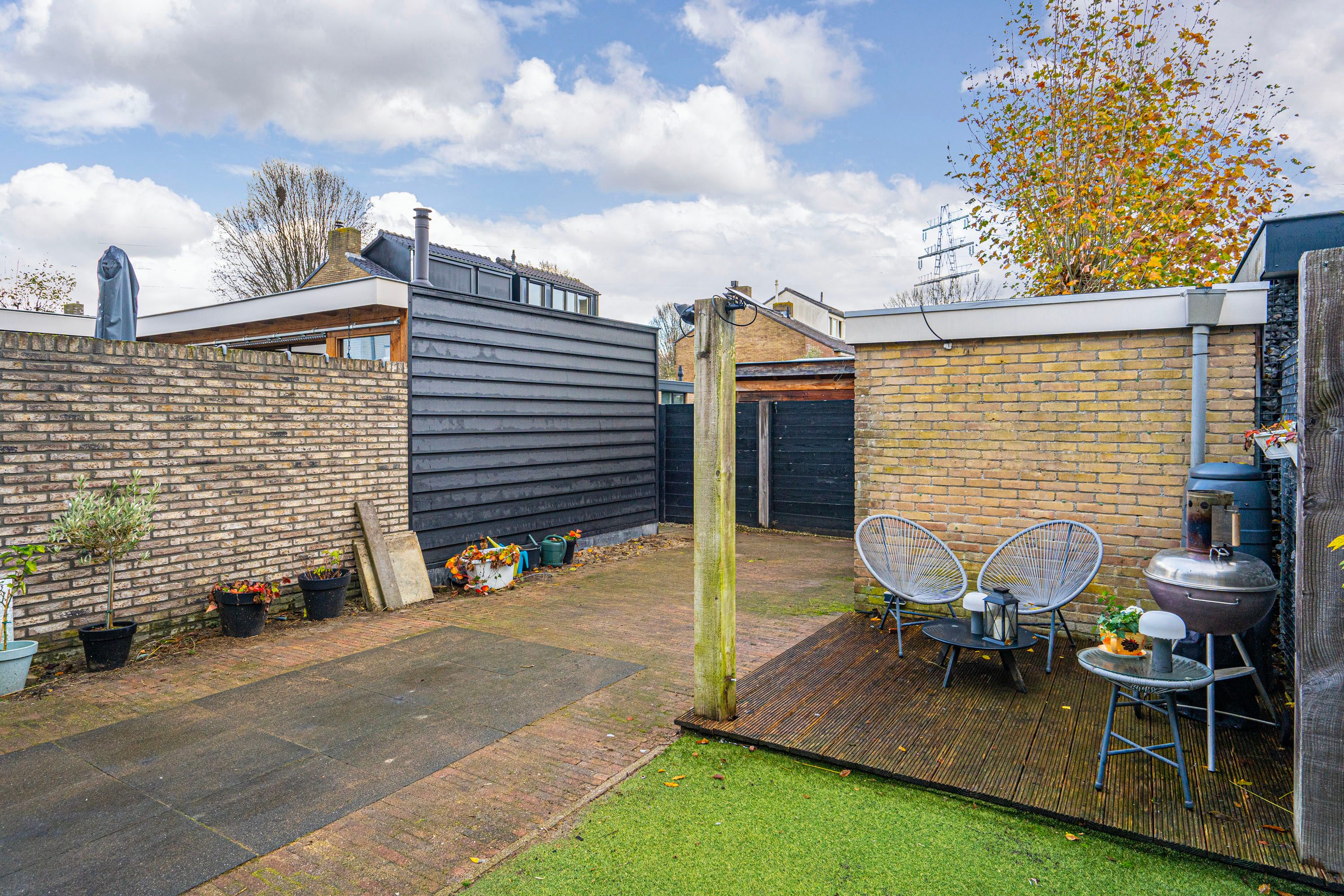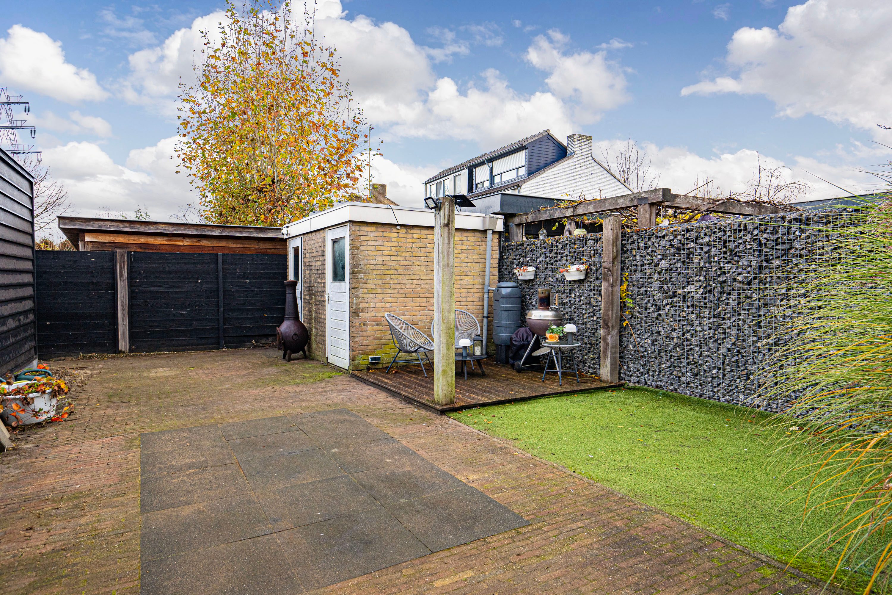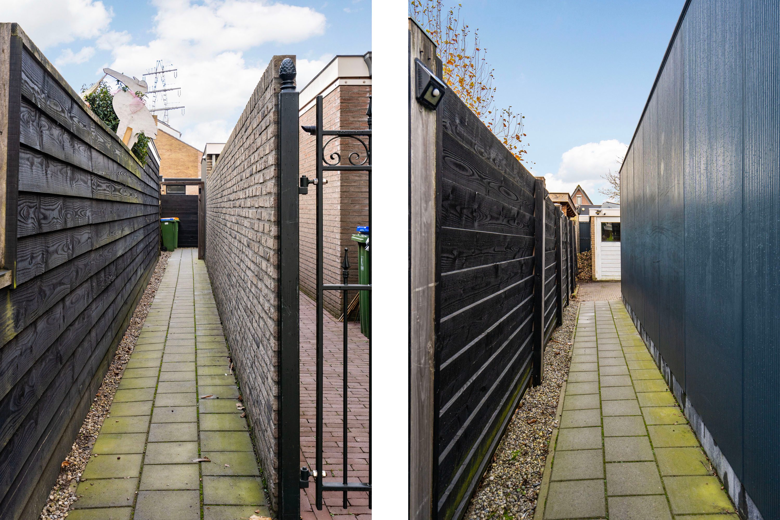 Via de schuifpui in de woonkamer en de keuken is de ruime achtertuin op het noorden bereikbaar. De tuin biedt voldoende ruimte voor meerdere zitjes en is ideaal om van het buitenleven te genieten. Achterin bevindt zich een stenen berging van ca. 8 m², praktisch voor extra opbergruimte of het stallen van fietsen, met twee toegangsdeuren. De tuin is daarnaast via een achterom bereikbaar, en via een trap in de tuin is ook het souterrain toegankelijk. De op het zuiden gelegen voortuin ligt iets terug van de straat, wat zorgt voor extra privacy, terwijl het zonnescherm het mogelijk maakt om ook op warme dagen comfortabel in de woonkamer te zitten.