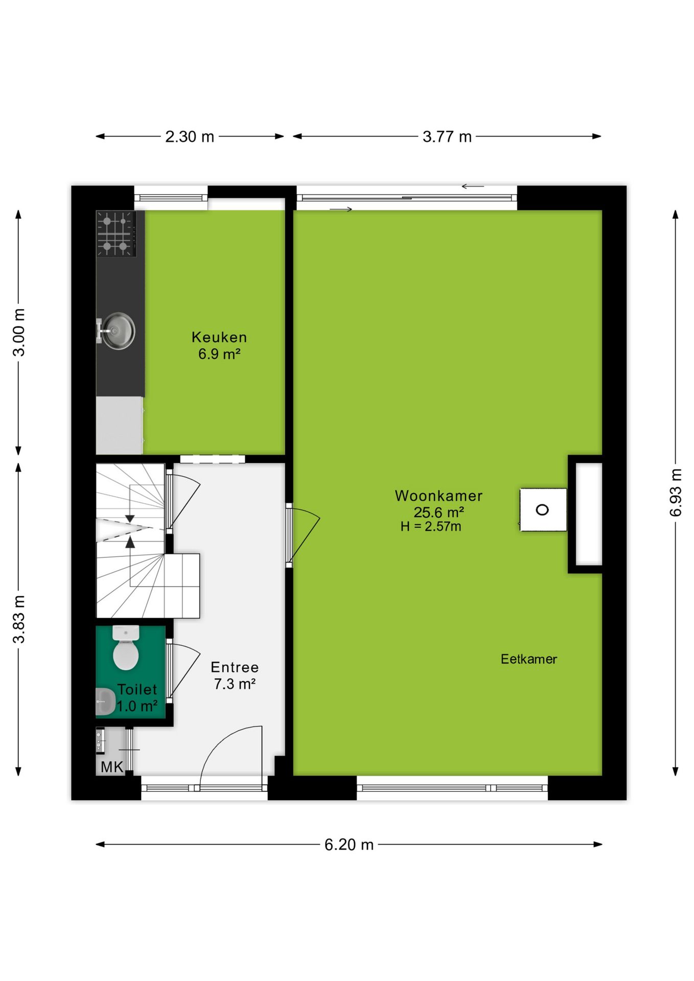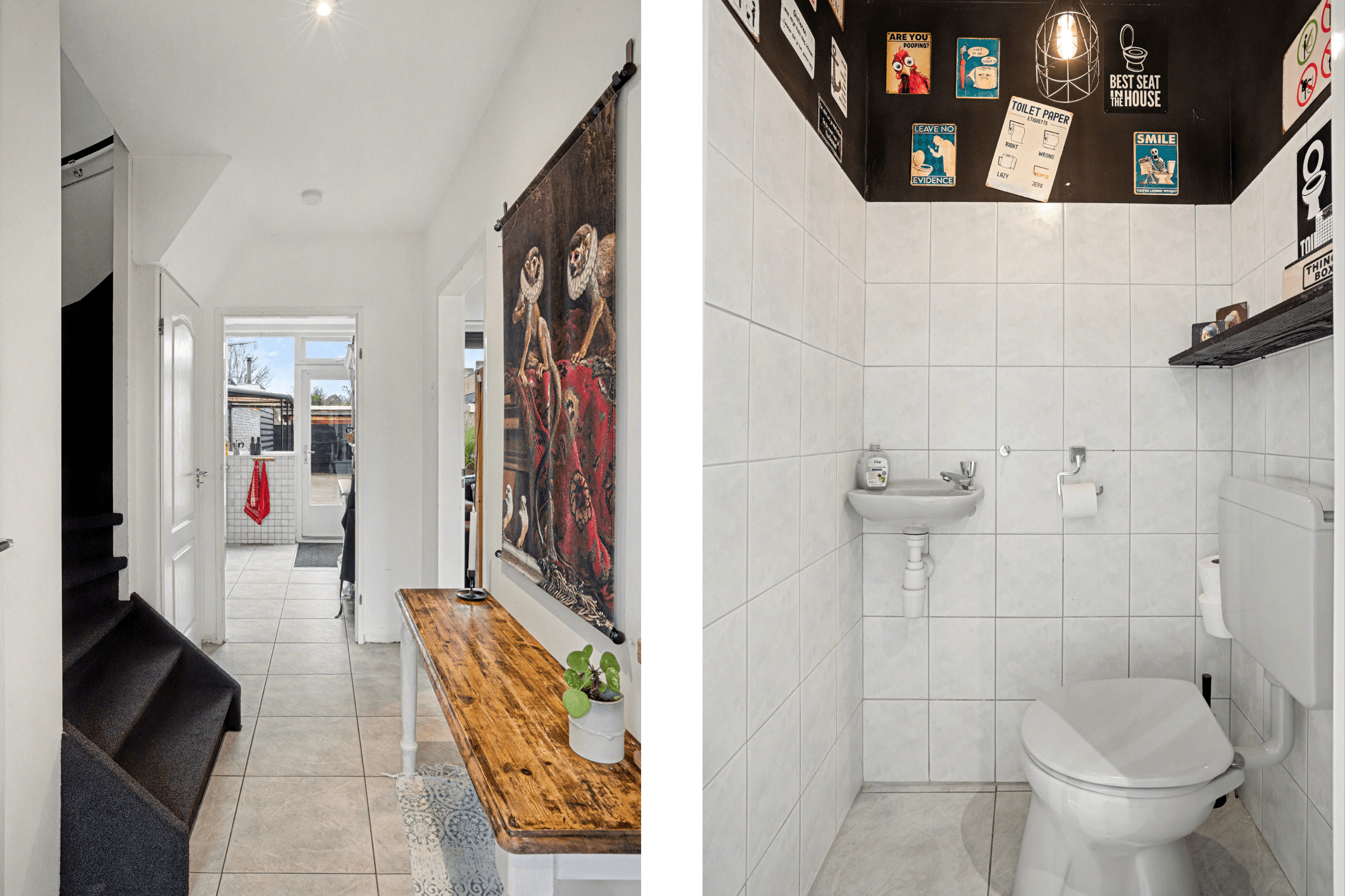 Bij binnenkomst in de hal tref je de meterkast en het toilet. Vanuit hier loop je door naar de lichte, open woonkamer. Dankzij de grote raampartijen en de schuifpui voelt deze ruimte heerlijk ruim aan. Je kunt er gemakkelijk zowel een comfortabele zithoek als een gezellige eethoek creëren.