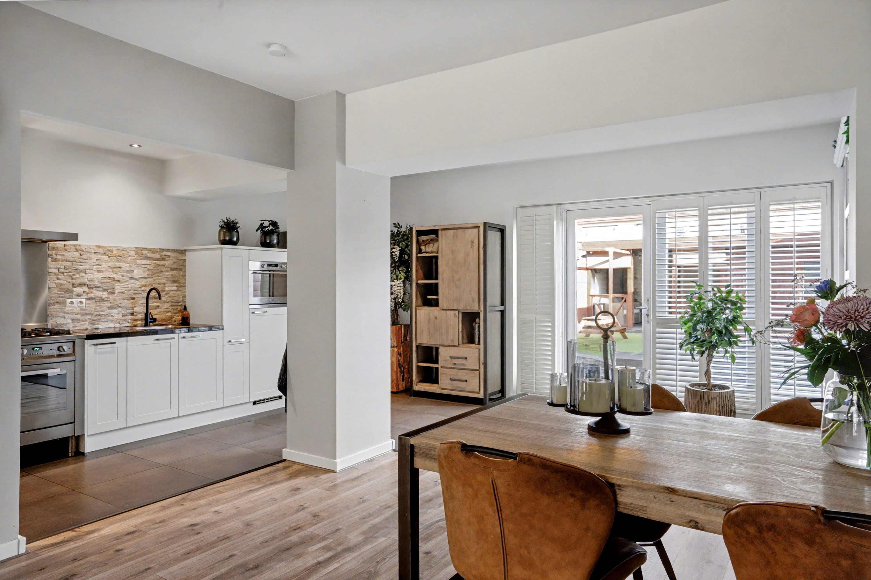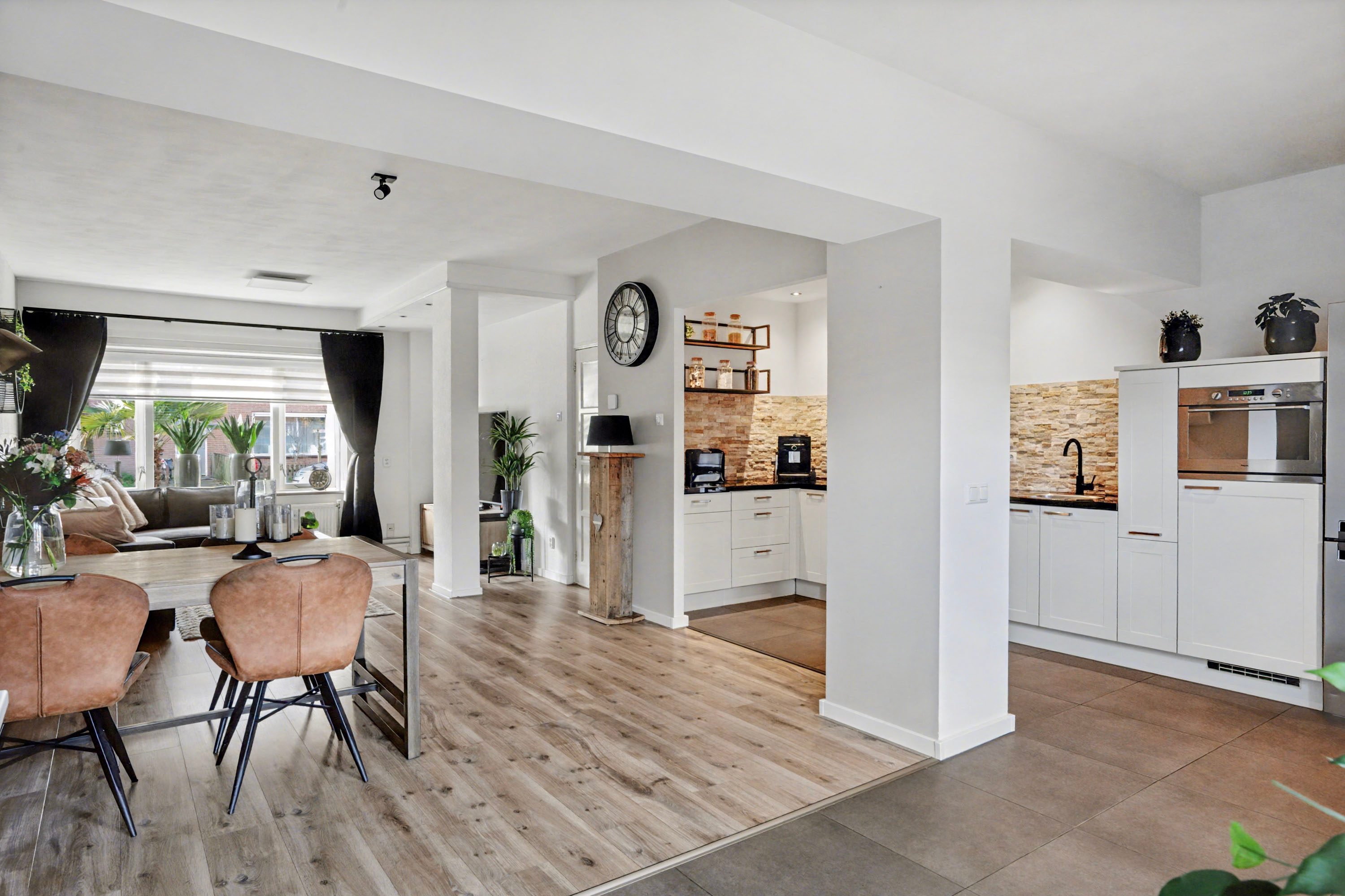 In de uitgebouwde woonkamer valt direct de ruimte en het vele daglicht op. Er is voldoende plaats voor zowel een fijne zithoek als een ruime eethoek. Onder de tegelvloer in de uitbouw en de keuken ligt vloerverwarming.