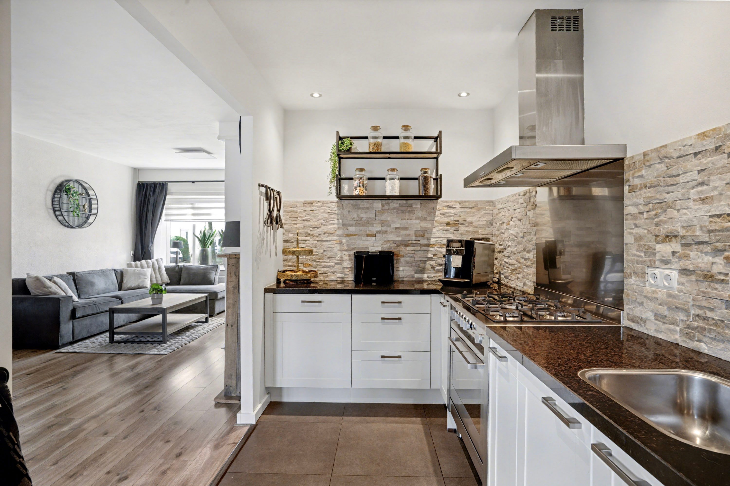 De open keuken heeft een hoekopstelling en is voorzien van diverse inbouwapparatuur, waaronder een afzuigkap, combi-oven, koelkast en vaatwasser. Via de openslaande deuren loop je zo de tuin in gelegen op het oosten.
