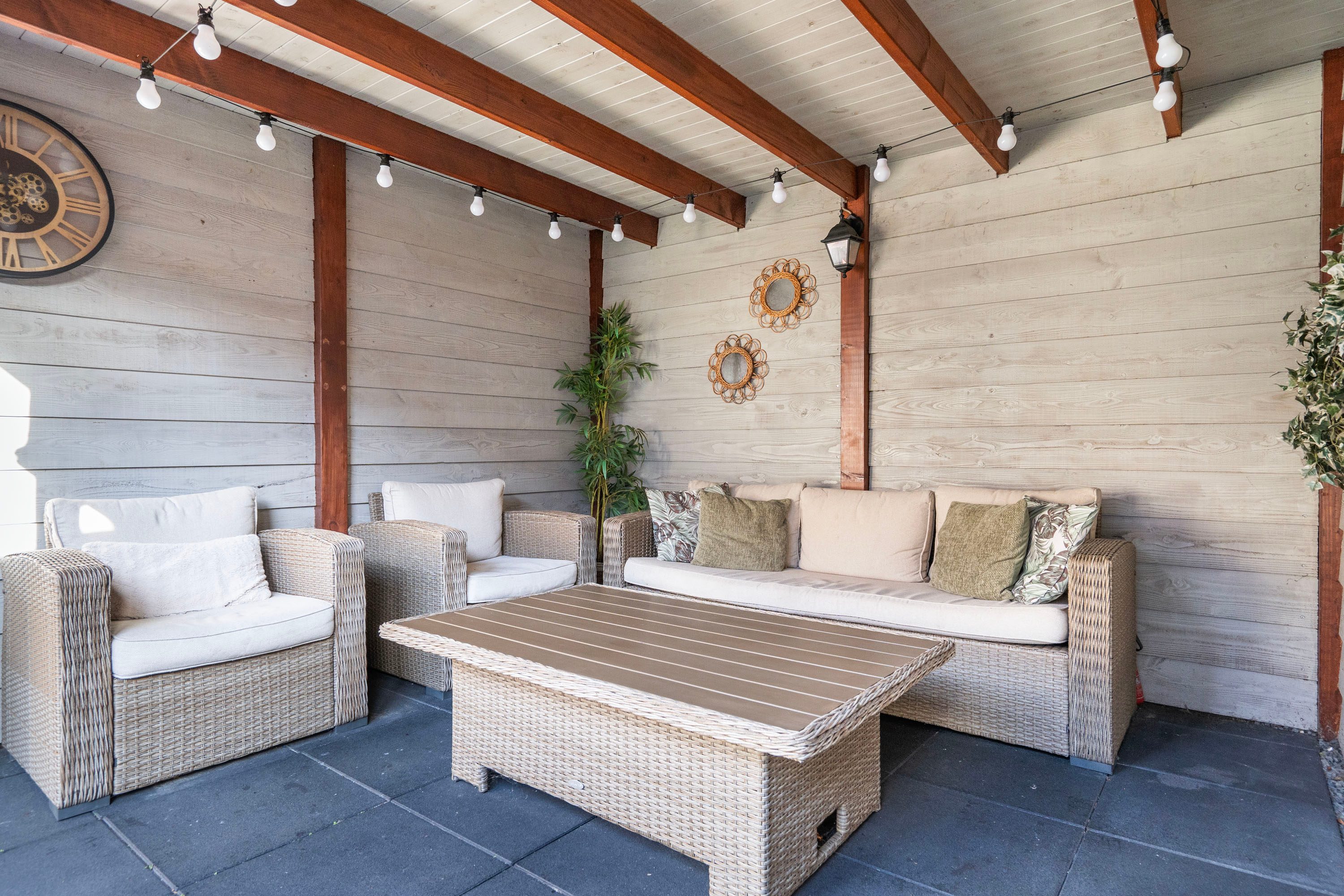 Via de openslaande deuren in de woonkamer stap je de onderhoudsvriendelijke achtertuin op het oosten in. De tuin beschikt over twee houten bergingen voor veel opbergruimte. Je kunt hier heerlijk zitten onder de veranda of in het sfeervolle zitje tussen de bloembakken.
