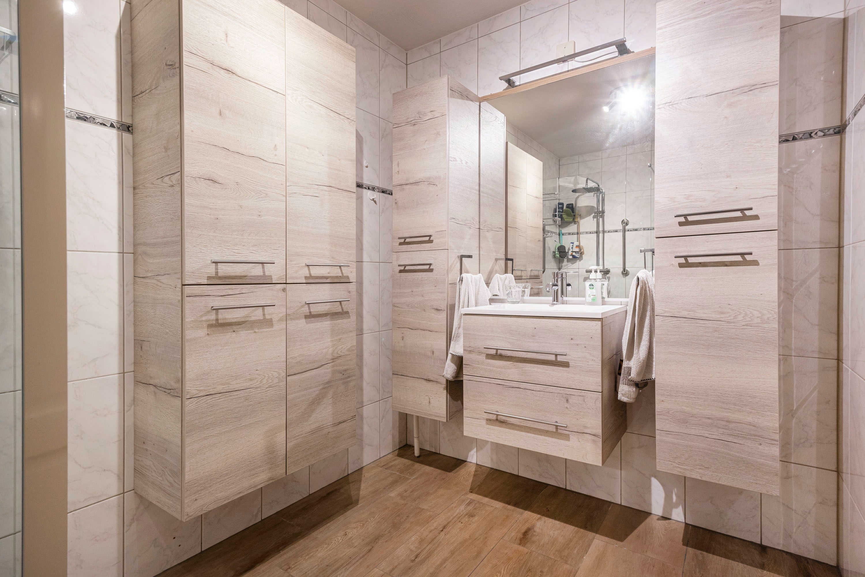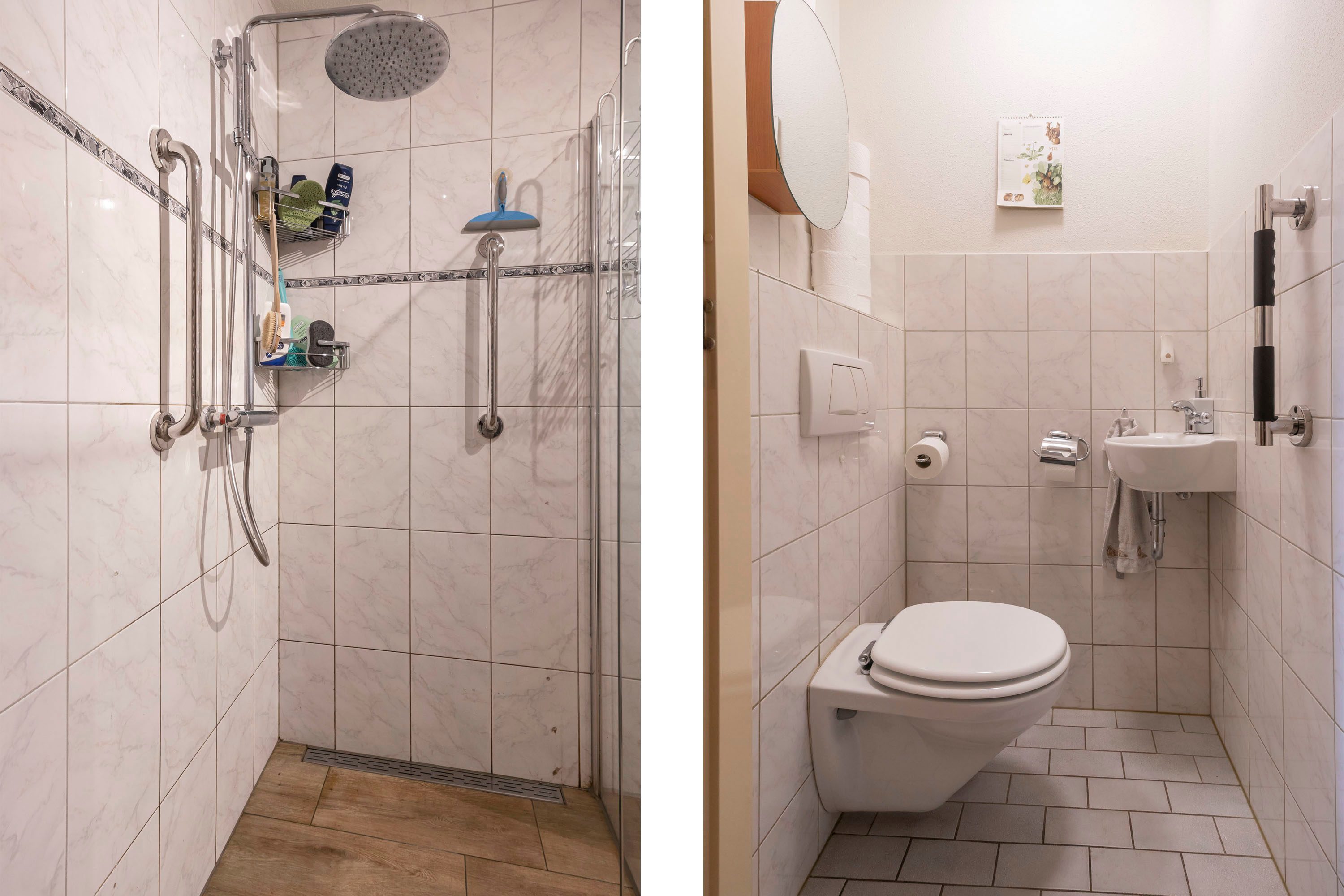 De ruime fraaie badkamer is volledig betegeld en beschikt over een wastafelmeubel met spiegel, Verder is er een seperaat toilet en ruime inloopdouche douche voorzien van faciliteiten ter ondersteuning.