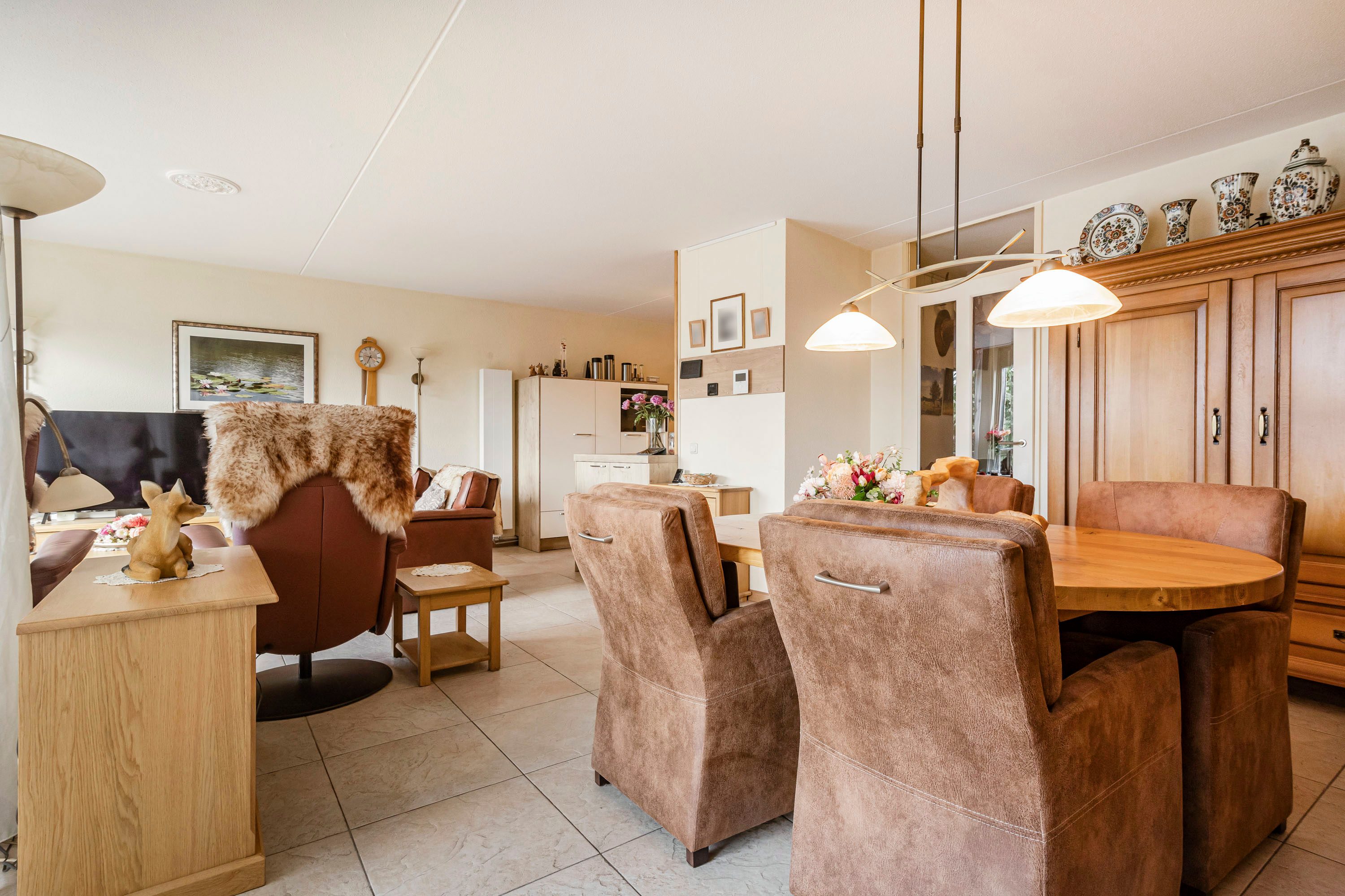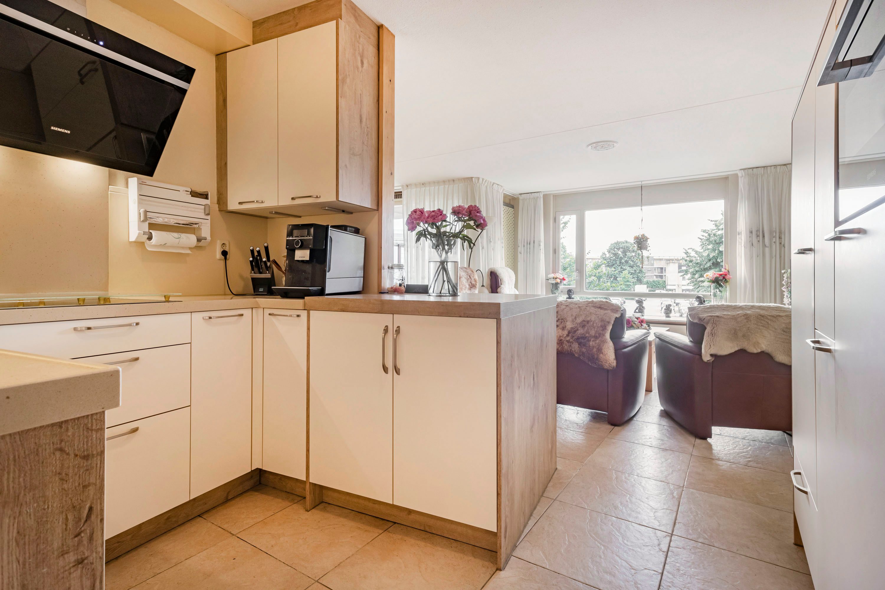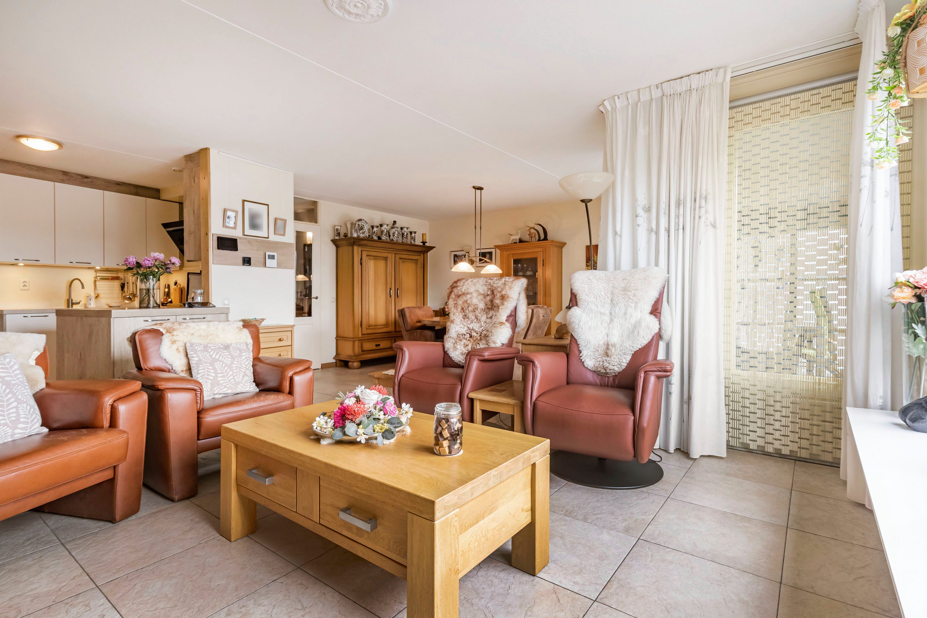 Zowel de woonkamer als keuken beschikken over een lichte plavuizenvloer.