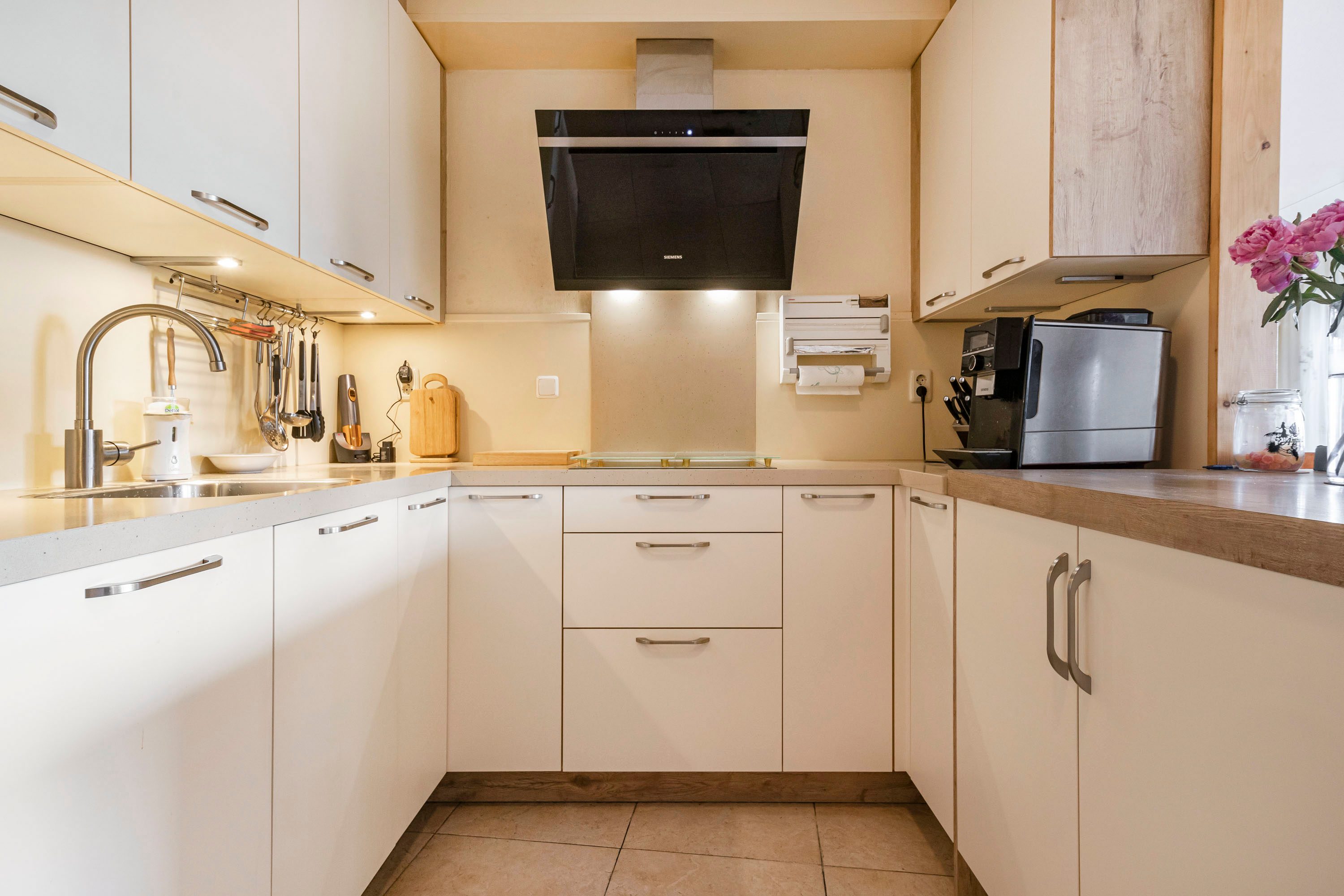 Vanuit de woonkamer is de open keuken te bereiken. De keuken beschikt over een in lichte kleurstelling uitgevoerde inbouwkeuken die in U-opstelling is geplaatst.