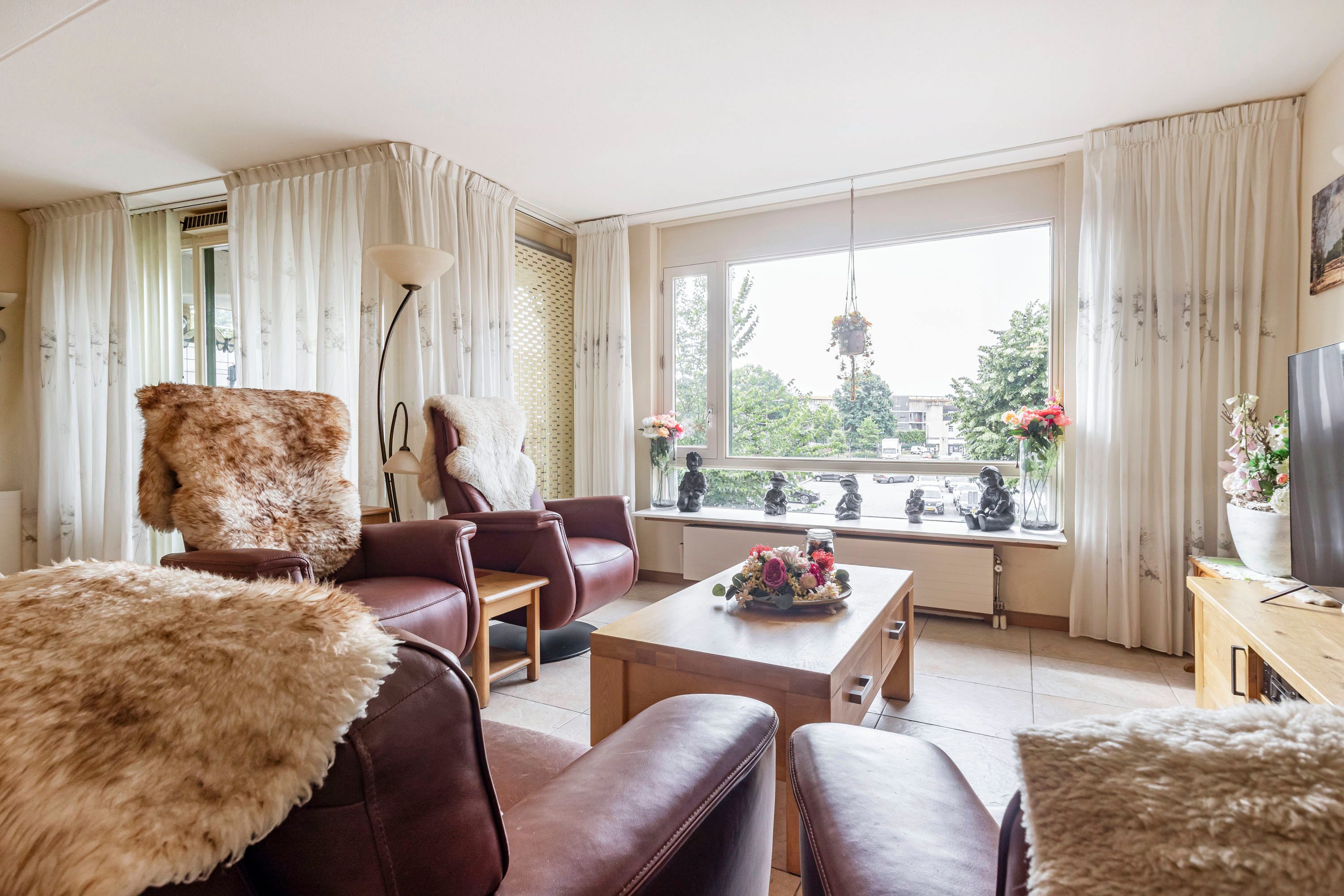 De woonkamer is een fijne lichte ruimte door de grote raampartijen en praktisch in te delen. Vanuit hier heb je direct toegang tot het overdekte balkon op het zuidoosten. Zowel vanuit de woonkamer als het balkon heb je een fraai uitzicht over het centrum van Ede.
