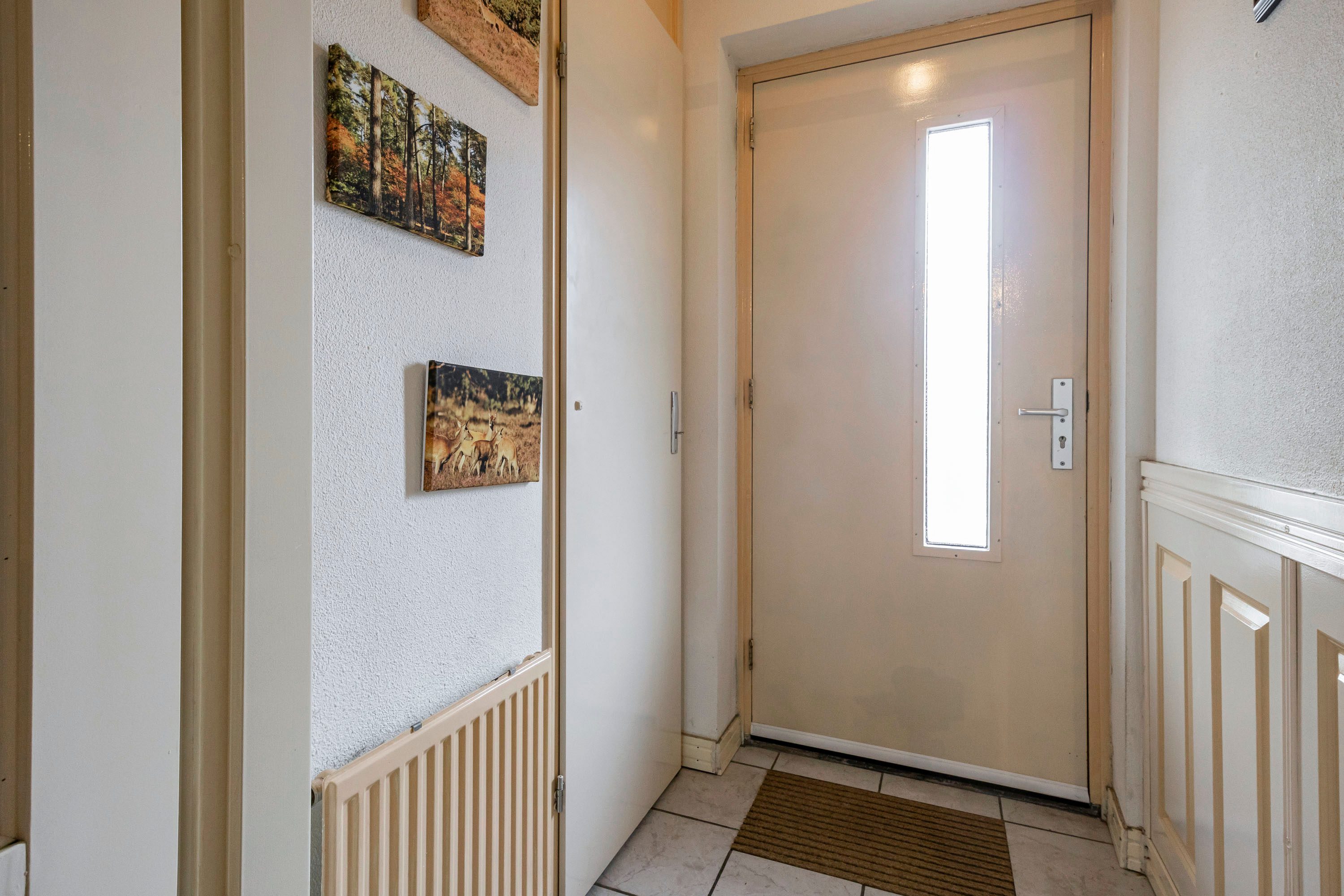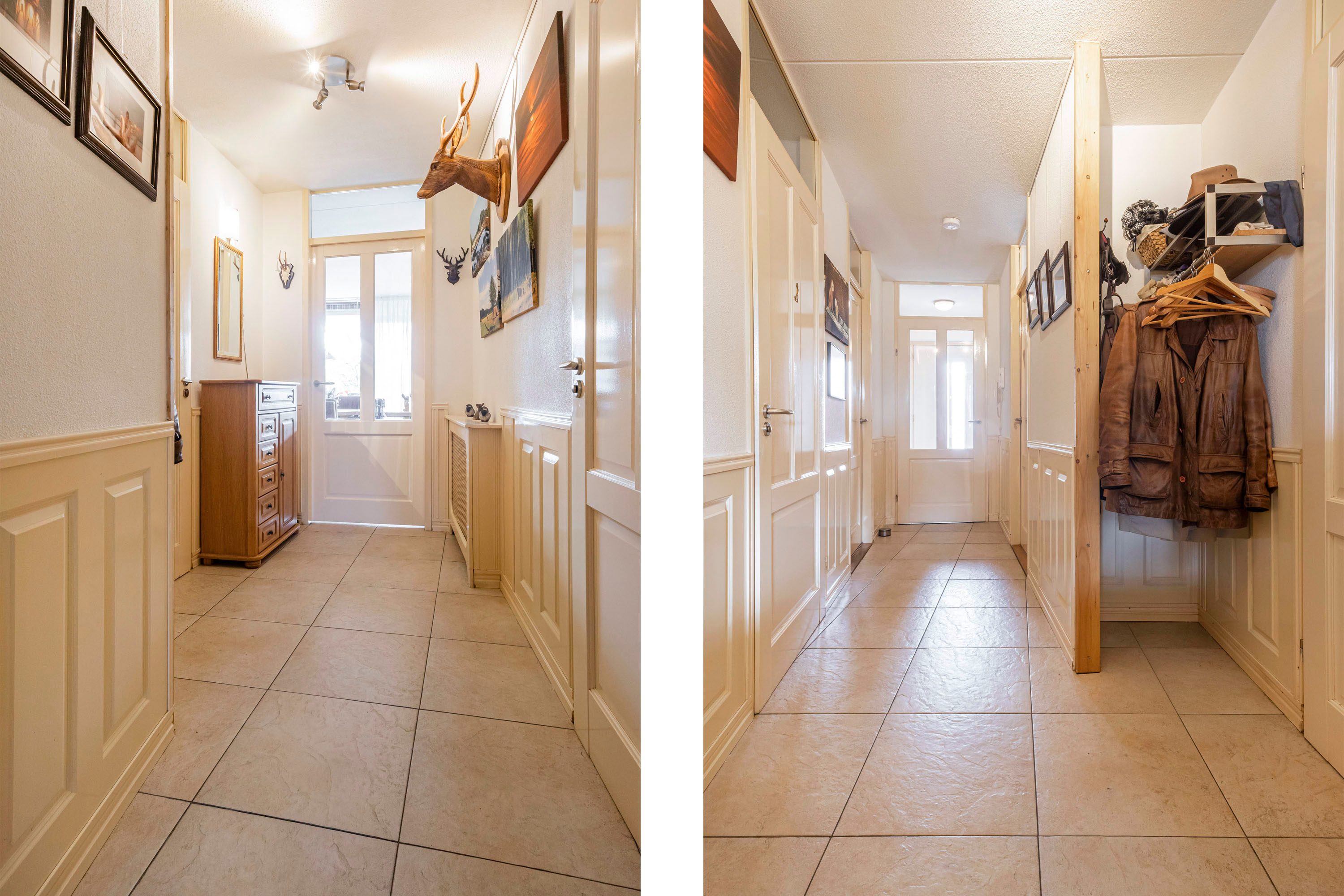 Vanaf de galerij geeft de voordeur toegang tot de hal van het appartement, vanuit deze ruimte zijn alle vertrekken toegankelijk.