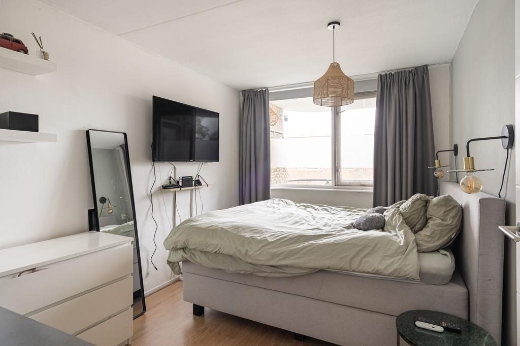 Vanuit de woonkamer of via de badkamer heb je toegang tot de tweede slaapkamer. Dit is het grootste slaapvertrek van het appartement, met een oppervlakte van circa 12m².