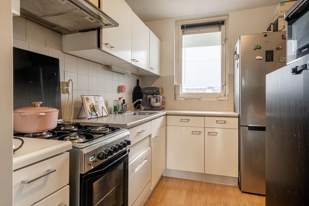 Bij binnenkomst in de leefruimte trekt het natuurlijke licht onmiddellijk de aandacht. Het is een ideale plek om te ontspannen op de bank of gezellig te tafelen. De direct aan de woonkamer grenzende open keuken is opgesteld in een hoekopstelling en beschikt over veel opbergruimte.