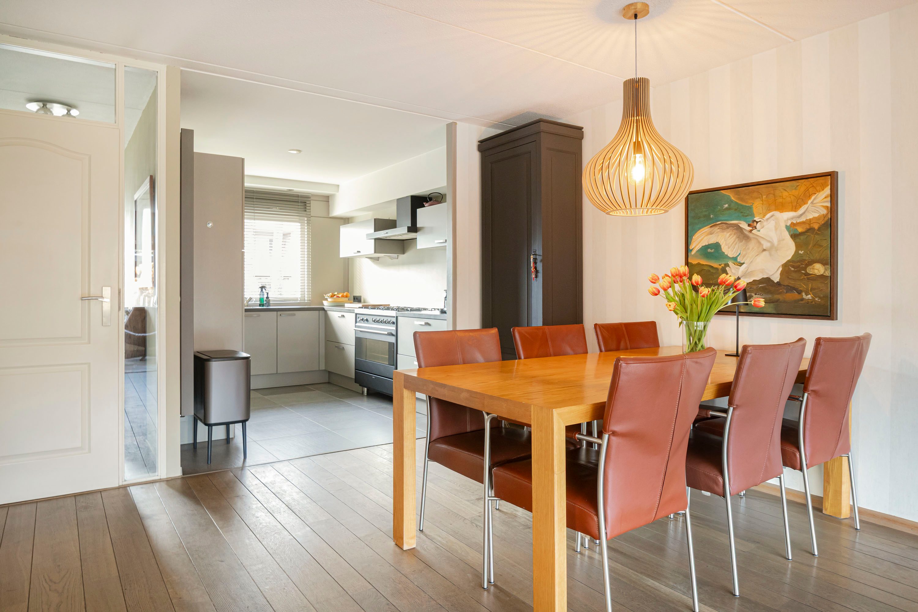 Via de hal en entree met meterkast en separaat toilet is de woonkamer te bereiken. De woonkamer heeft een afmeting van maar liefst 46m², is voorzien van heerlijk veel lichtinval en een sfeervolle houten vloer. Door de ruime indeling is er plek genoeg voor een grote eettafel en ontstaat er een gezellig verbinding tussen de woonkamer en de keuken. De keuken heeft een moderne kleurstelling en beschikt over diverse inbouwapparatuur, waaronder een gasfornuis, afzuigkap, magnetron, oven, koelkast, Quooker en vaatwasser.