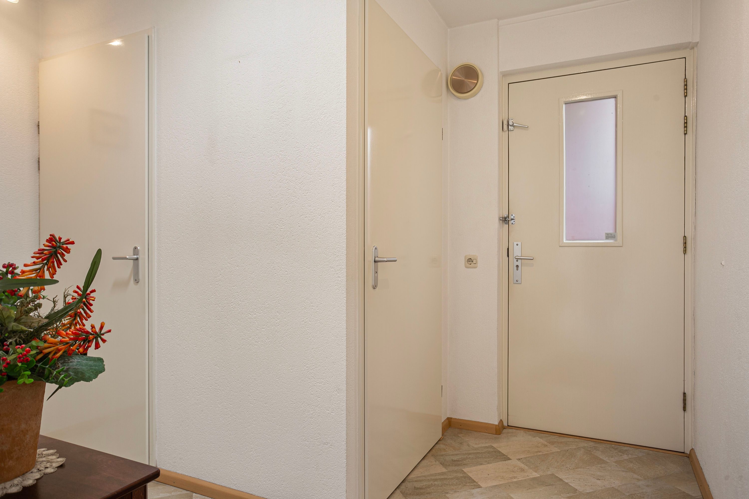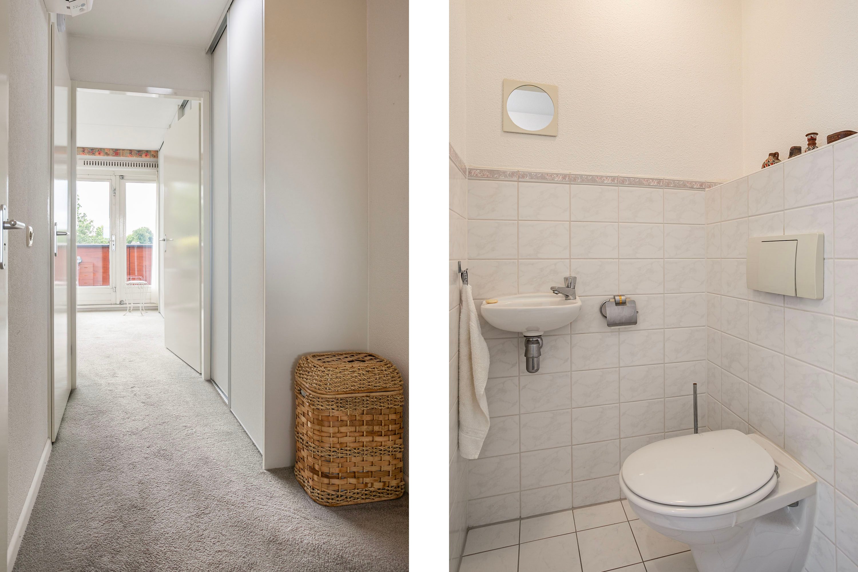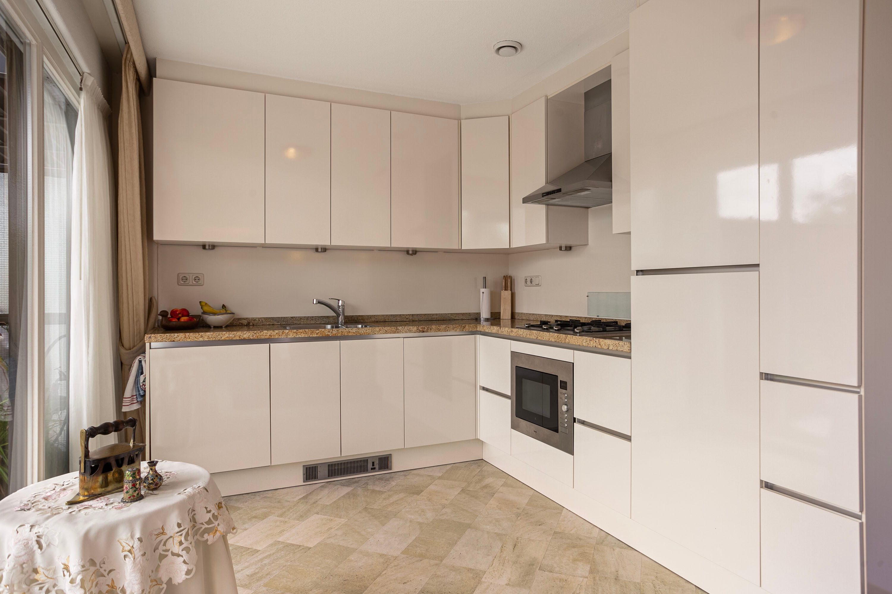 Via de centrale hal betreed je het appartement. Deze ruime entree geeft toegang tot het toilet, de wasruimte met extra berging en een zeer royale woonkamer met veel natuurlijk licht dankzij de grote raampartijen. De woonkamer sluit aan op een nette keuken in hoekopstelling, voorzien van inbouwapparatuur zoals een gasfornuis, afzuigkap, magnetron, koelkast en vaatwasser.