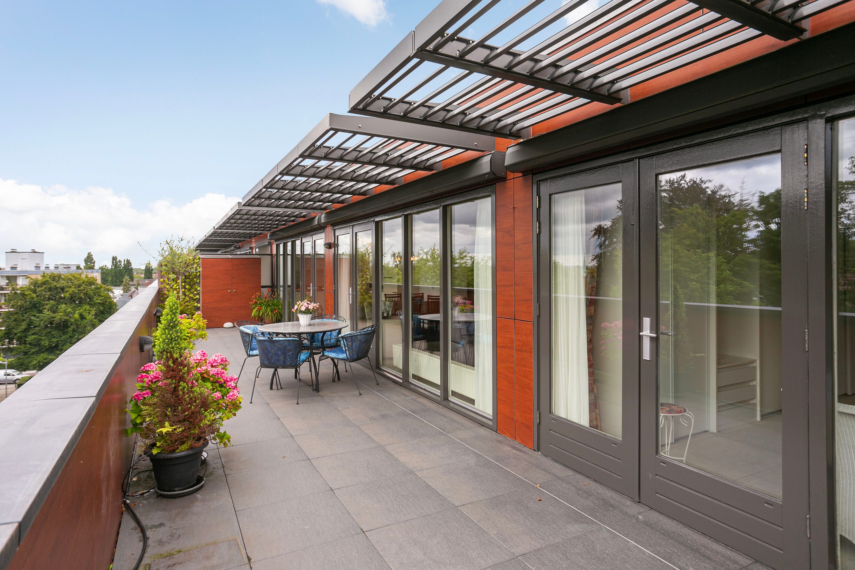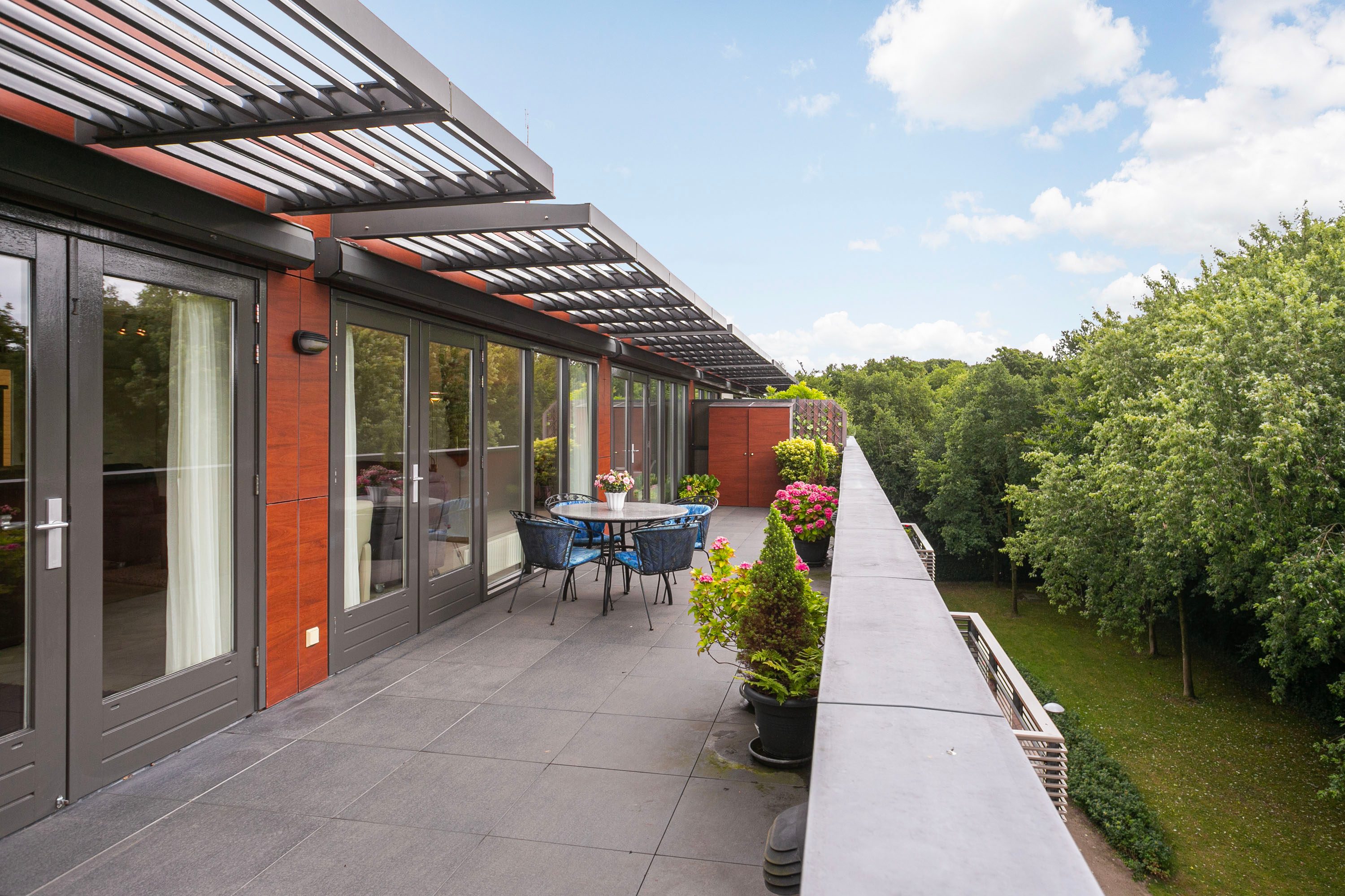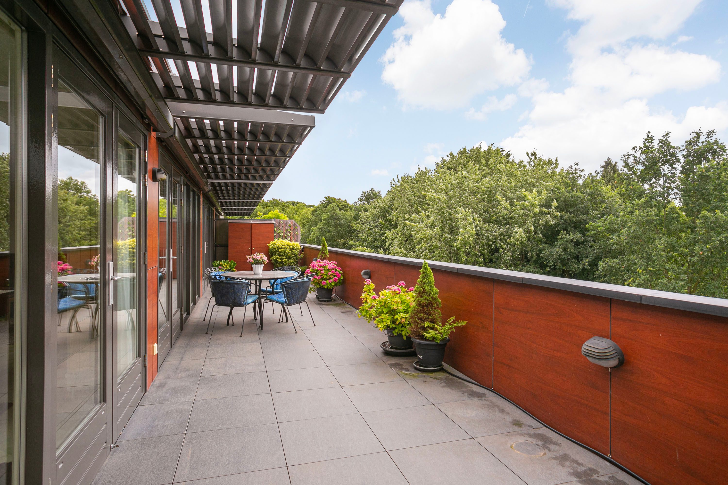 Het riante balkon van maar liefst 42 m² is gelegen op het zuiden en biedt een vrij uitzicht op groen. Een perfecte plek om te genieten van de zon, te borrelen met vrienden of te ontspannen met een goed boek.