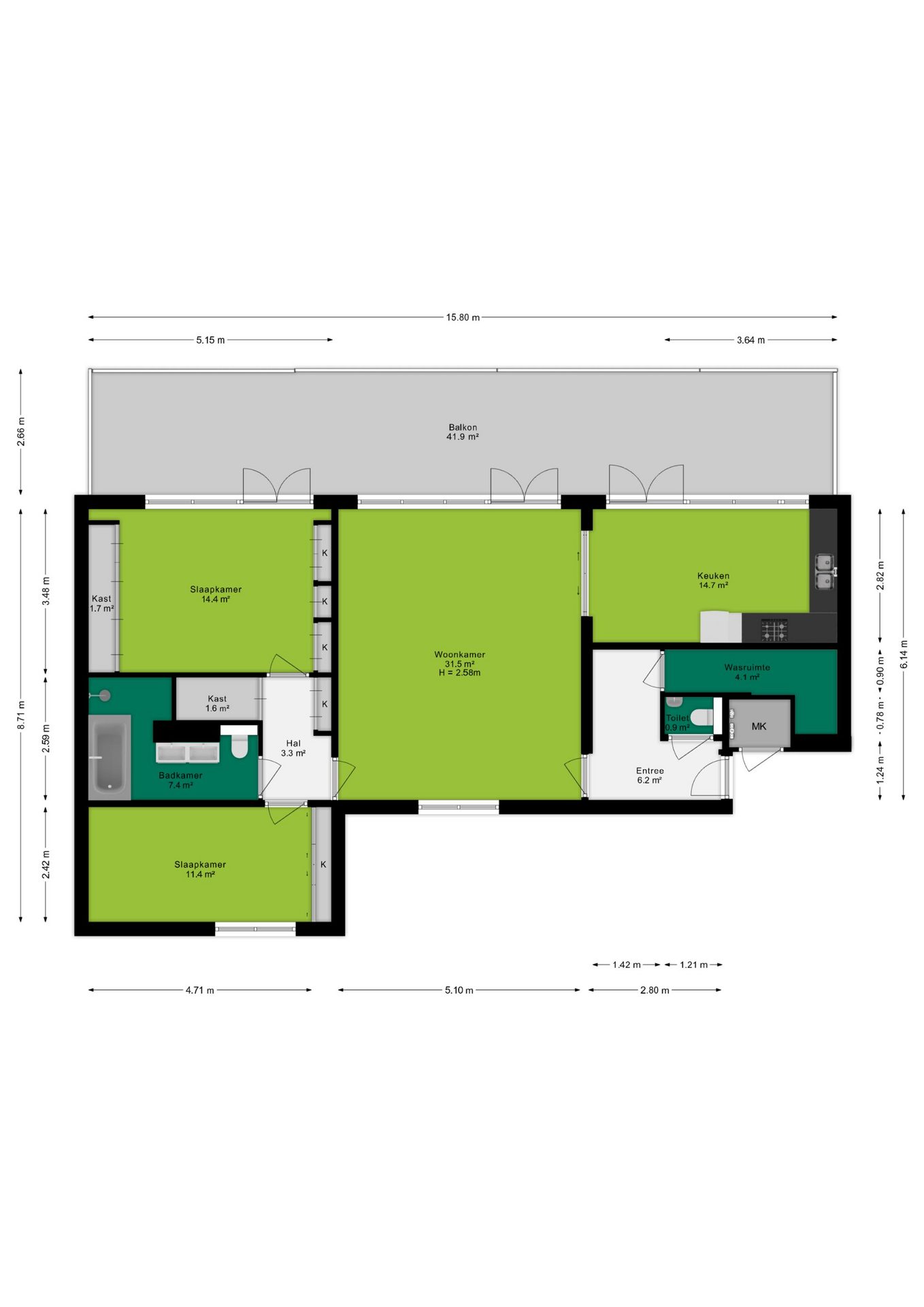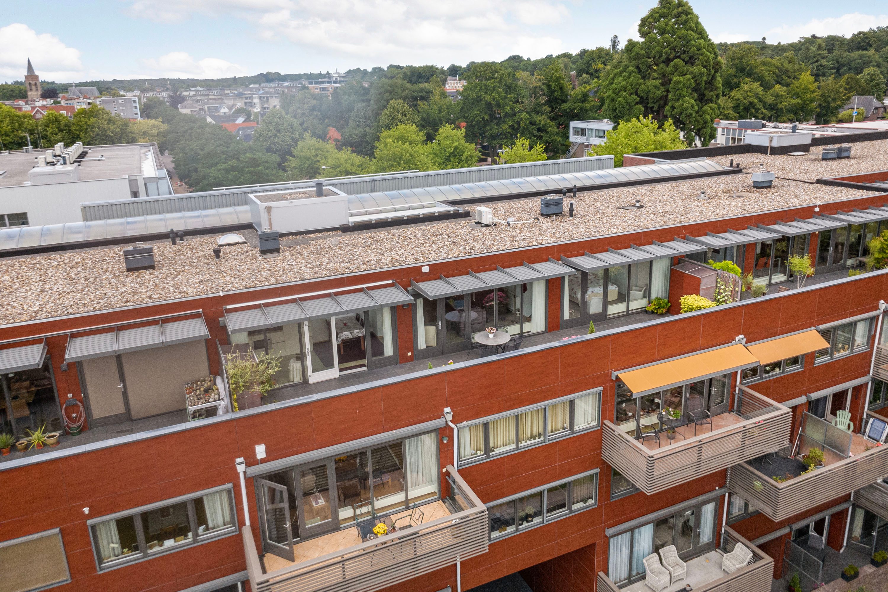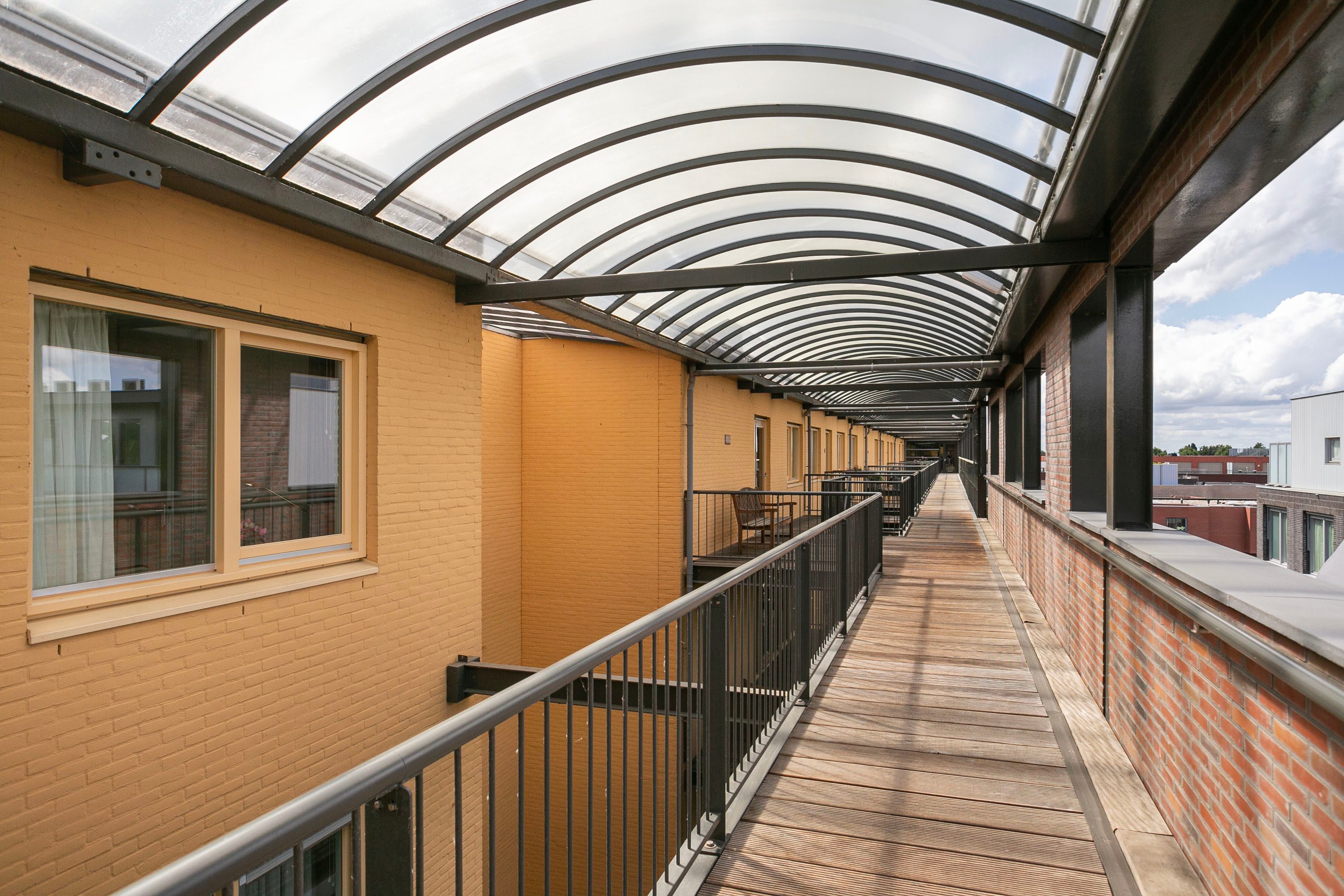 Het riante balkon van maar liefst 42 m² is gelegen op het zuiden en biedt een vrij uitzicht op groen. Een perfecte plek om te genieten van de zon, te borrelen met vrienden of te ontspannen met een goed boek.