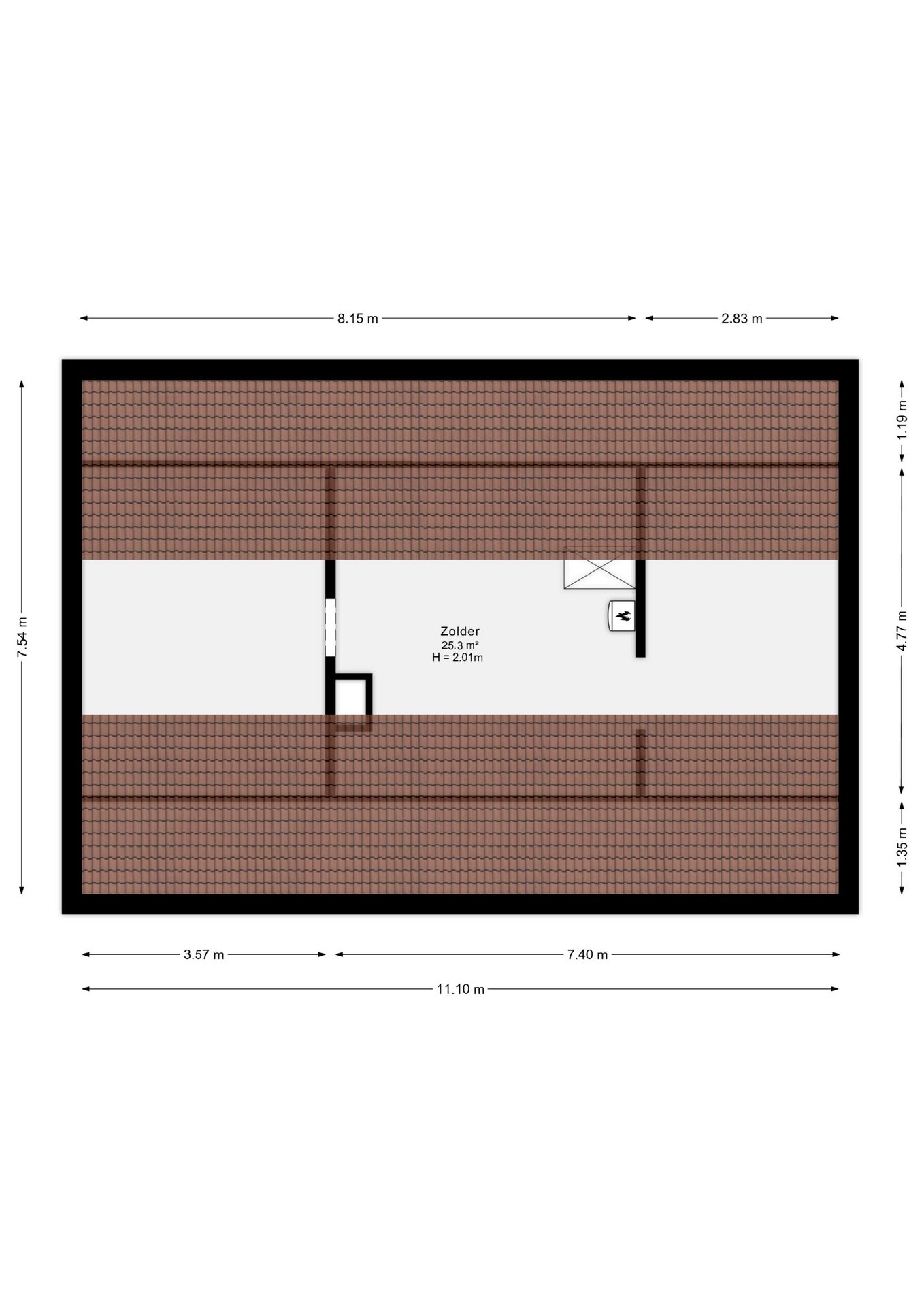 Via een toegangsluik bereik je de ruime bergzolder, die dankzij de stahoogte een praktische toevoeging is voor opslag of andere doeleinden zoals het uitbreiden van de woonoppervlakte. Dit is mogelijk door o.a. het plaatsen van een vaste trap. Het is tevens toegestaan om de achtergevel op te trekken en de nok te verhogen. Deze verbouwing is al uitgevoerd door de buren. Hier bevindt zich tevens de Nefit Cv-ketel.