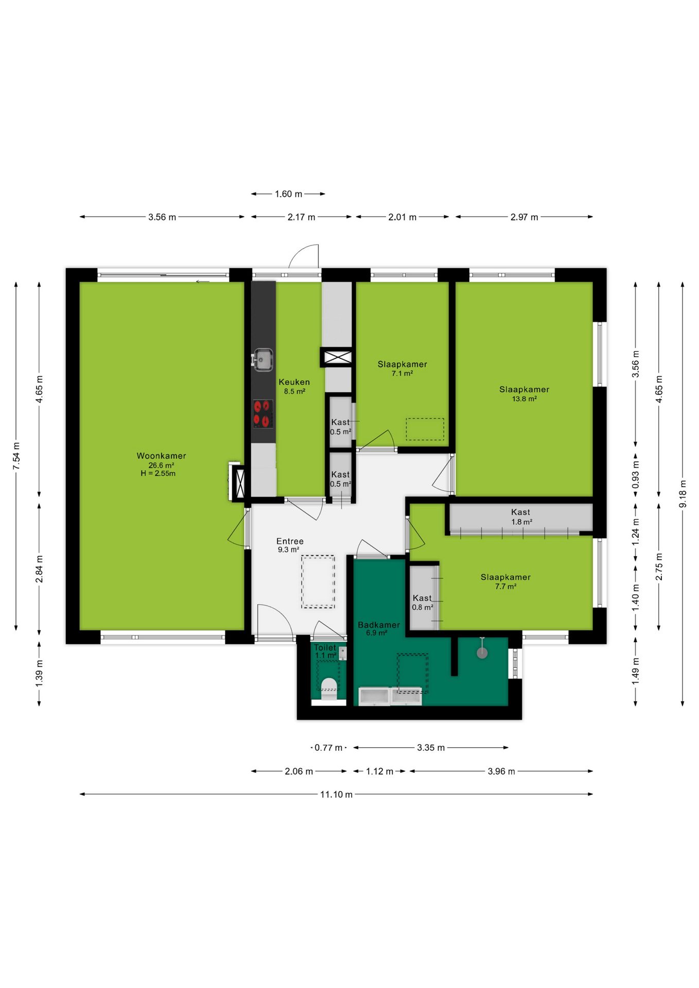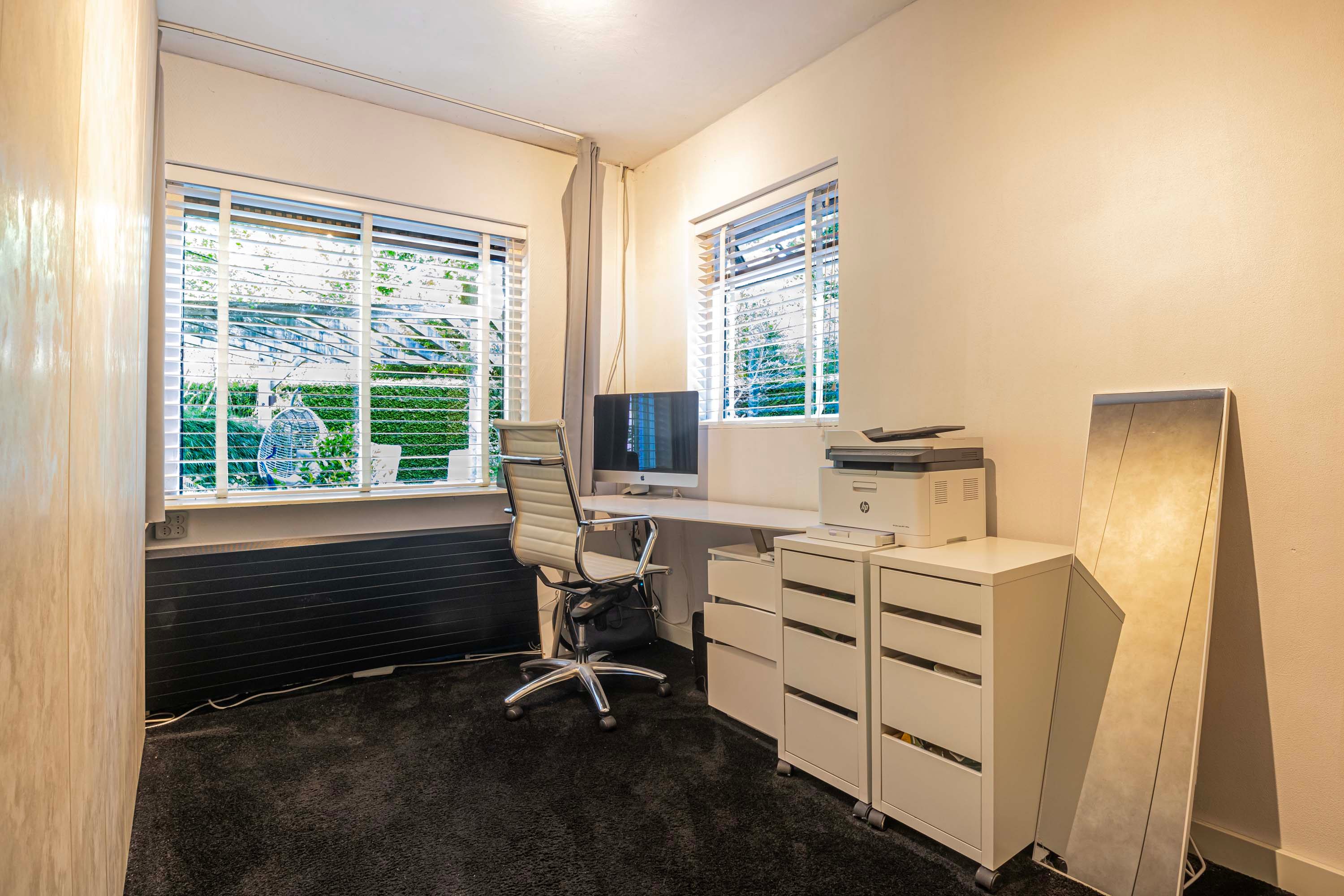 Eenmaal teruggekomen in de hal kom je bij de drie ruime en multifunctionele slaap-/werkkamers op de begane grond. De (slaap)kamers hebben afmetingen van maar liefst circa 13,8, 10,9 en 7,1 m², waarbij de kamer van 10,9 m² voorzien is van mooie inbouwkasten. Ook vanuit de hal bereik je de badkamer, die is voorzien van een ruime inloopdouche, een modern wastafelmeubel met dubbele wastafel en een te openen raam voor natuurlijke ventilatie. Het toilet is separaat en bereikbaar vanuit de hal.