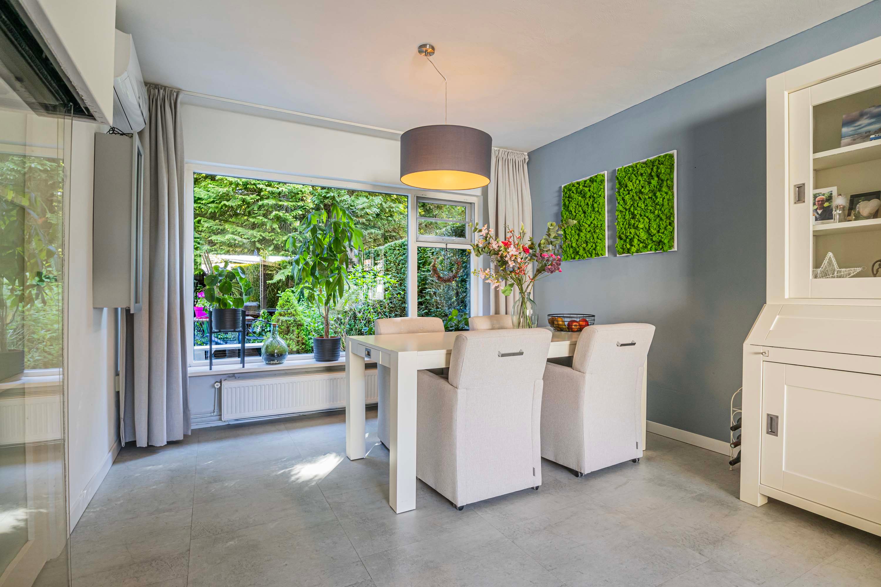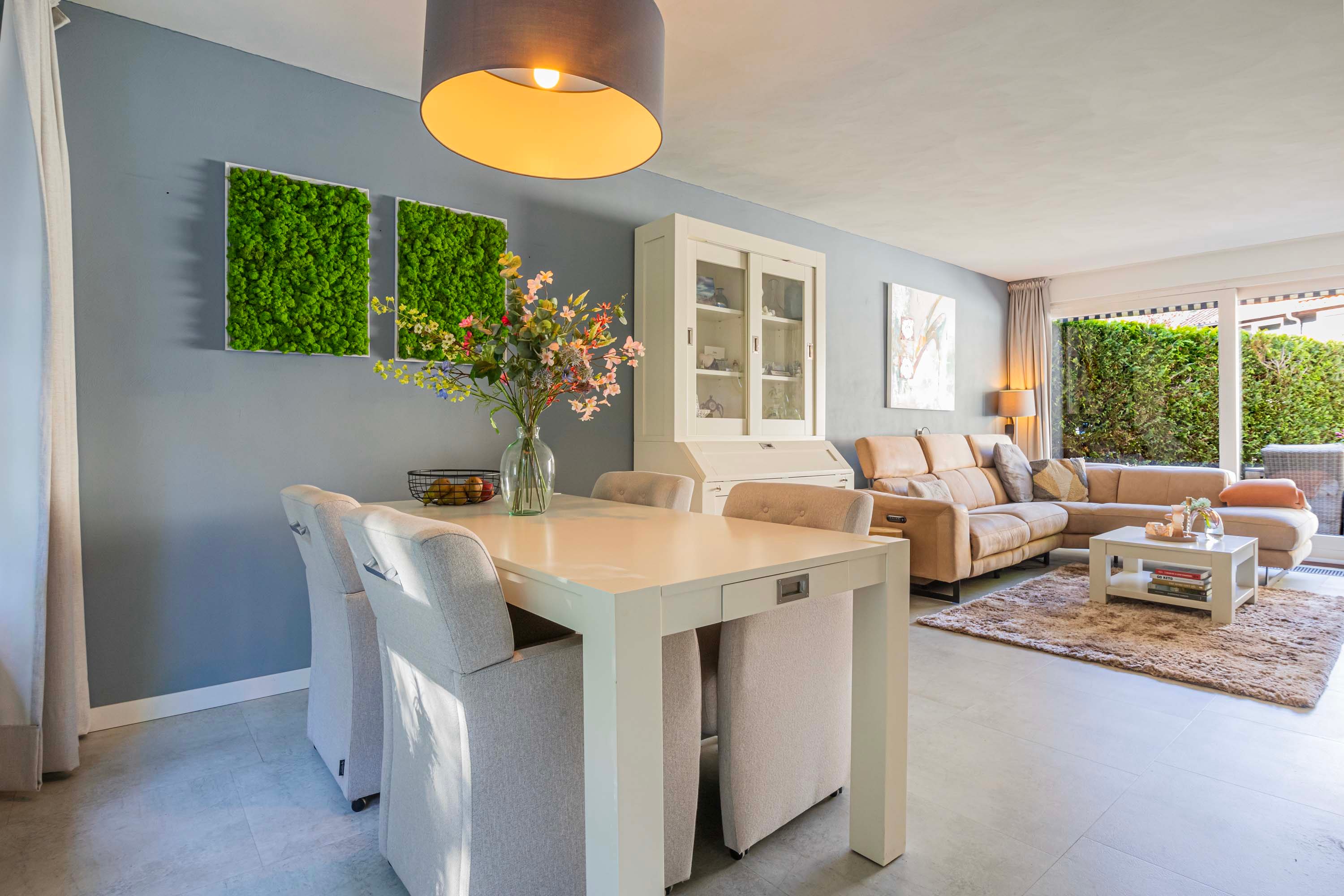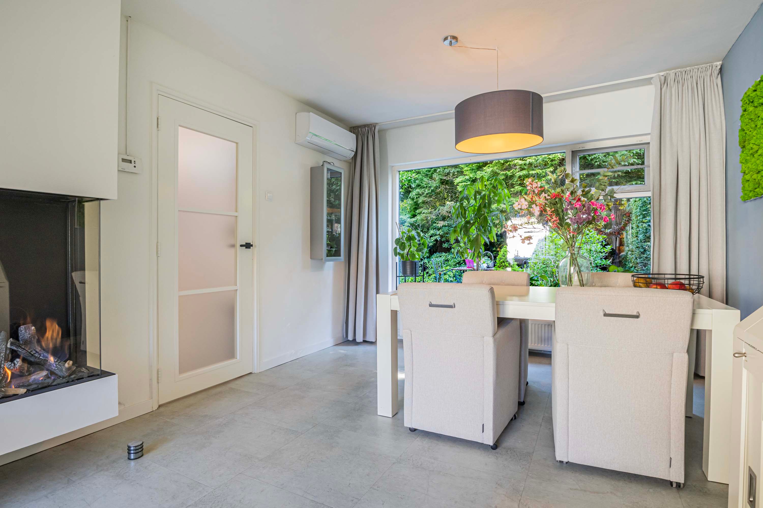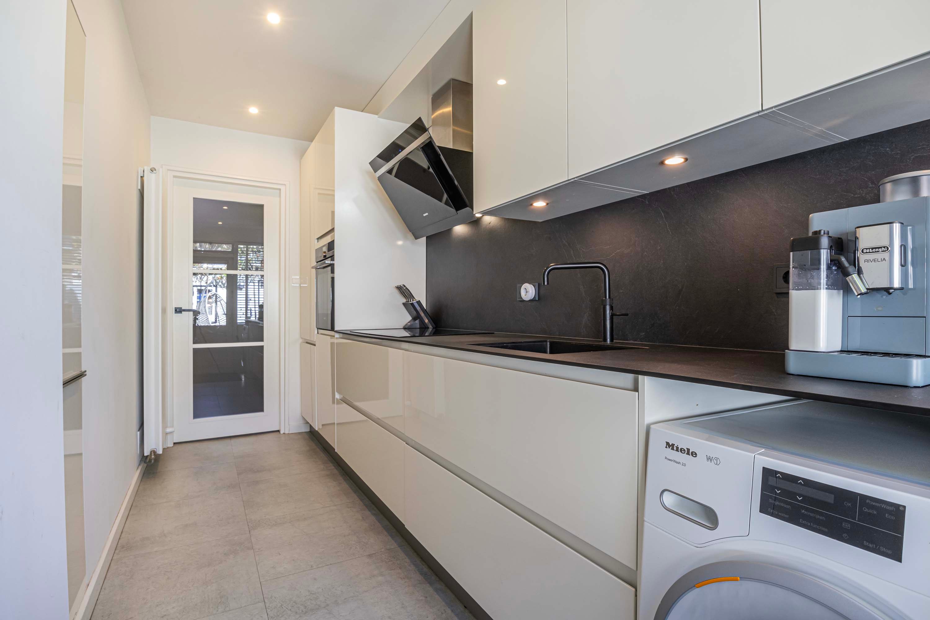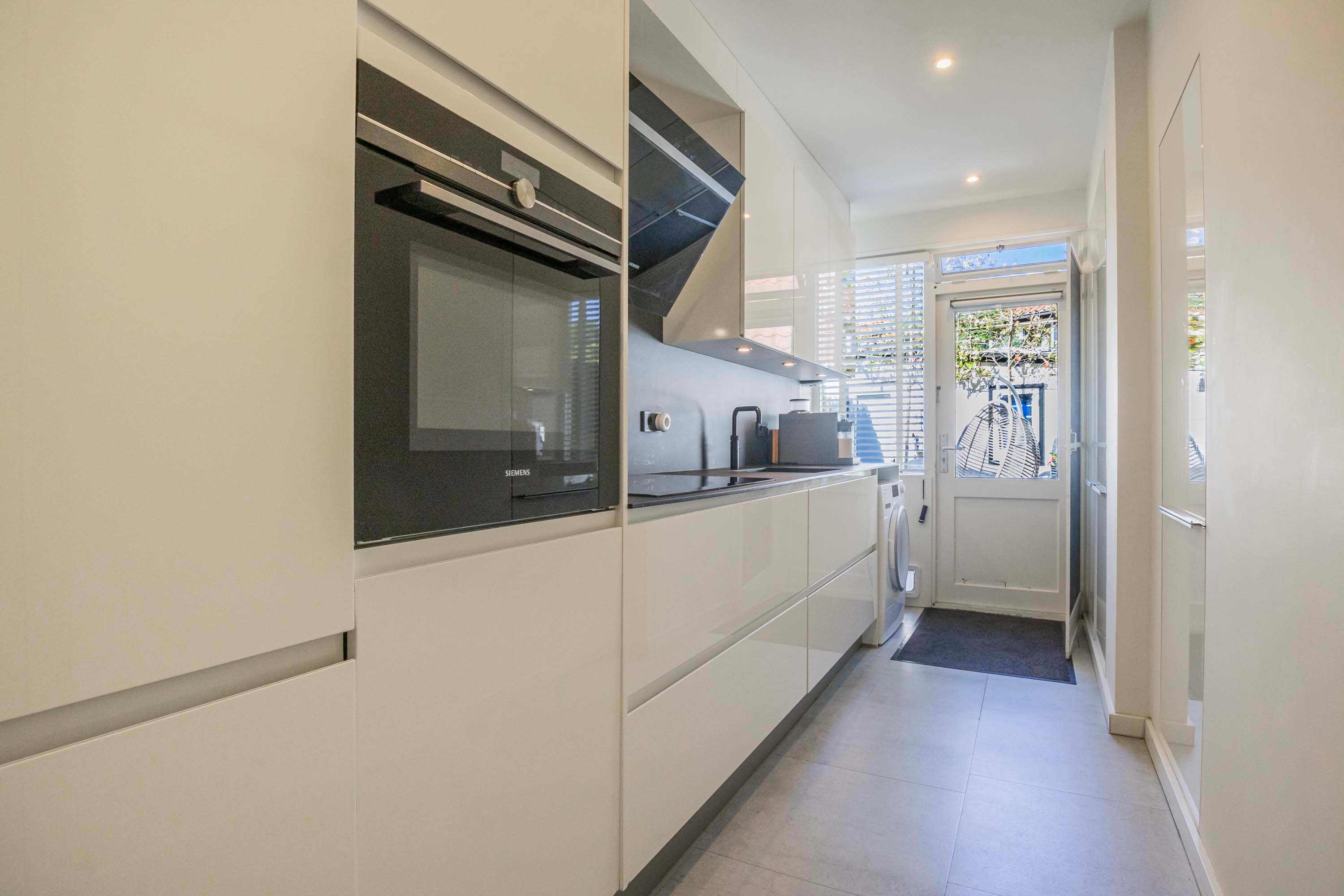De dichte keuken, vernieuwd in 2021, is praktisch en stijlvol ingericht en beschikt over een dun kunststof aanrechtblad. Dit is een ideale plek voor kookliefhebbers, volledig uitgerust met kwalitatieve inbouwapparatuur waaronder een Quooker, inductiekookplaat, afzuigkap, combi-oven, vaatwasser en een ingebouwde koel-vriescombinatie. De keuken biedt bovendien directe toegang tot de tuin via de achterdeur. Hier bevindt zich tevens de aansluiting voor de wasmachine.
