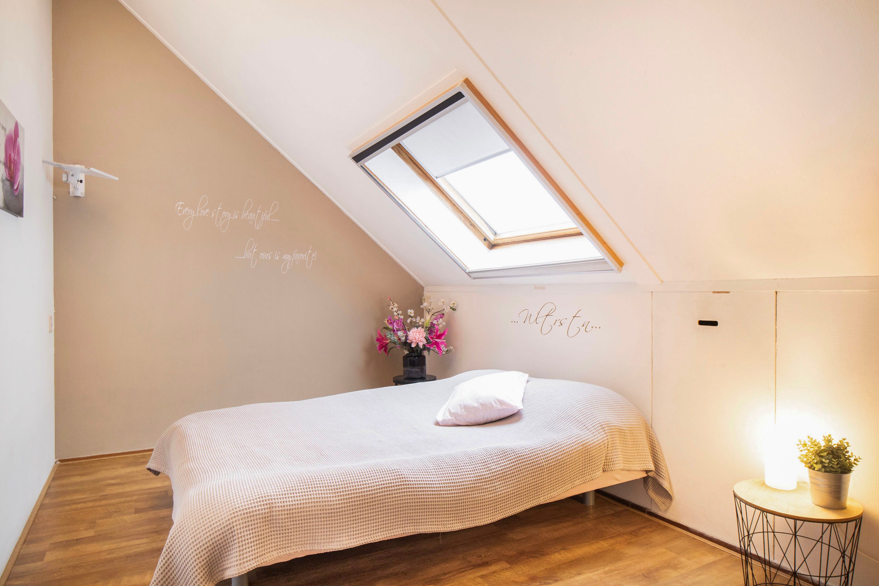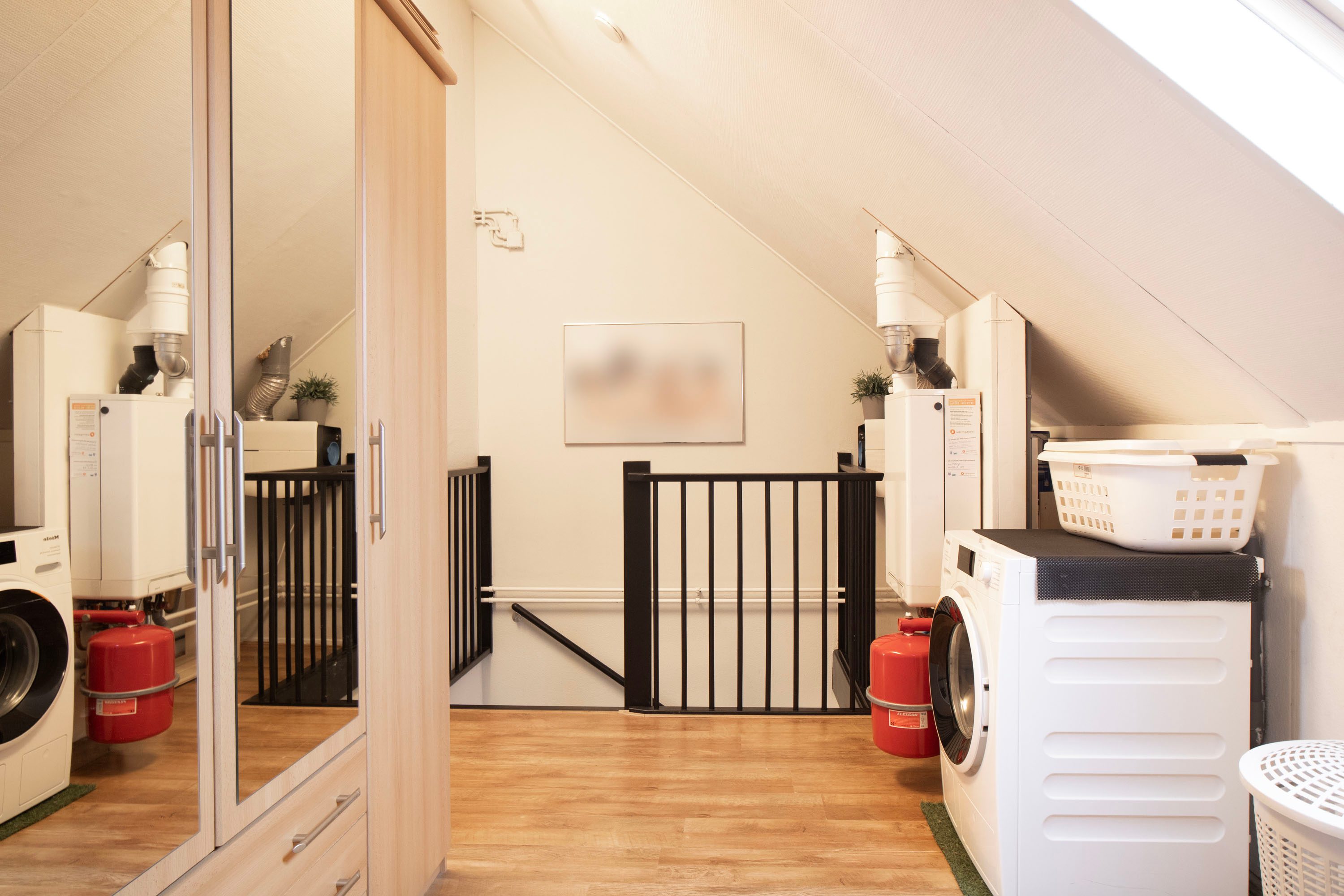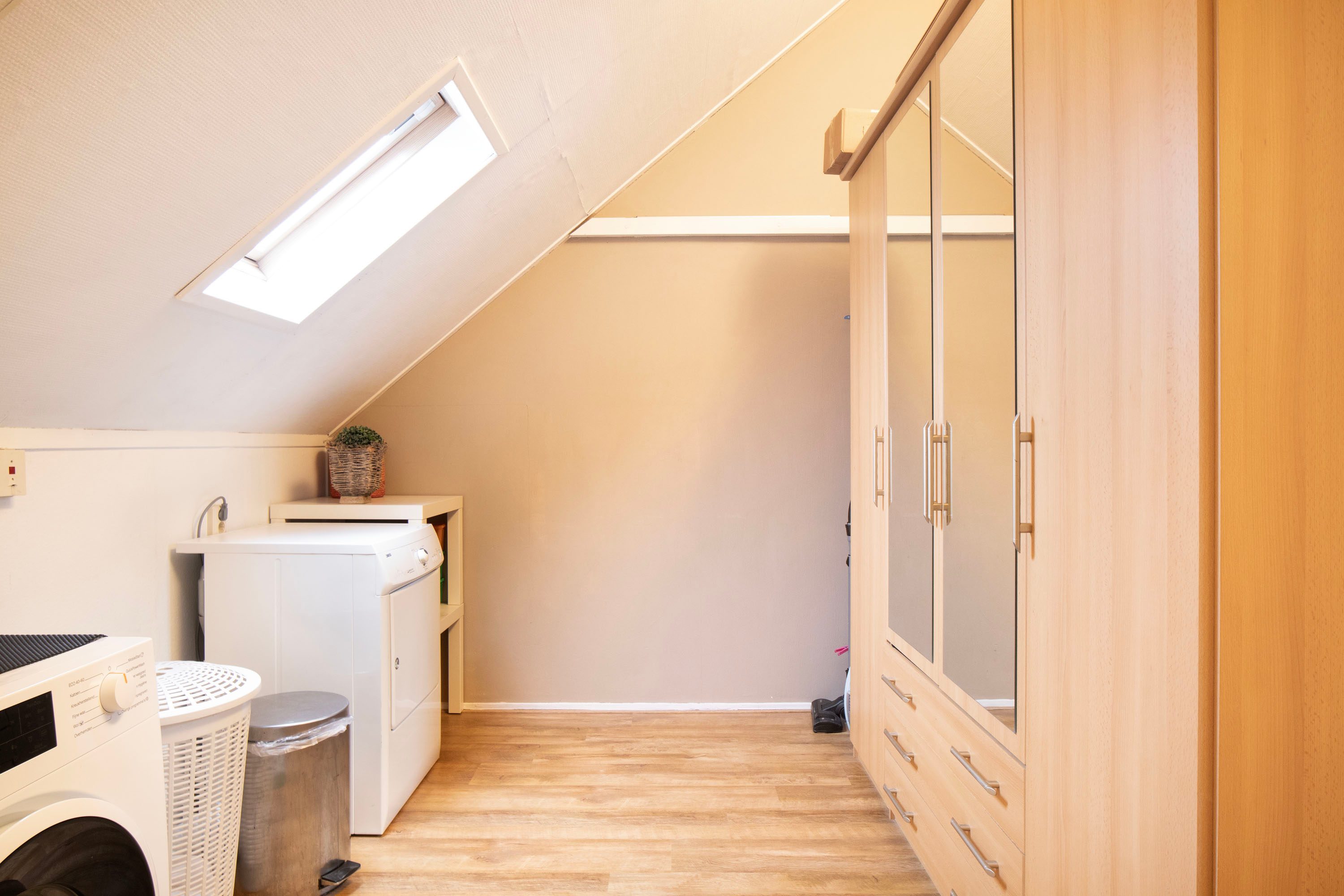 De zolder is via een vaste trap bereikbaar en biedt een slimme indeling met twee functionele ruimtes: een extra slaapkamer en een praktische was- en opbergruimte. Beide kamers zijn voorzien van een dakraam, waardoor ze heerlijk van daglicht worden voorzien. Op deze verdieping bevinden zich bovendien de cv-ketel en de wasmachineaansluiting. Achter de knieschotten is extra bergruimte beschikbaar.