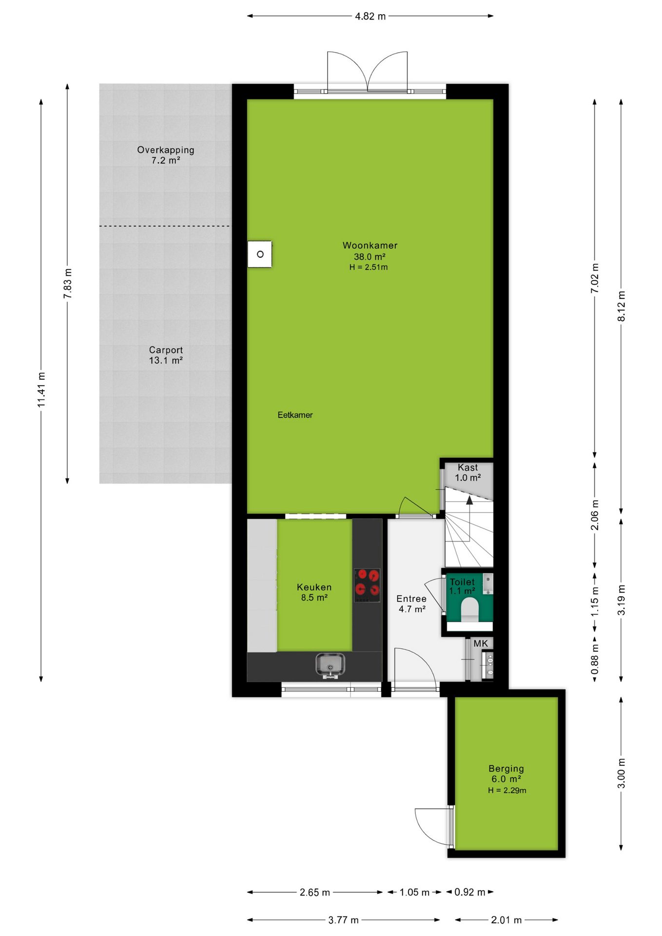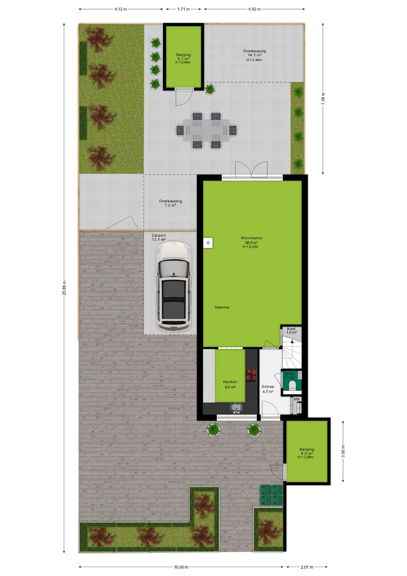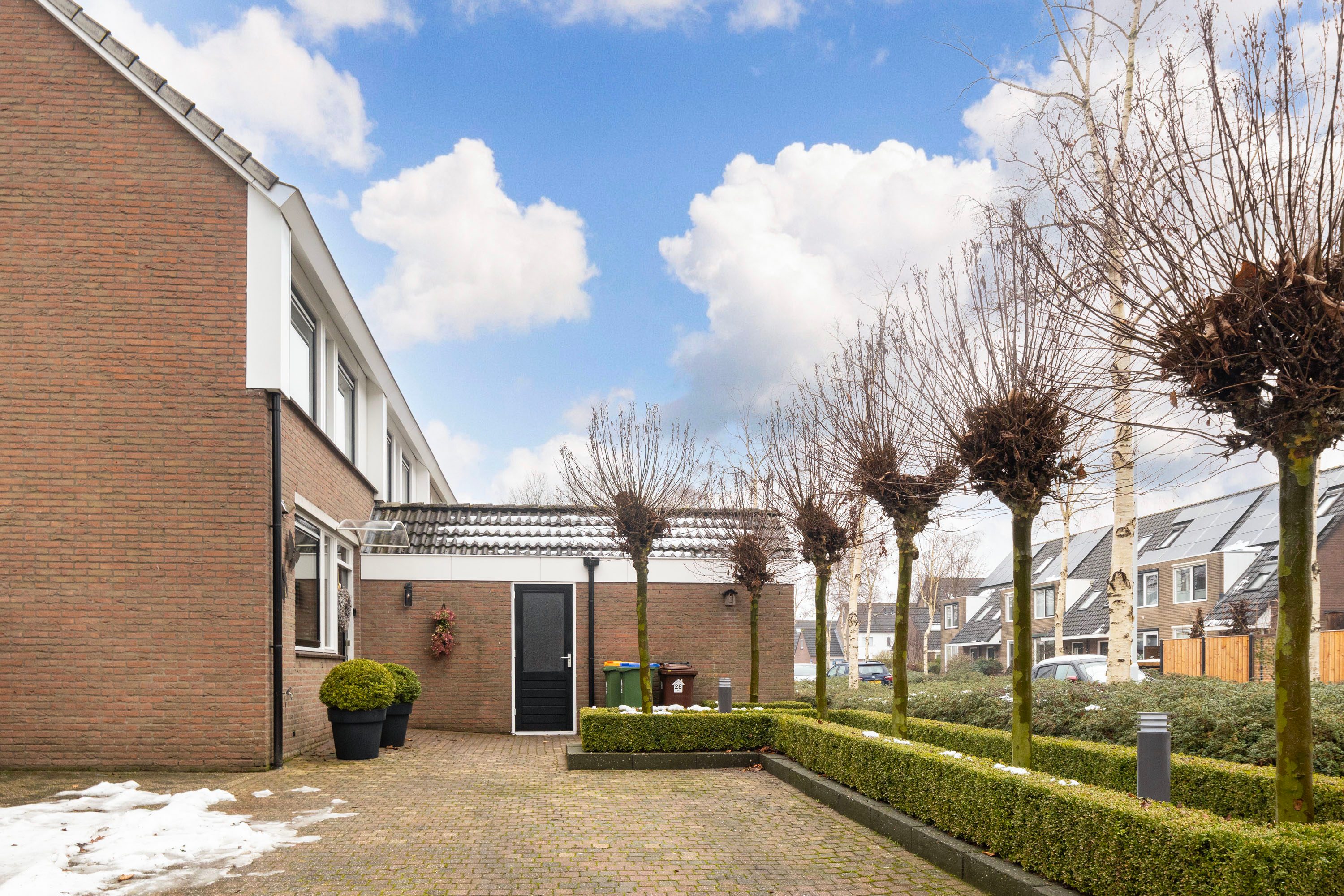 Aan de voorzijde van de woning is veel ruimte beschikbaar. Een aparte berging van circa 6 m² is echt een pluspunt en ideaal voor het stallen van fietsen. De ruime oprit met carport biedt plaats aan meerdere auto’s en is daarnaast ook perfect geschikt voor een brommer of extra fietsen. Via de carport is er direct toegang tot de achtertuin.