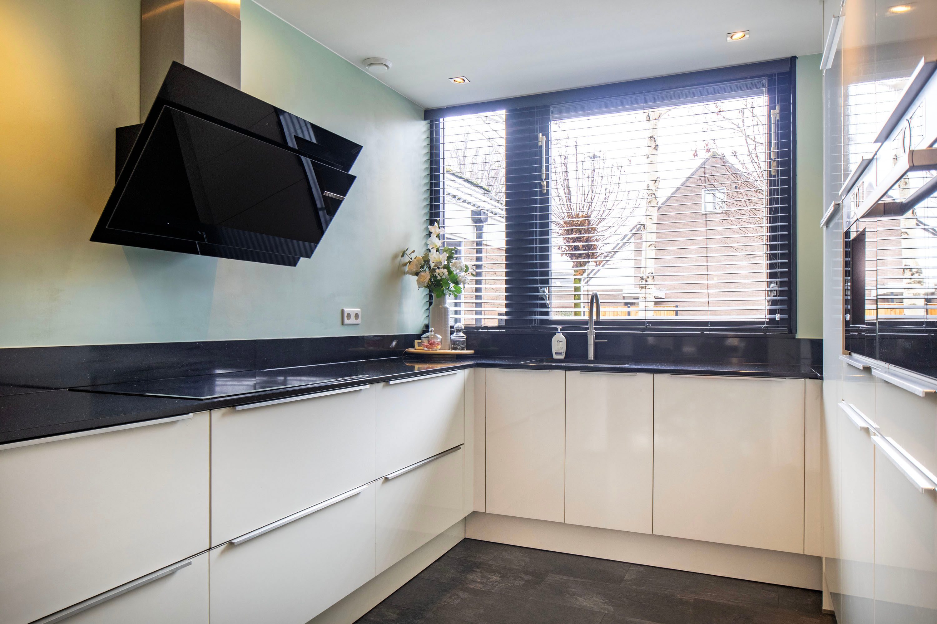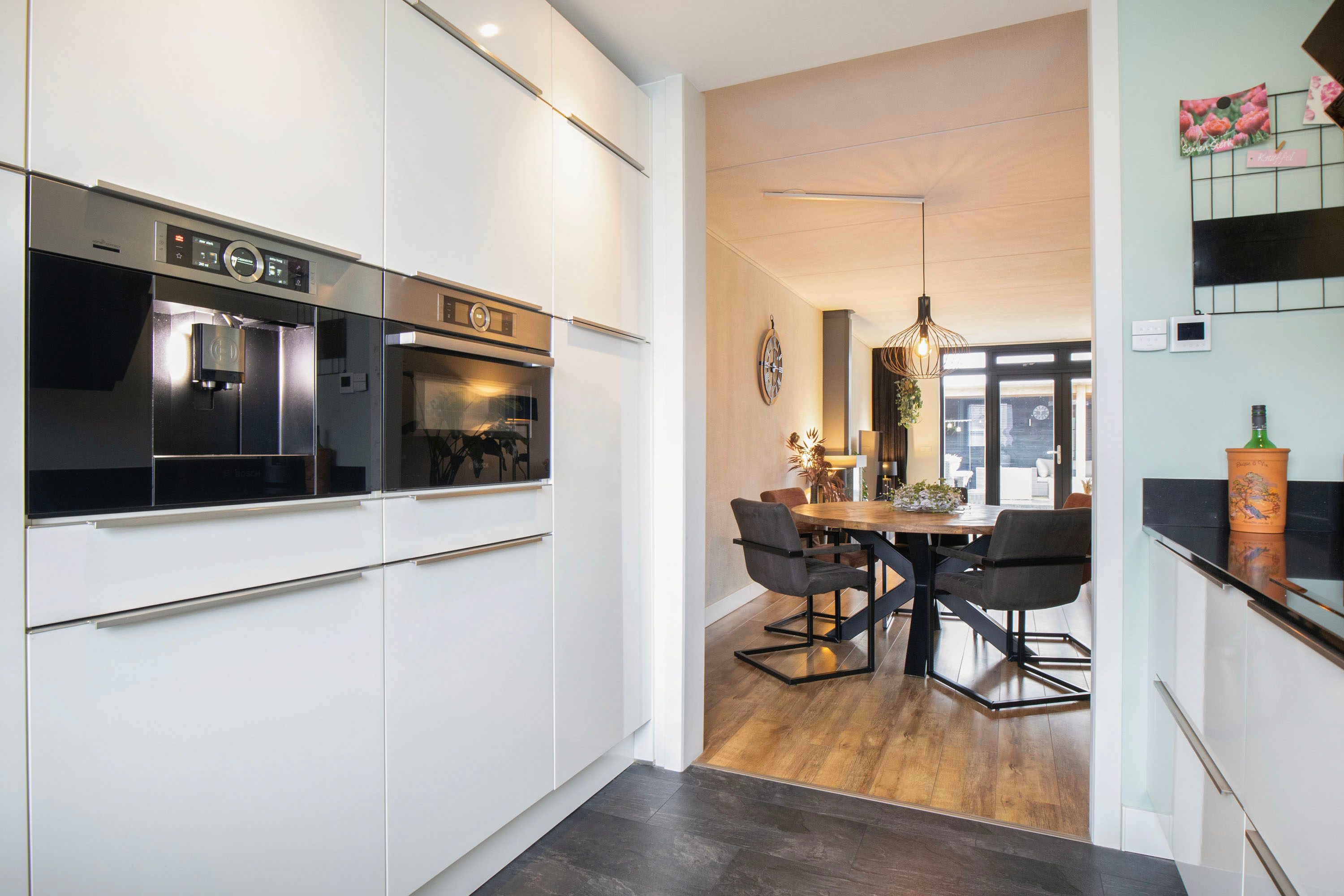 De halfopen keuken vormt een natuurlijke verbinding tussen koken en wonen en is modern en strak uitgevoerd. De keuken is compleet uitgerust met diverse inbouwapparatuur, waaronder een inductiekookplaat met afzuiging, een combi-oven/magnetron, koelkast, vriezer, vaatwasser, een ingebouwde koffiemachine en een Quooker. Dankzij de praktische opstelling is er volop werk- en opbergruimte. Extra prettig is de aanwezigheid van vloerverwarming in de keuken, wat zorgt voor een aangenaam wooncomfort tijdens het koken en tafelen.