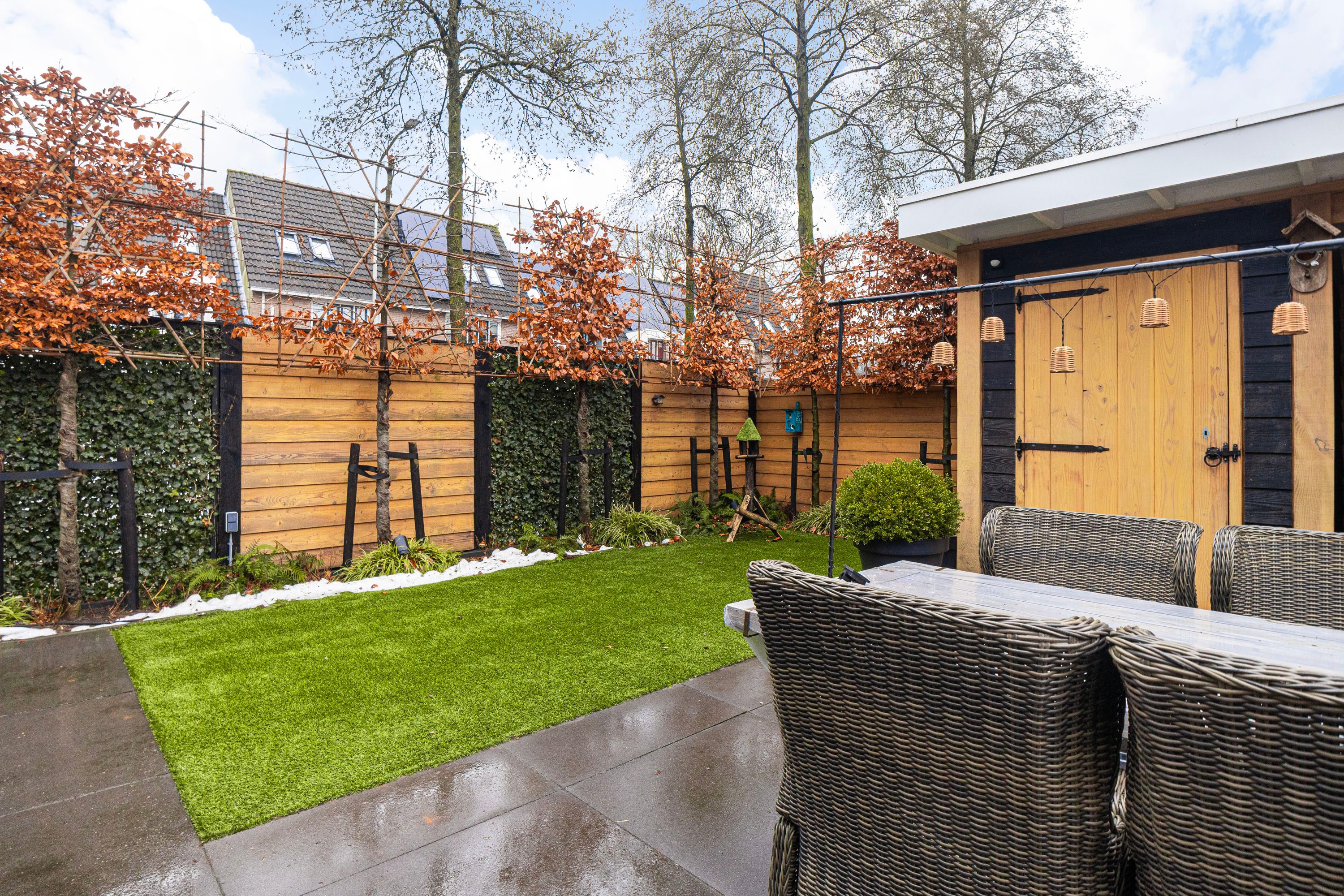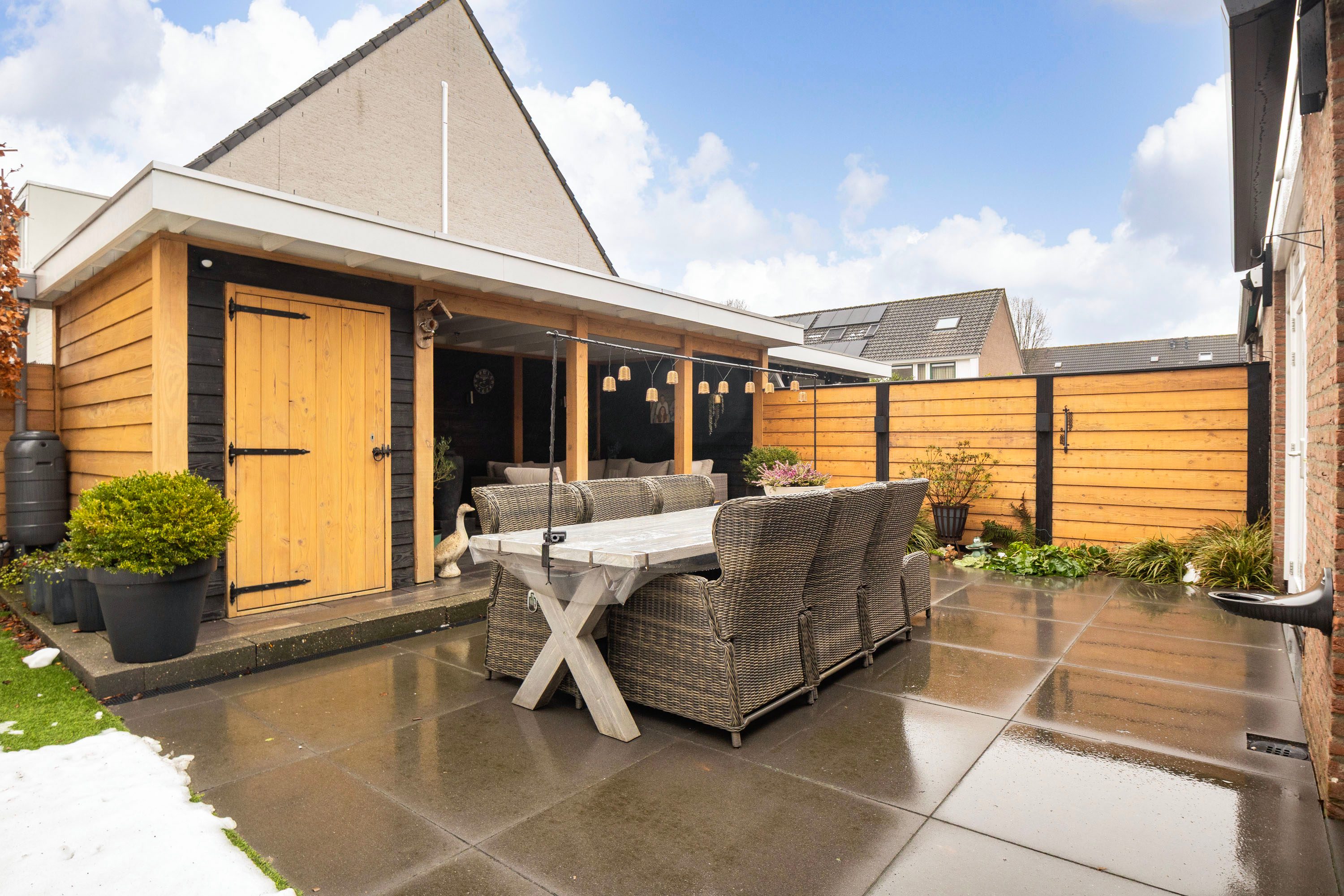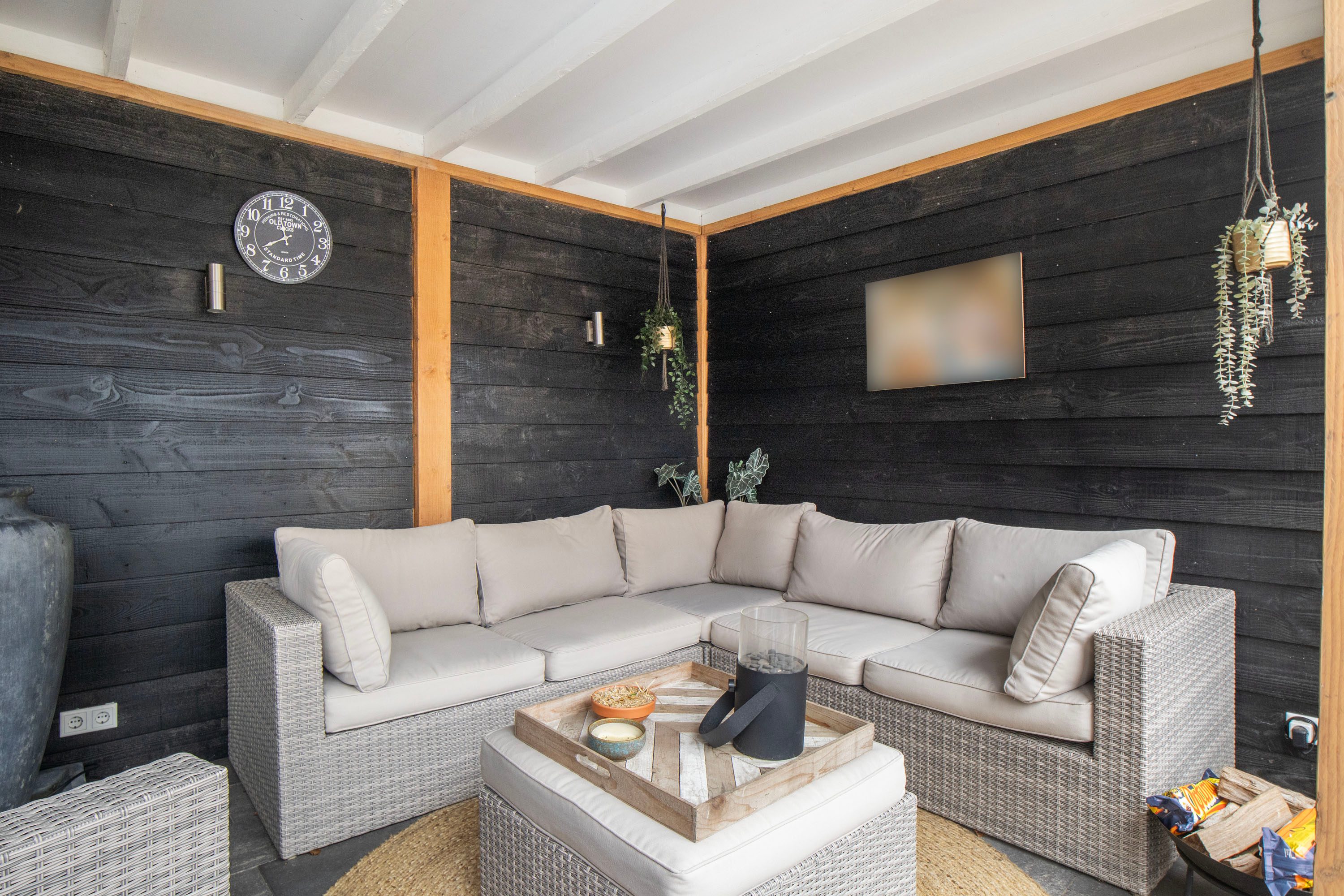 De achtertuin ligt gunstig op het zuidoosten en biedt volop mogelijkheden om van het buitenleven te genieten. Dankzij het zonnescherm en de overkapping is er altijd een prettige plek, zowel in de zon als in de schaduw. Aan de overkapping grenst bovendien een extra berging, ideaal voor het opbergen van tuinspullen.