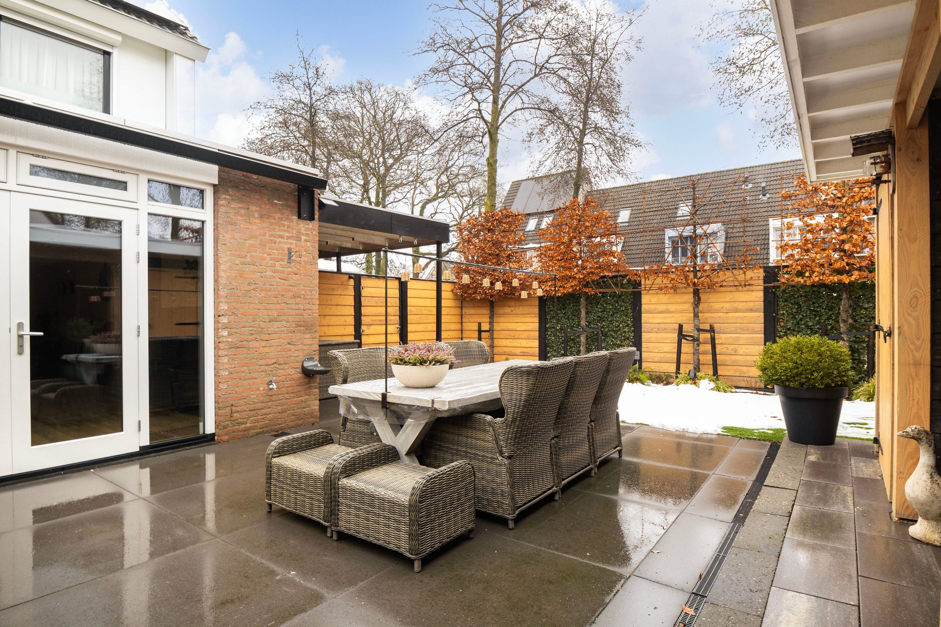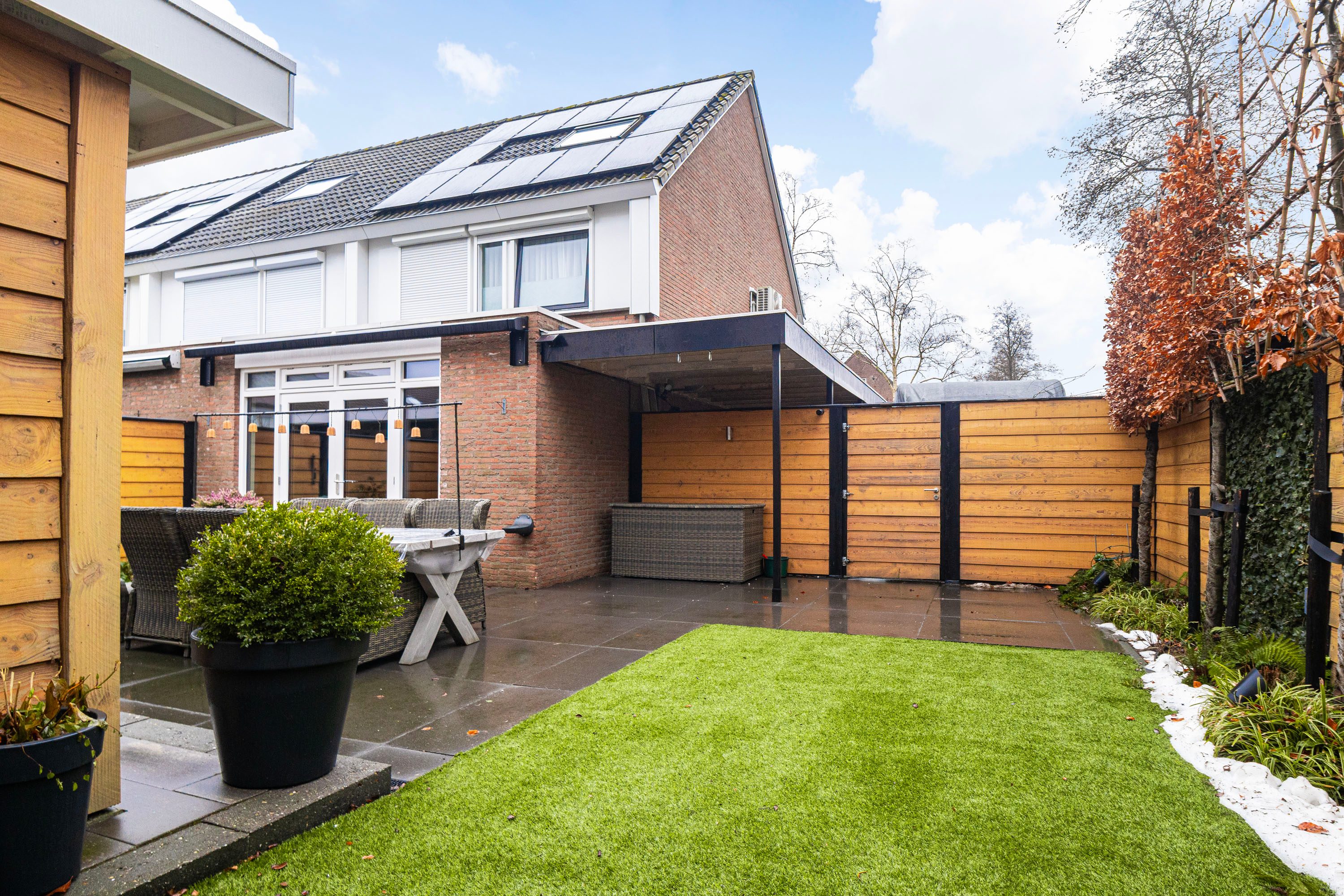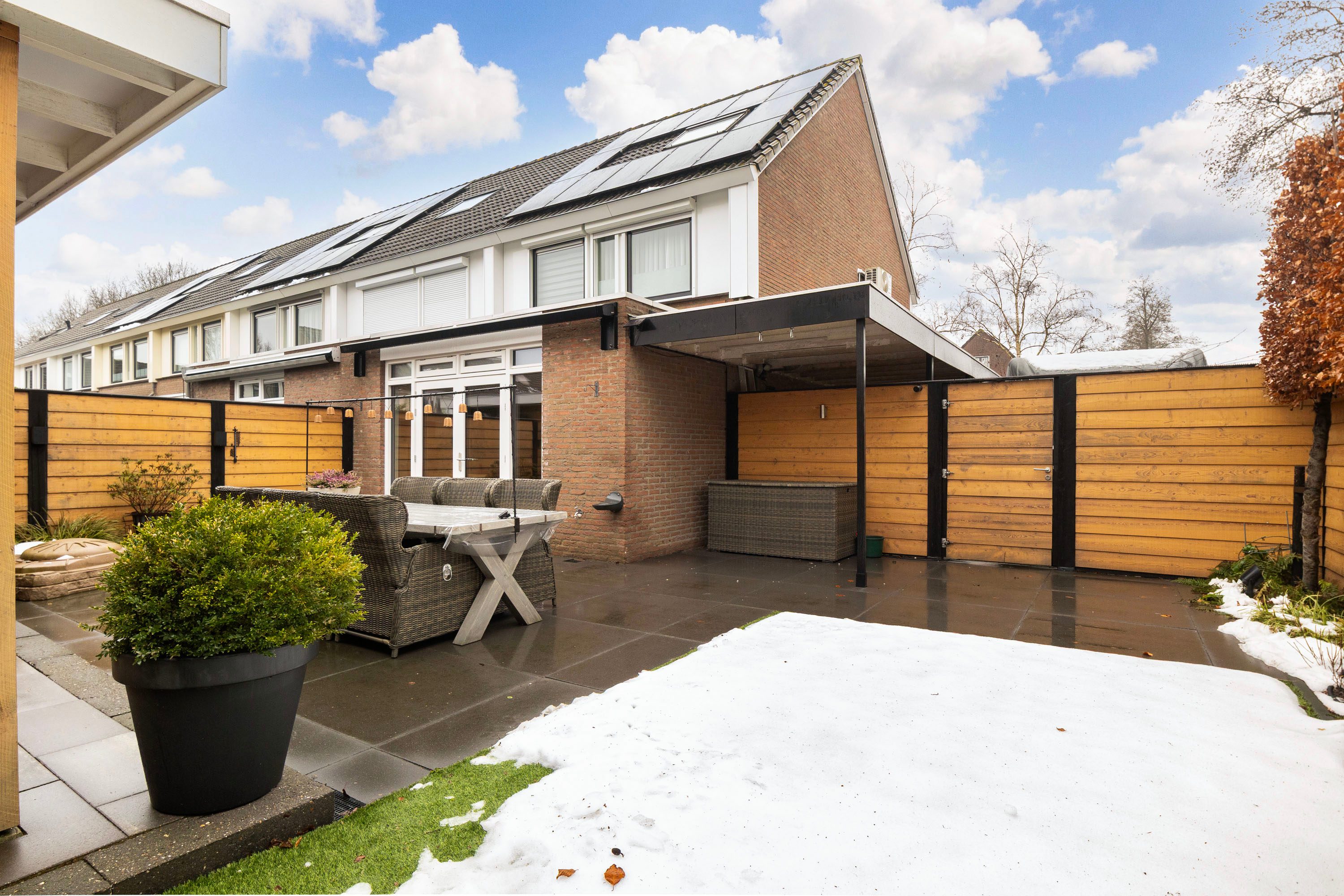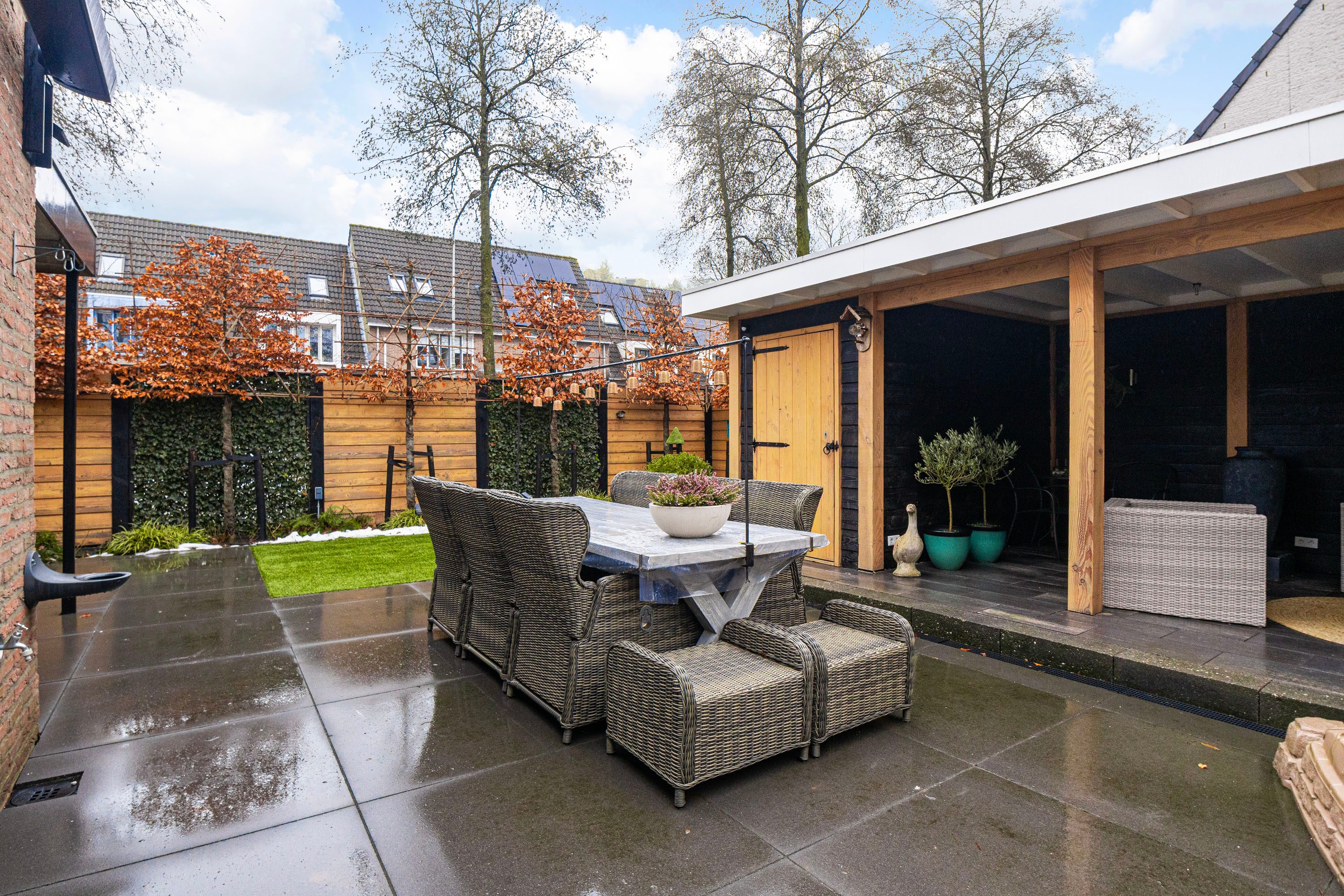 De achtertuin ligt gunstig op het zuidoosten en biedt volop mogelijkheden om van het buitenleven te genieten. Dankzij het zonnescherm en de overkapping is er altijd een prettige plek, zowel in de zon als in de schaduw. Aan de overkapping grenst bovendien een extra berging, ideaal voor het opbergen van tuinspullen.