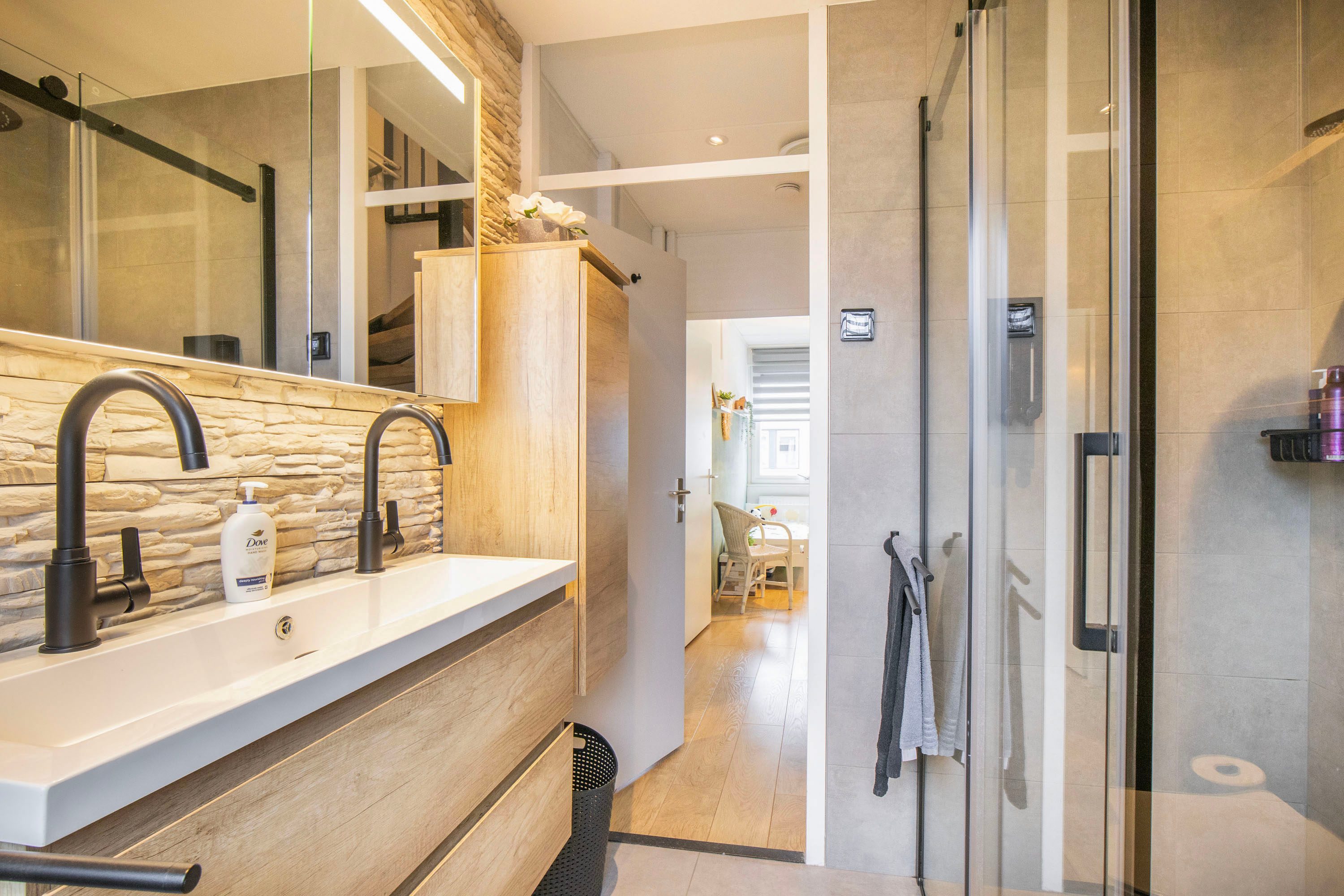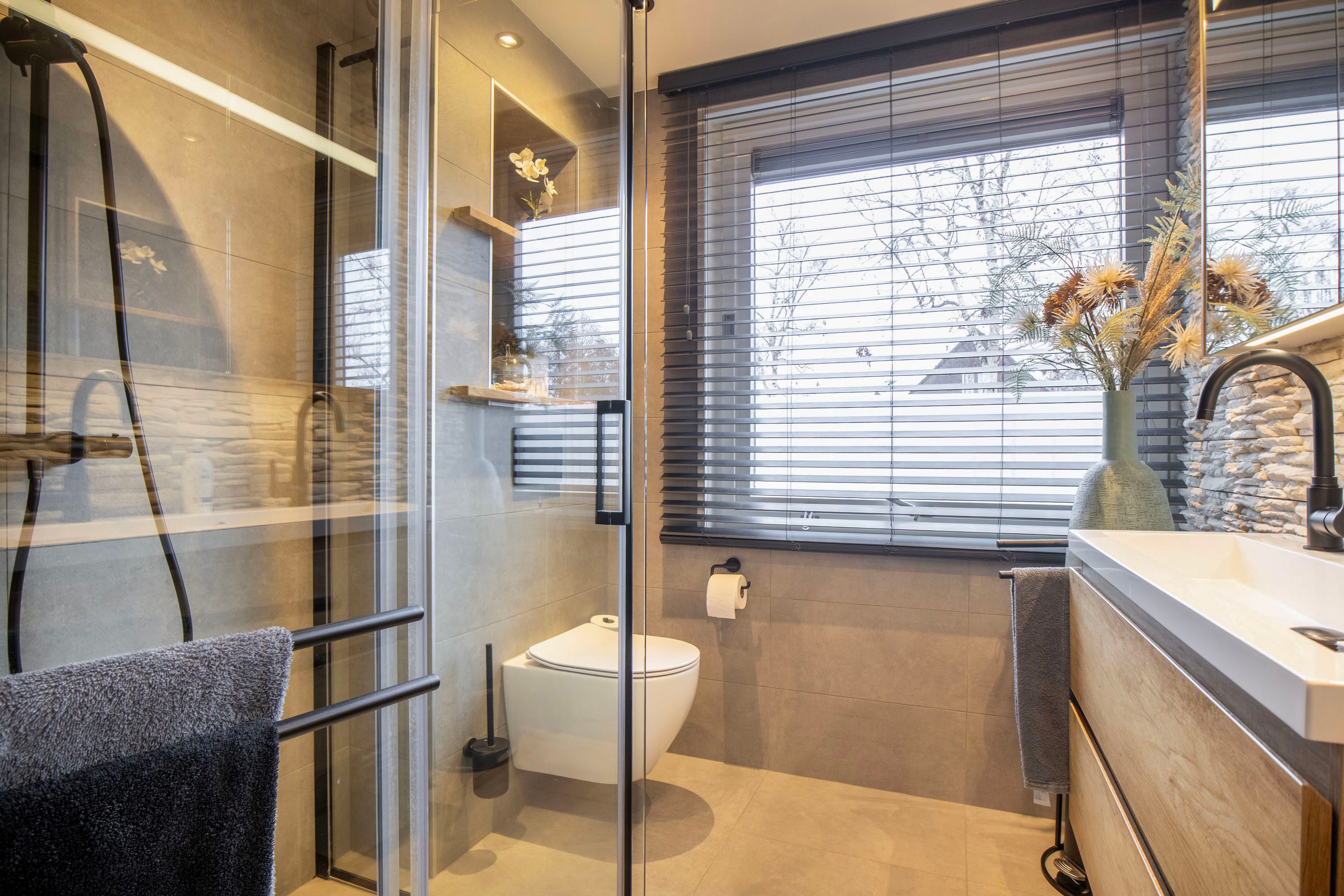De moderne badkamer is strak uitgevoerd en voorzien van een douche, toilet en een dubbele wastafel met meubel. De vloerverwarming zorgt hier voor extra comfort.