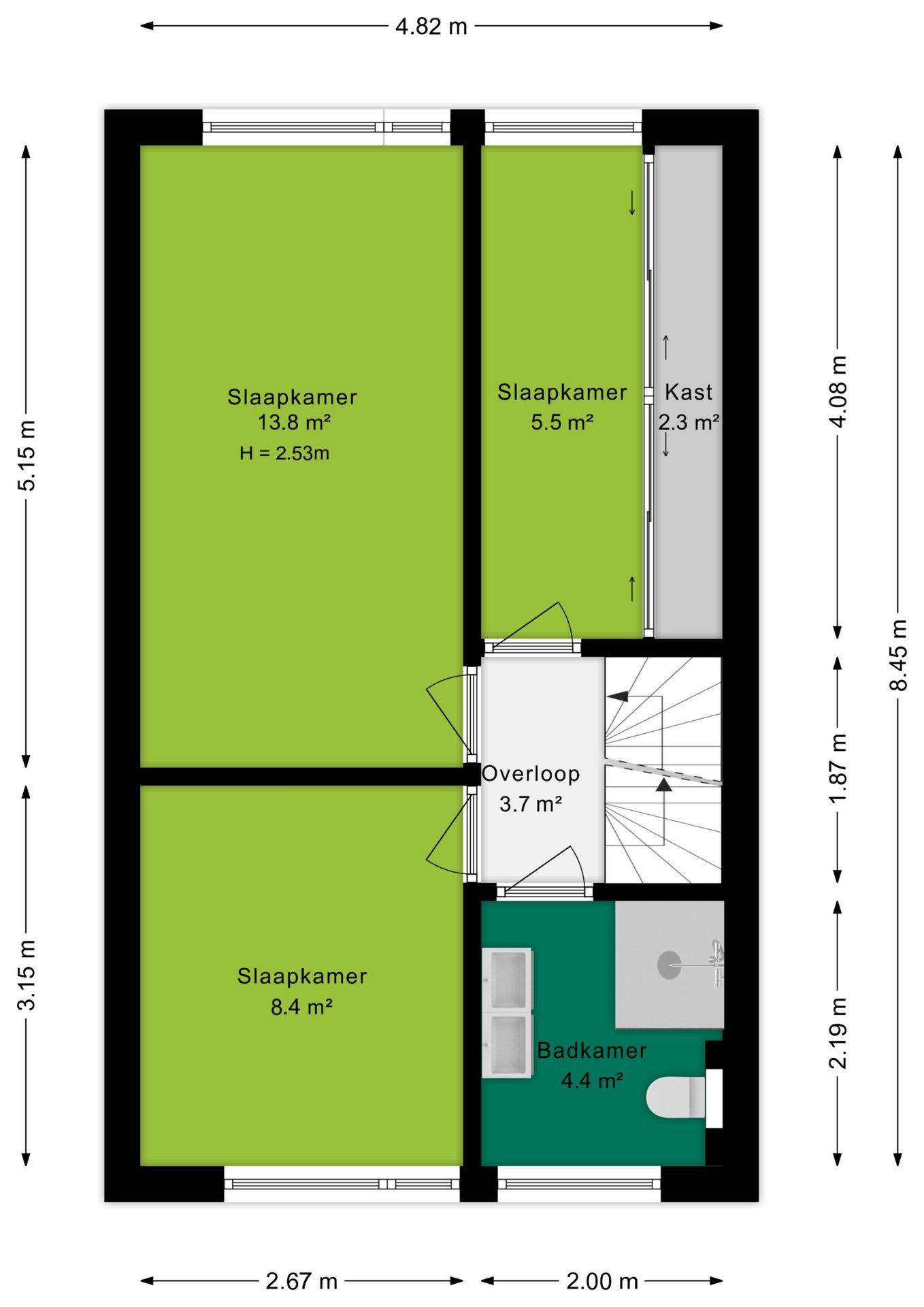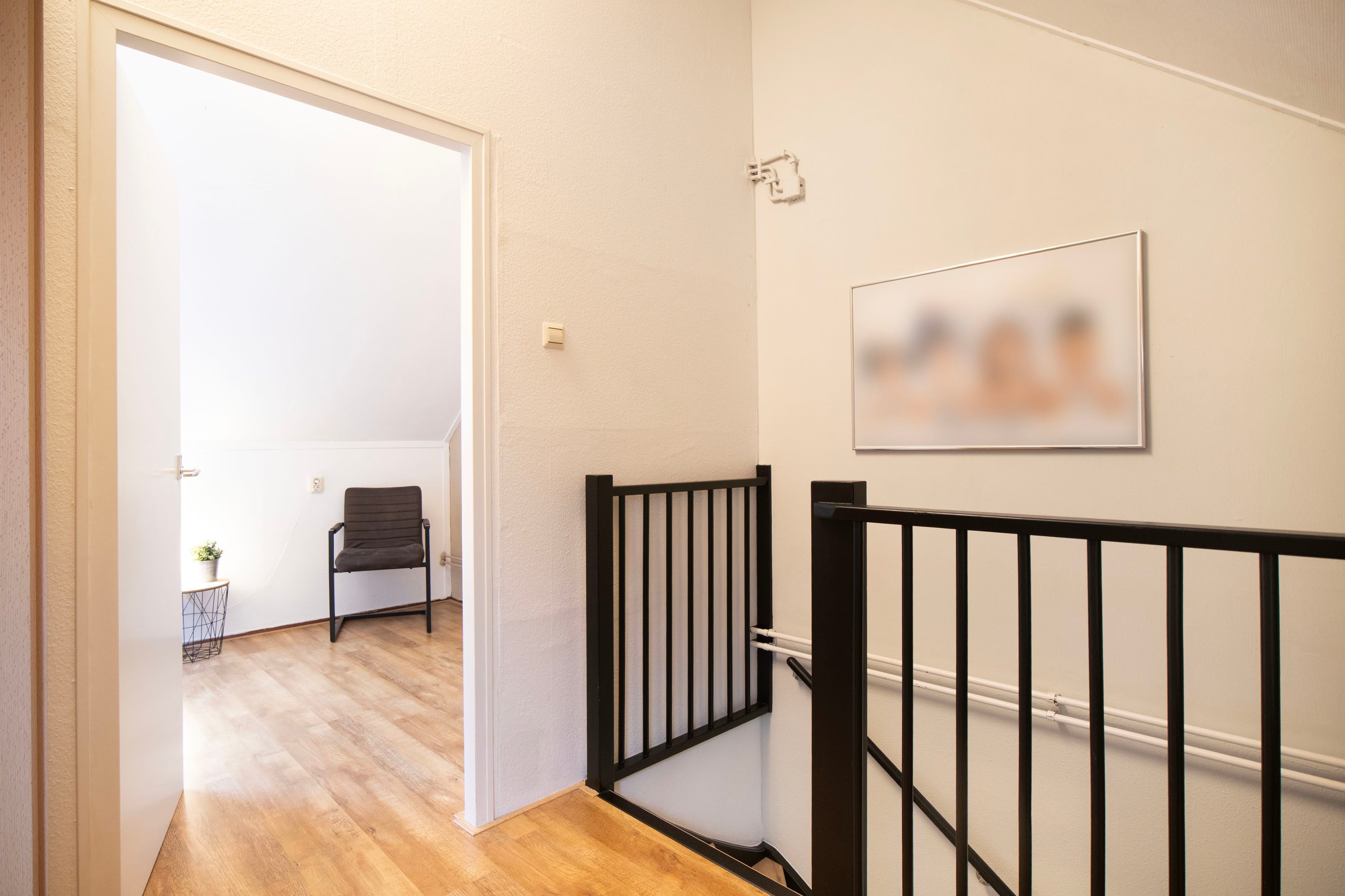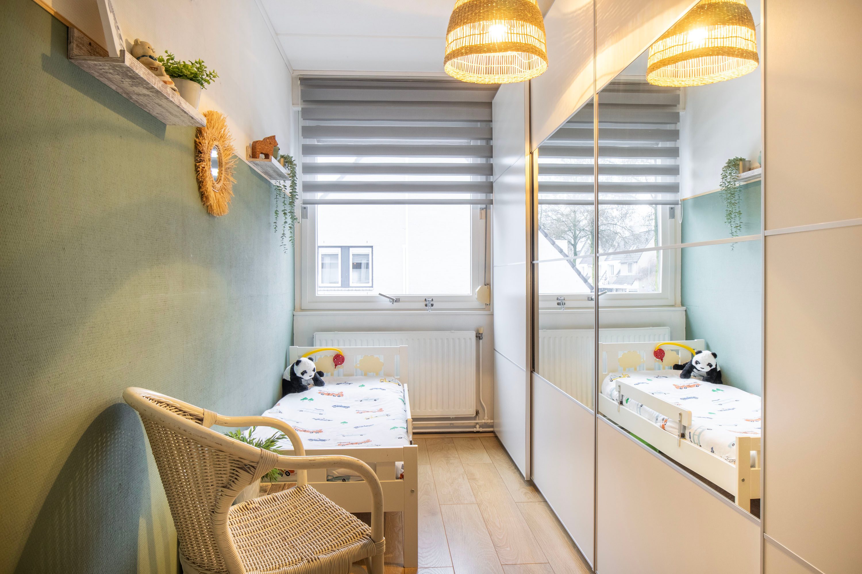 Via de verzorgd afgewerkte trap bereik je de eerste verdieping. Op deze verdieping bevinden zich drie slaapkamers en de badkamer. De grootste slaapkamer, gelegen aan de achterzijde, heeft een oppervlakte van circa 14 m² en is voorzien van airconditioning en een tv-aansluiting. De tweede slaapkamer aan de voorzijde is circa 9 m² groot en leent zich uitstekend als slaap-, werk- of hobbykamer. De derde slaapkamer, met een oppervlakte van circa 5 m², is ideaal te gebruiken als kinder-, werk- of inloopkamer.
