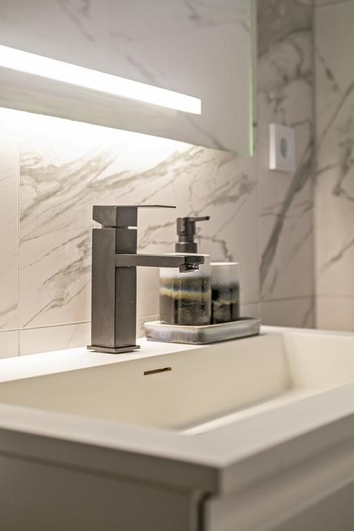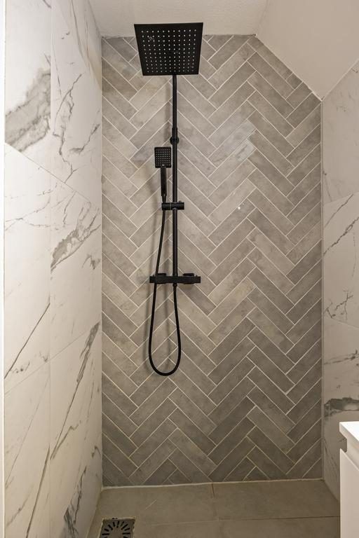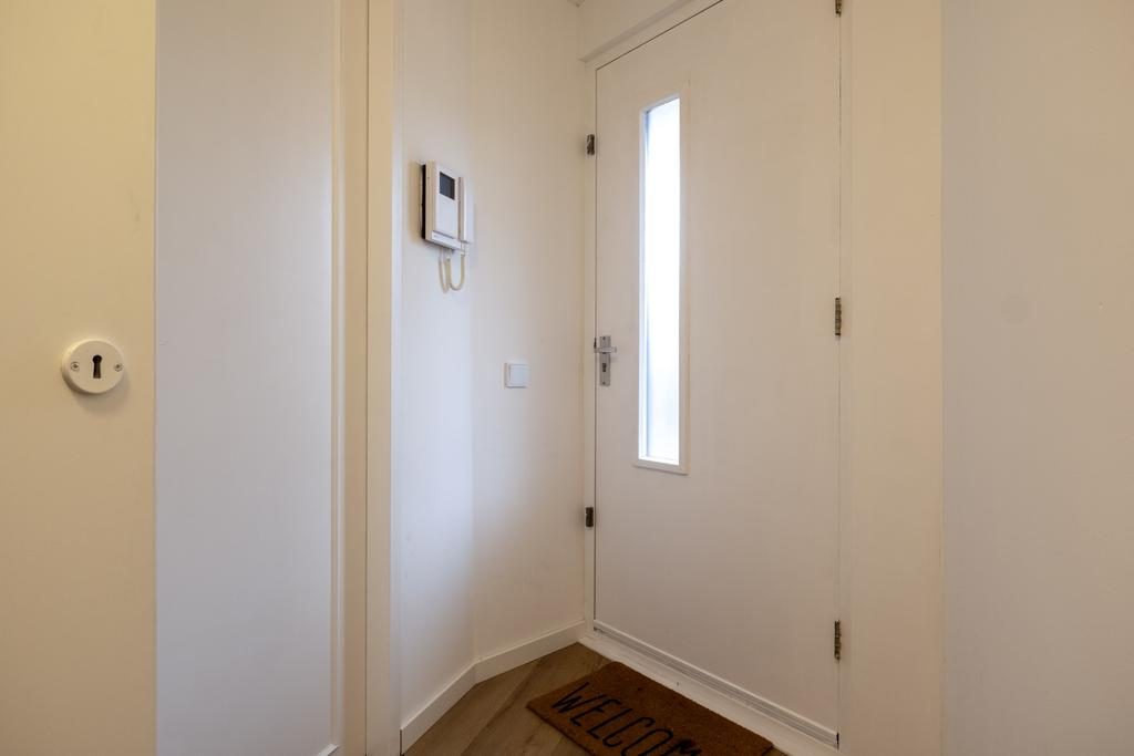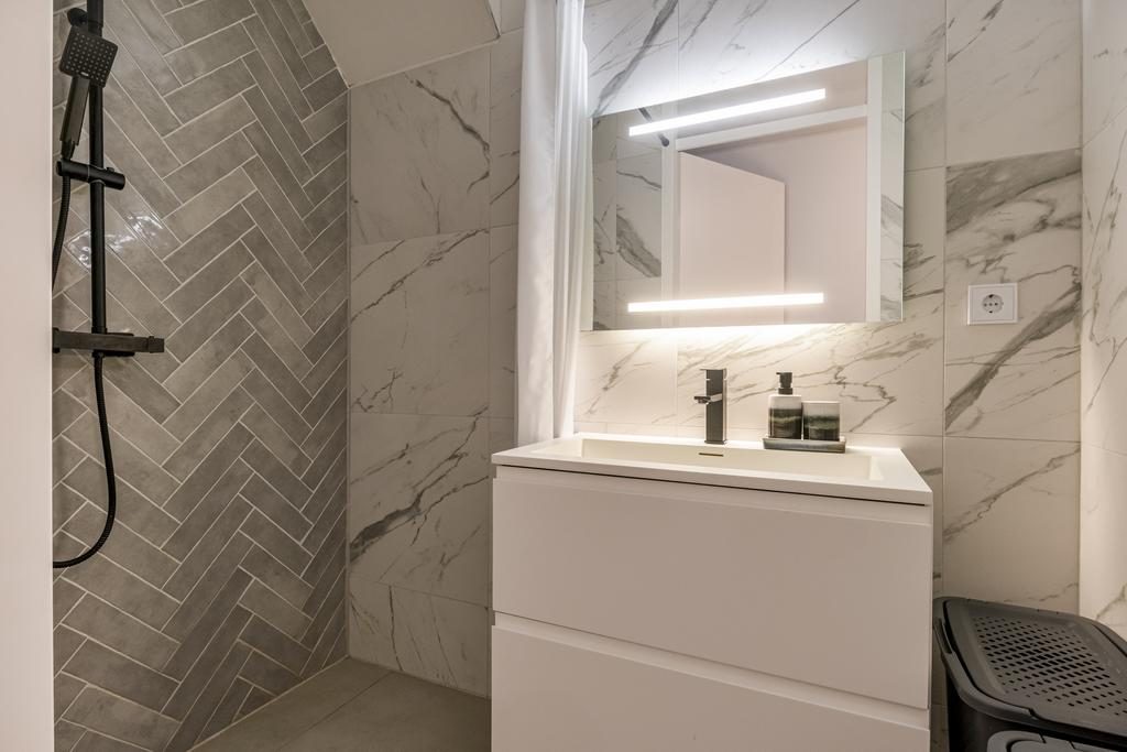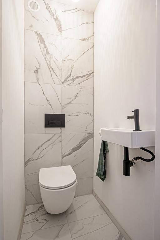 Bij binnenkomst in het appartement via de entree, word je verwelkomd door een praktische indeling met direct toegang tot de meterkast en een keurig afgewerkt toilet met fonteintje. De moderne badkamer is volledig betegeld en uitgerust met een stijlvolle wastafel en een luxe regendouche.
