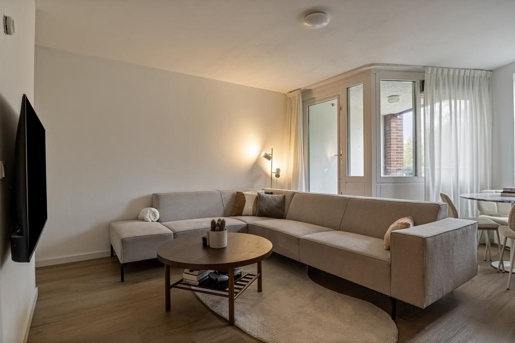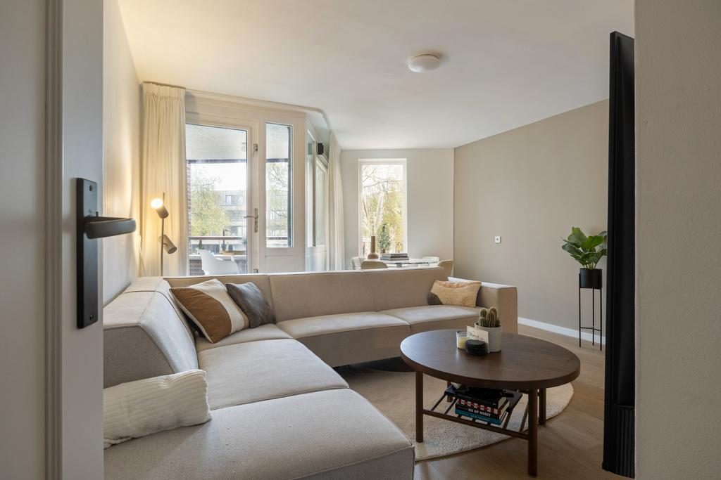 Verderop in de woning kom je in de ruime woonkamer, die dankzij het balkon aan de voorzijde baadt in natuurlijk licht. Het balkon, gelegen op het westen, biedt een heerlijke plek om te ontspannen en te genieten van de middag- en avondzon. Hier is voldoende ruimte voor een gezellig zitje waar je kunt ontspannen na een lange dag.