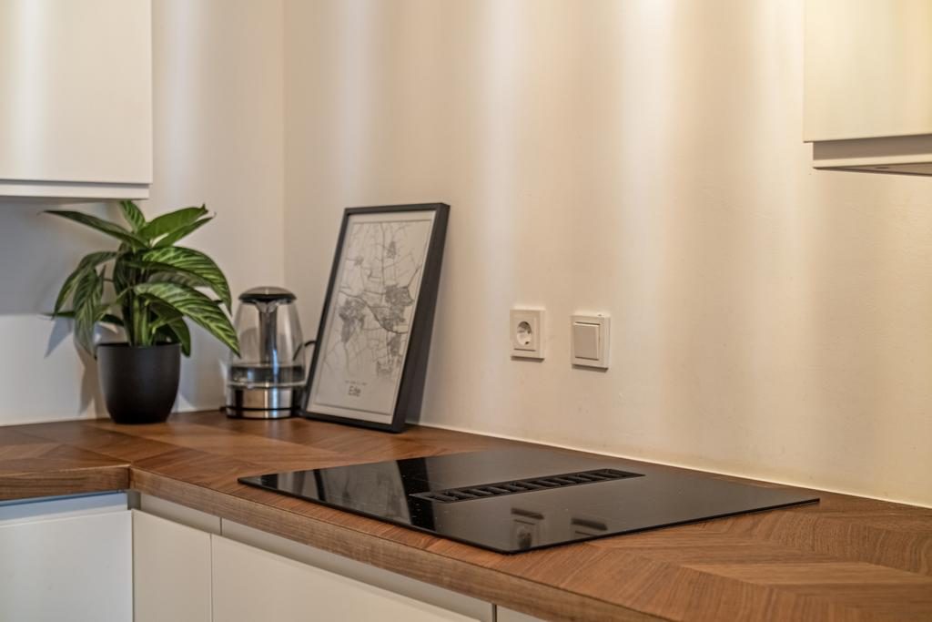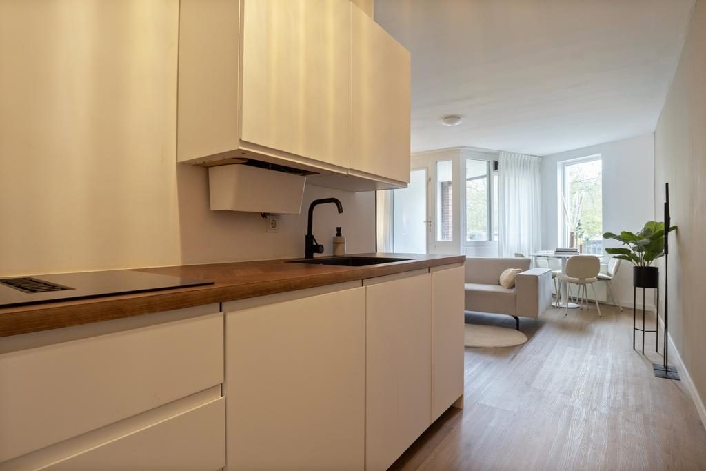 De keuken bevindt zich om de hoek van de woonkamer en is uitgevoerd in een lichte kleurstelling, gecombineerd met een elegant houten aanrechtblad. De keuken is voorzien van diverse hoogwaardige inbouwapparatuur, waaronder een inductiekookplaat met geïntegreerde afzuigkap, een vaatwasser, een oven en een koelkast.