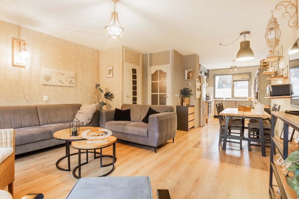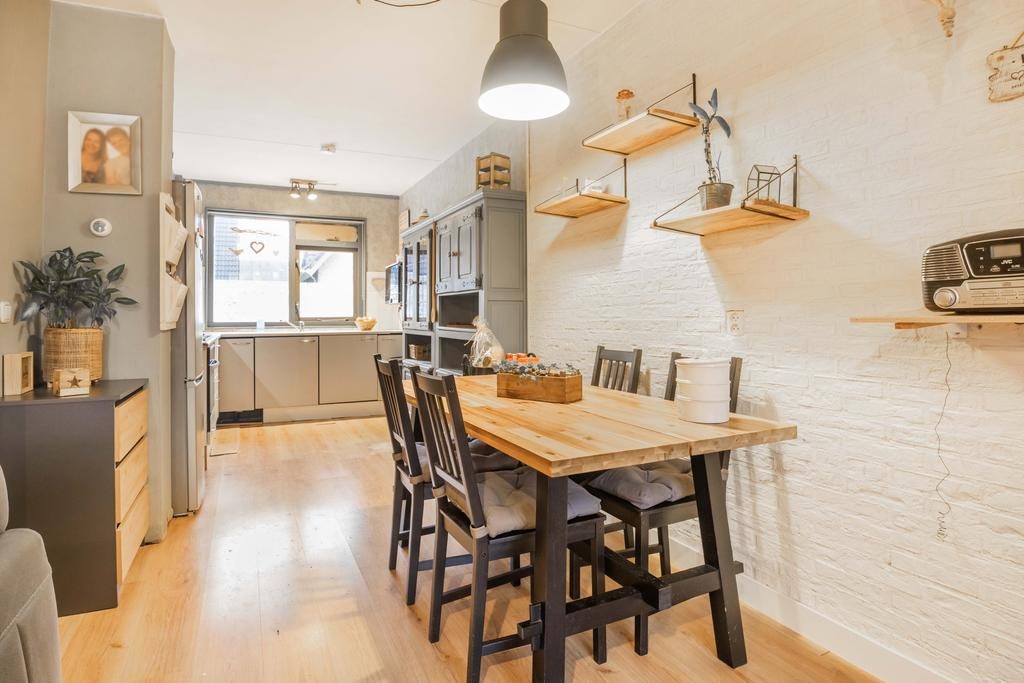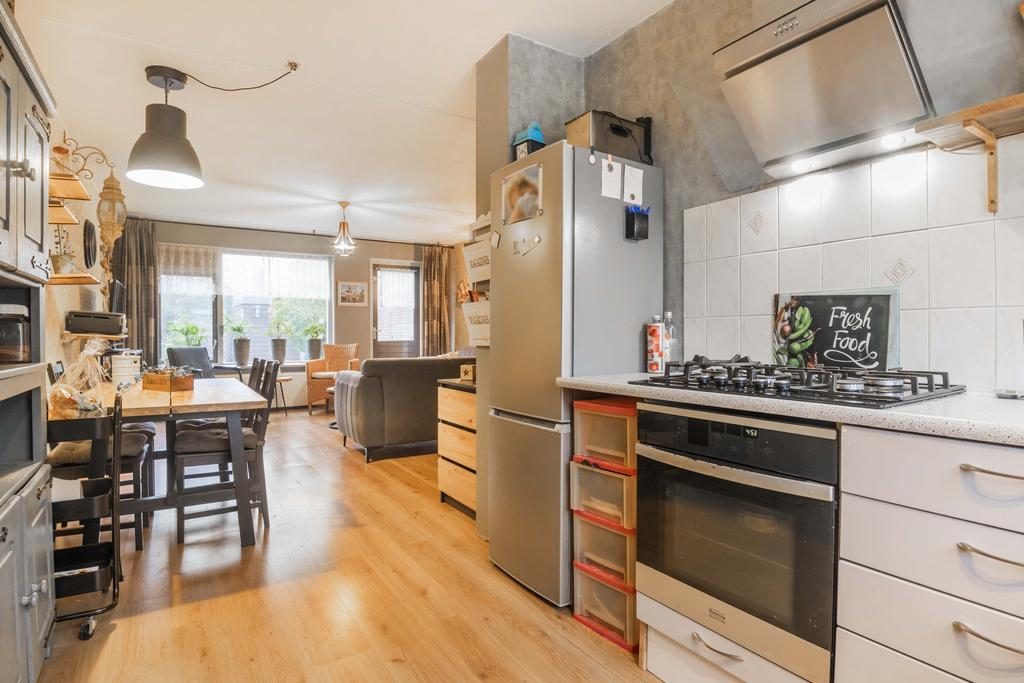 Via de entree kom je bij de ruime hal met een toiletruimte, de trapopgang naar de eerste verdieping en de deur die toegang geeft tot de woonkamer. Bij binnenkomst tref je een praktische indeling met een lichte, tuingerichte woonkamer. Centraal tussen de woonkamer en keuken bevindt zich het eetgedeelte. Hier is meer dan voldoende ruimte voor een grote eettafel met stoelen. Een fijne plek om met familie en/of vrienden te genieten van een hapje, drankje en spelletje! De L-vormige keuken is aan de voorzijde van de woning gelegen en beschikt over een oven, afzuigkap, gasfornuis en een losse koelkast. Vanuit de keuken kijk je de gezellige straat in.
