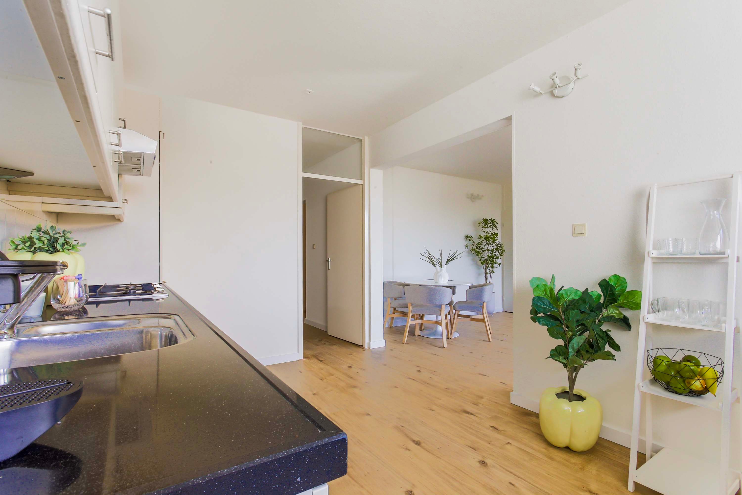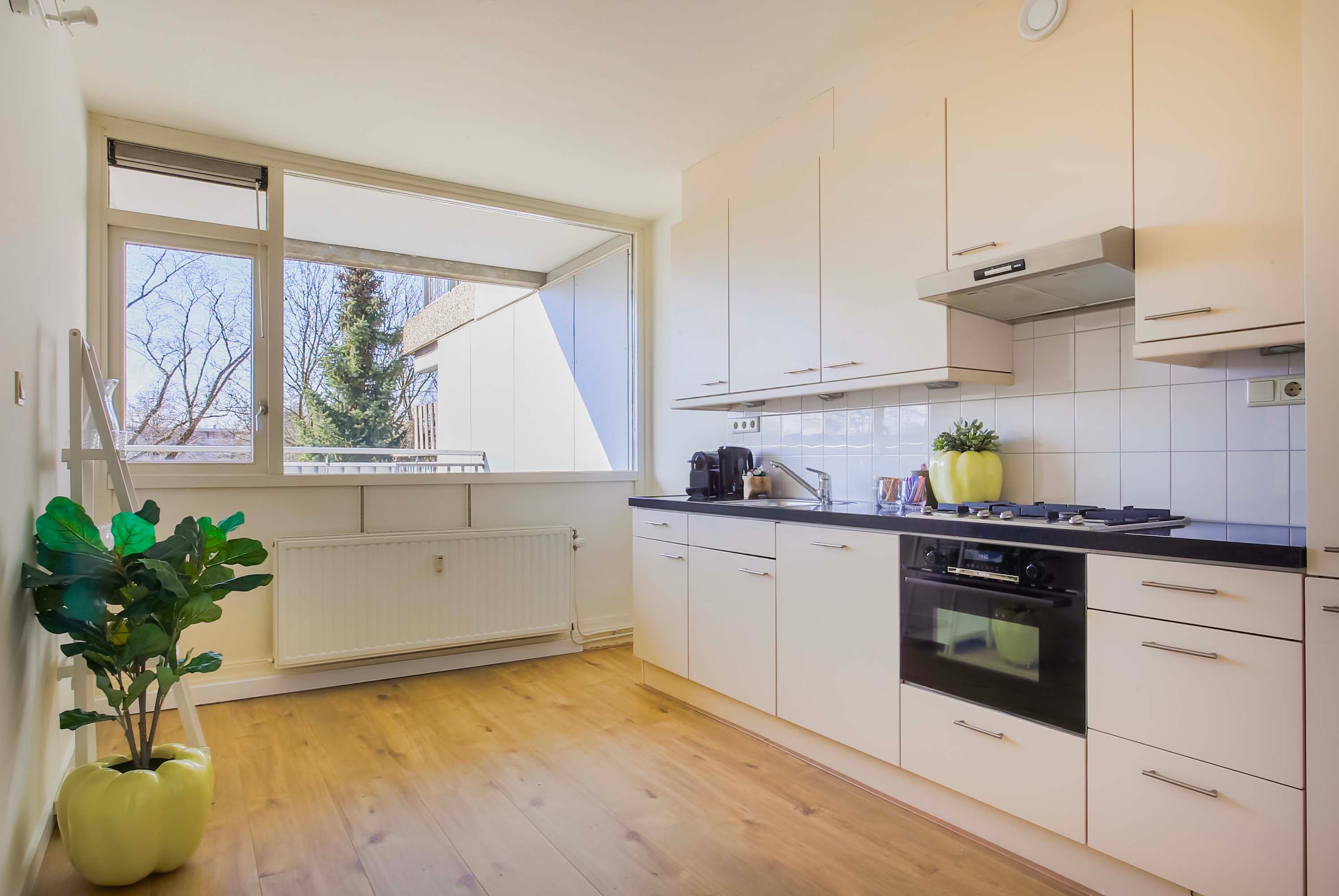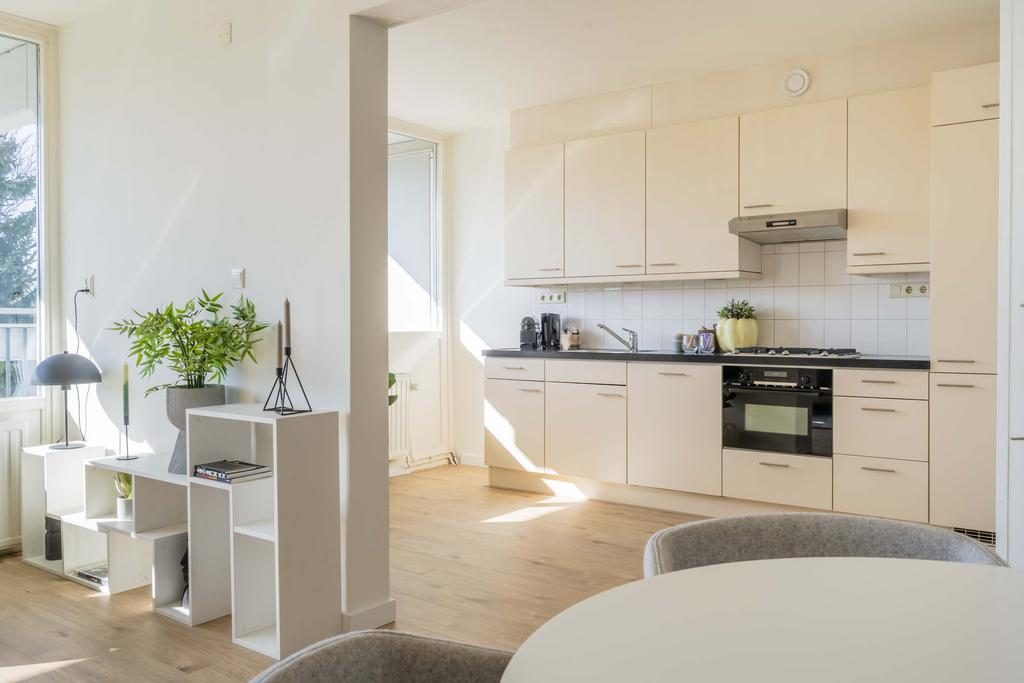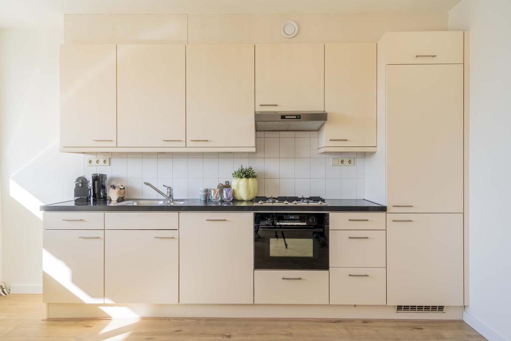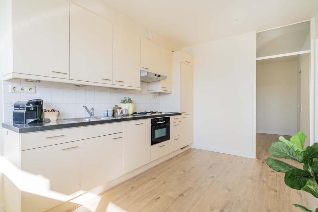 De half open keuken is modern ingericht, voorzien van inbouwapparatuur zoals een koelkast, oven en gasfornuis. De badkamer heeft een stijlvolle en eigentijdse uitstraling en beschikt over een inloopdouche en losse wastafel.