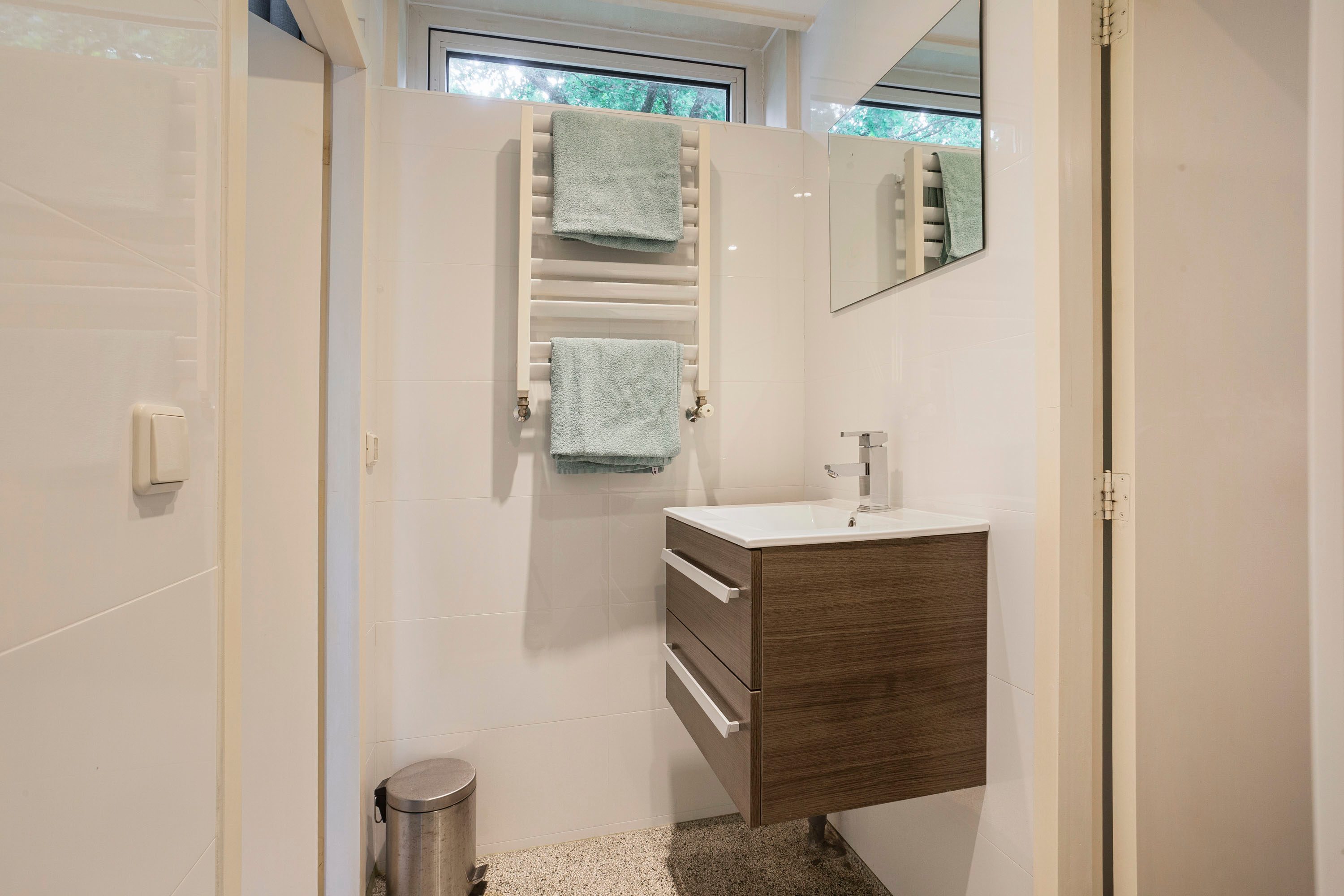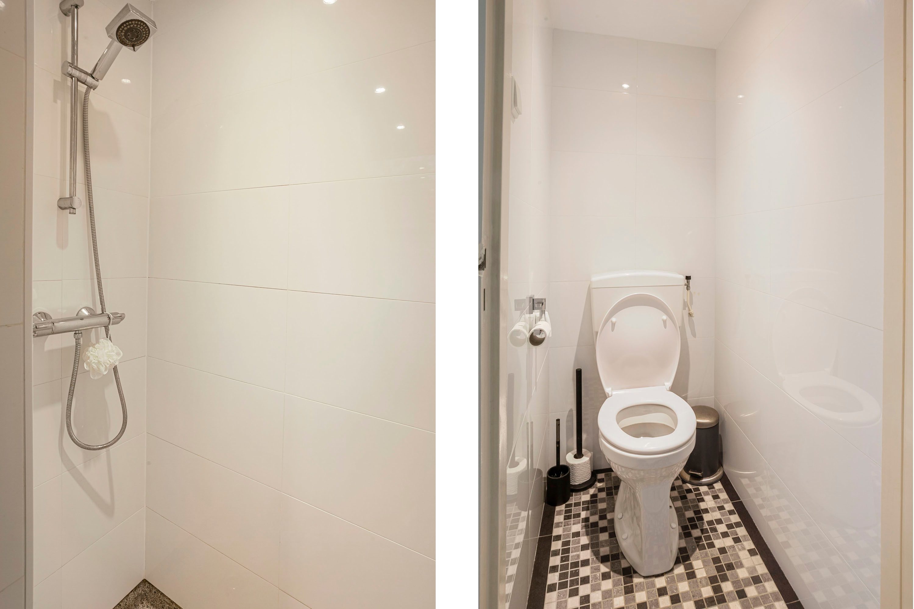 De badkamer is modern en fris, met een douchehoek, een wastafelmeubel en nette betegeling tot aan het plafond. Het toilet (apart van de badkamer) is ook modern uitgevoerd met mozaïektegels op de vloer. Je hoeft je hier echt nergens meer zorgen over te maken!