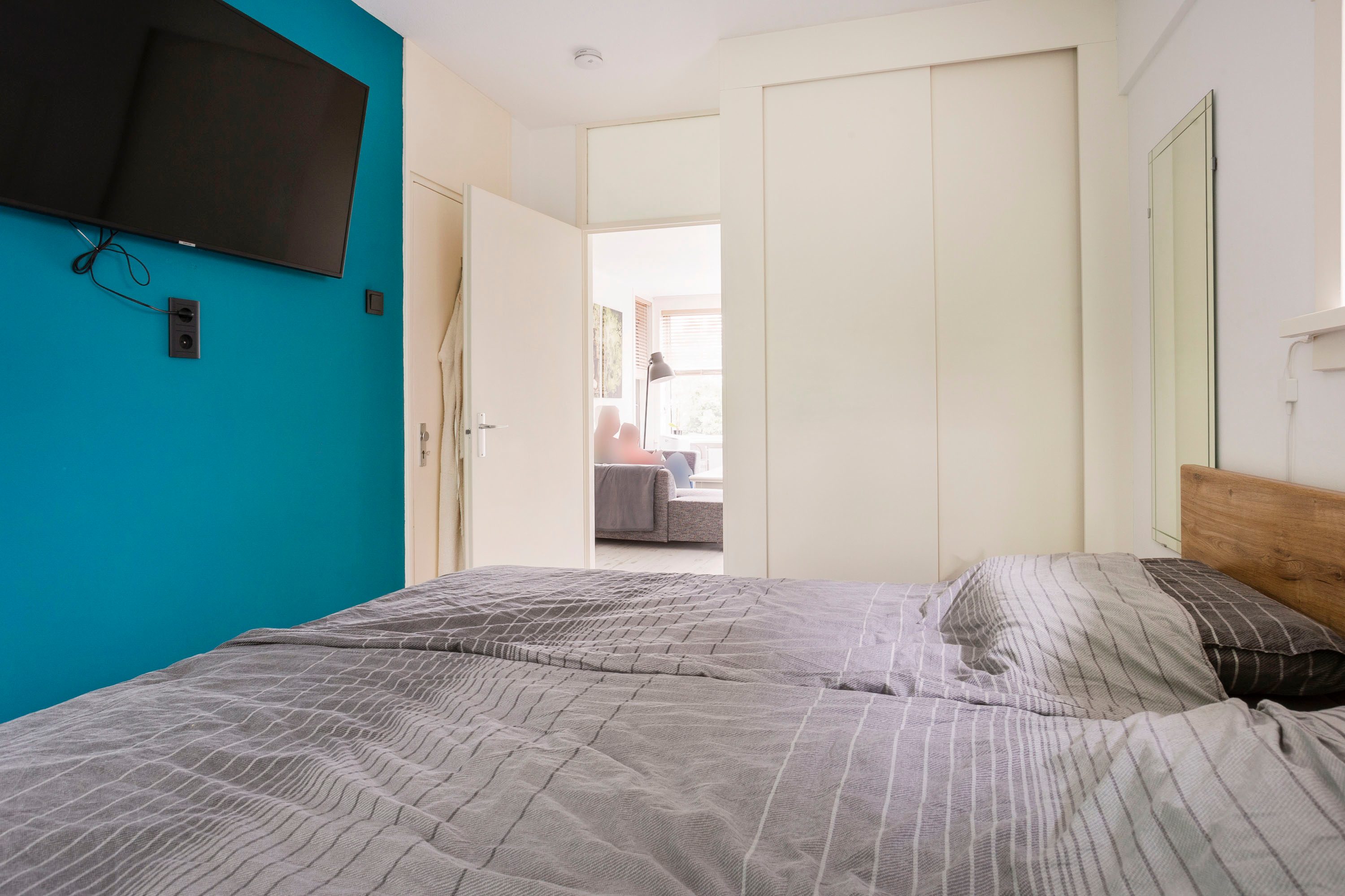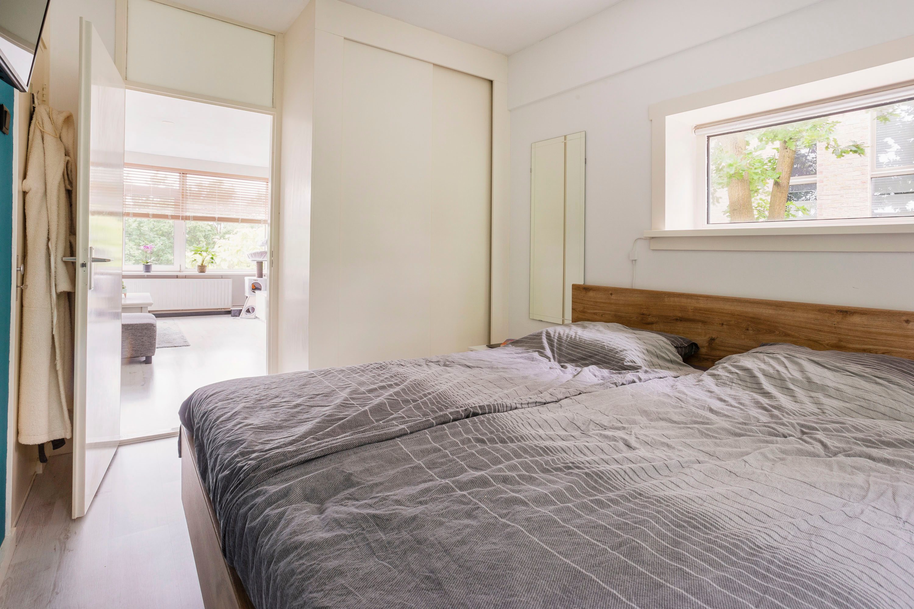 De twee slaapkamers bieden eindeloze mogelijkheden. De master bedroom bevindt zich aan de rustige achterkant van het appartement en heeft een ingebouwde kast én een tv-aansluiting, ideaal voor een relaxte avond in bed. De kleinere kamer aan de voorzijde heeft een grote raampartij met veel licht, wat ook perfect is voor bijvoorbeeld een thuiskantoor of logeerkamer.