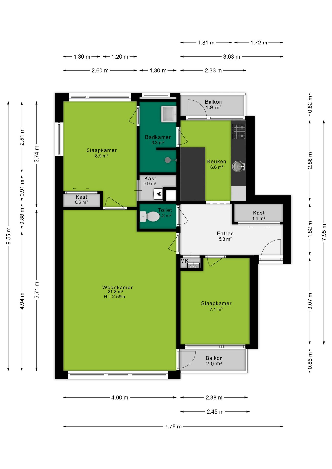 - Twee balkons: één zonnig balkon op het zuiden en een tweede balkon op het noorden