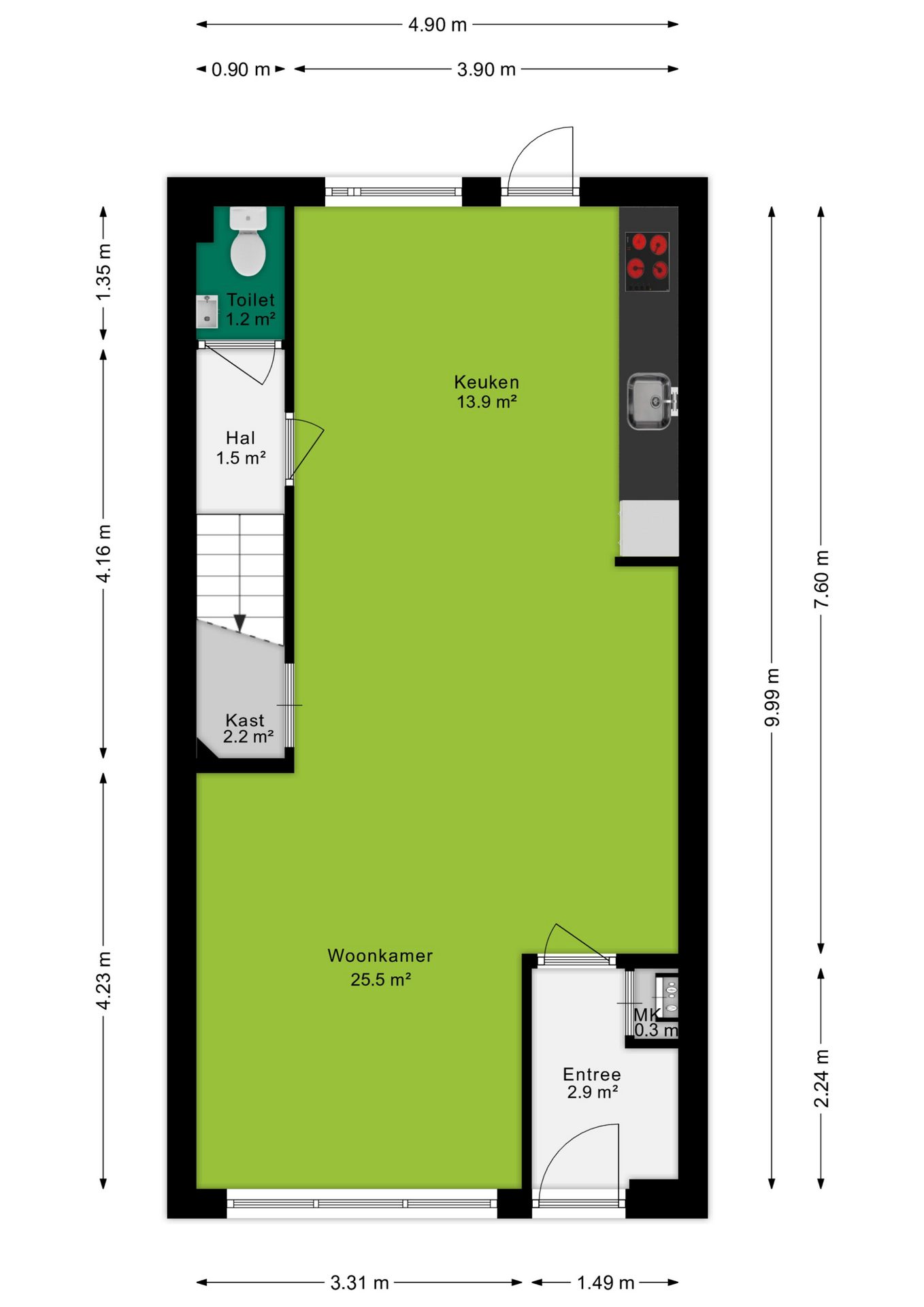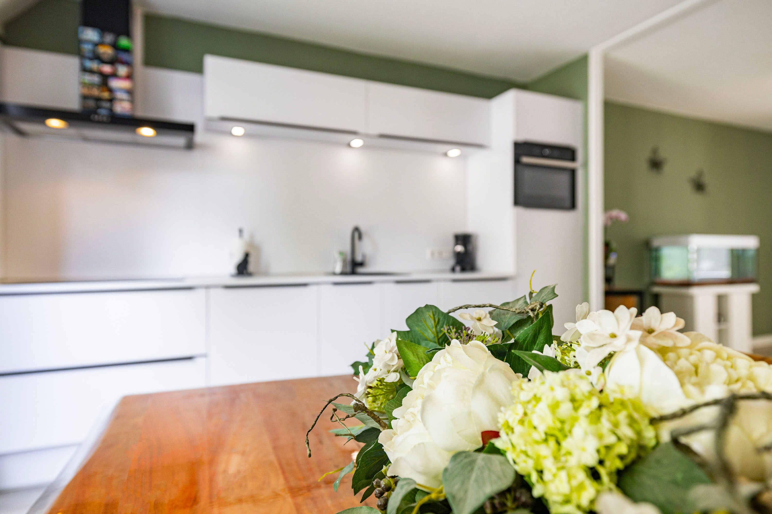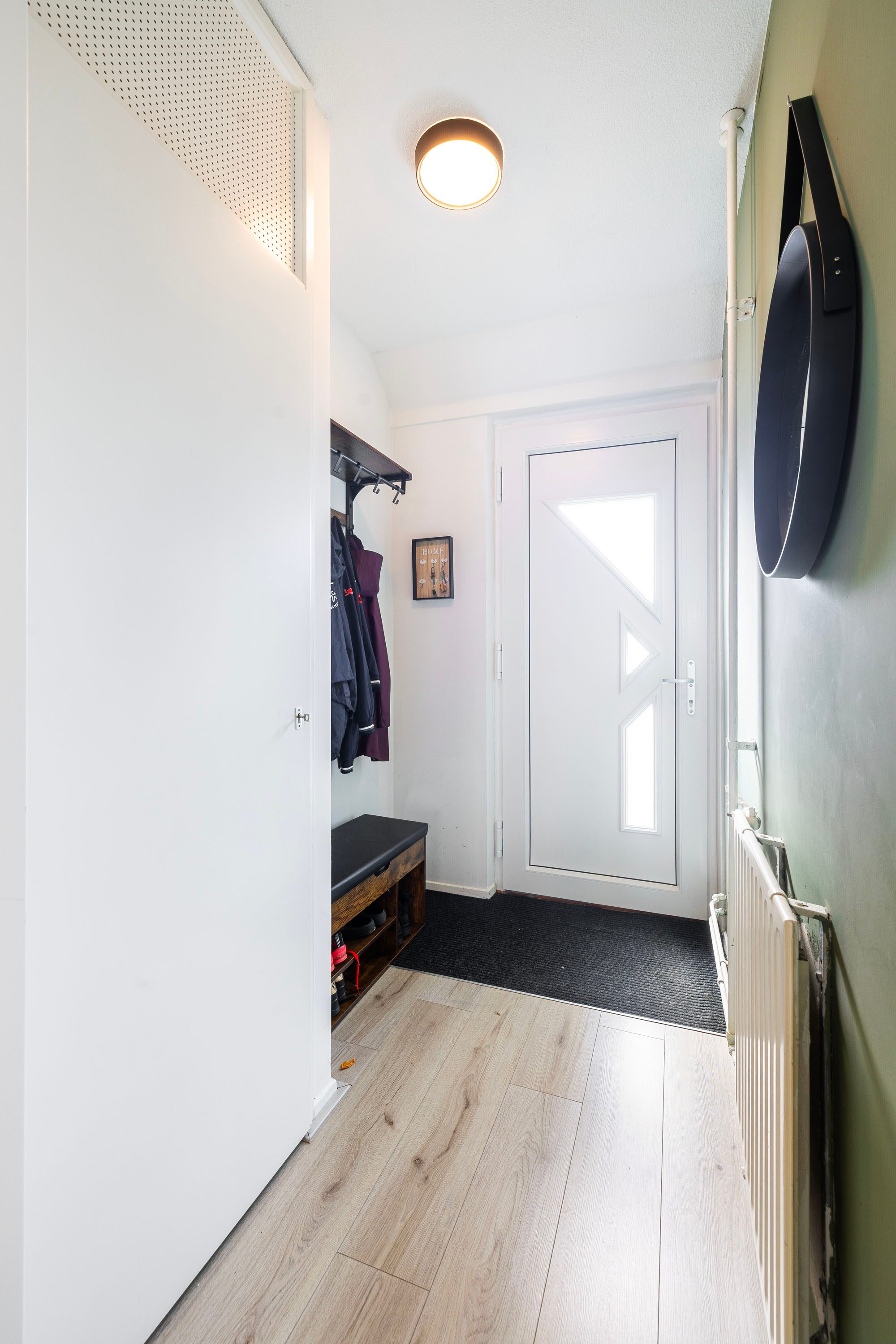 Hal/entree met meterkast en toegang tot de woonkamer. De woonkamer is licht en ruim dankzij de grote raampartijen en beschikt over een praktische trapkast. De moderne keuken (2022) is eigentijds ingericht en biedt alle ruimte en comfort. Via de keuken bereik je de tussenhal met trapopgang en het toilet met fonteintje. De keuken is uitgerust met onder andere een koelkast met vriesvak, combi oven, vaatwasser, inductie kookplaat en afzuigkap.