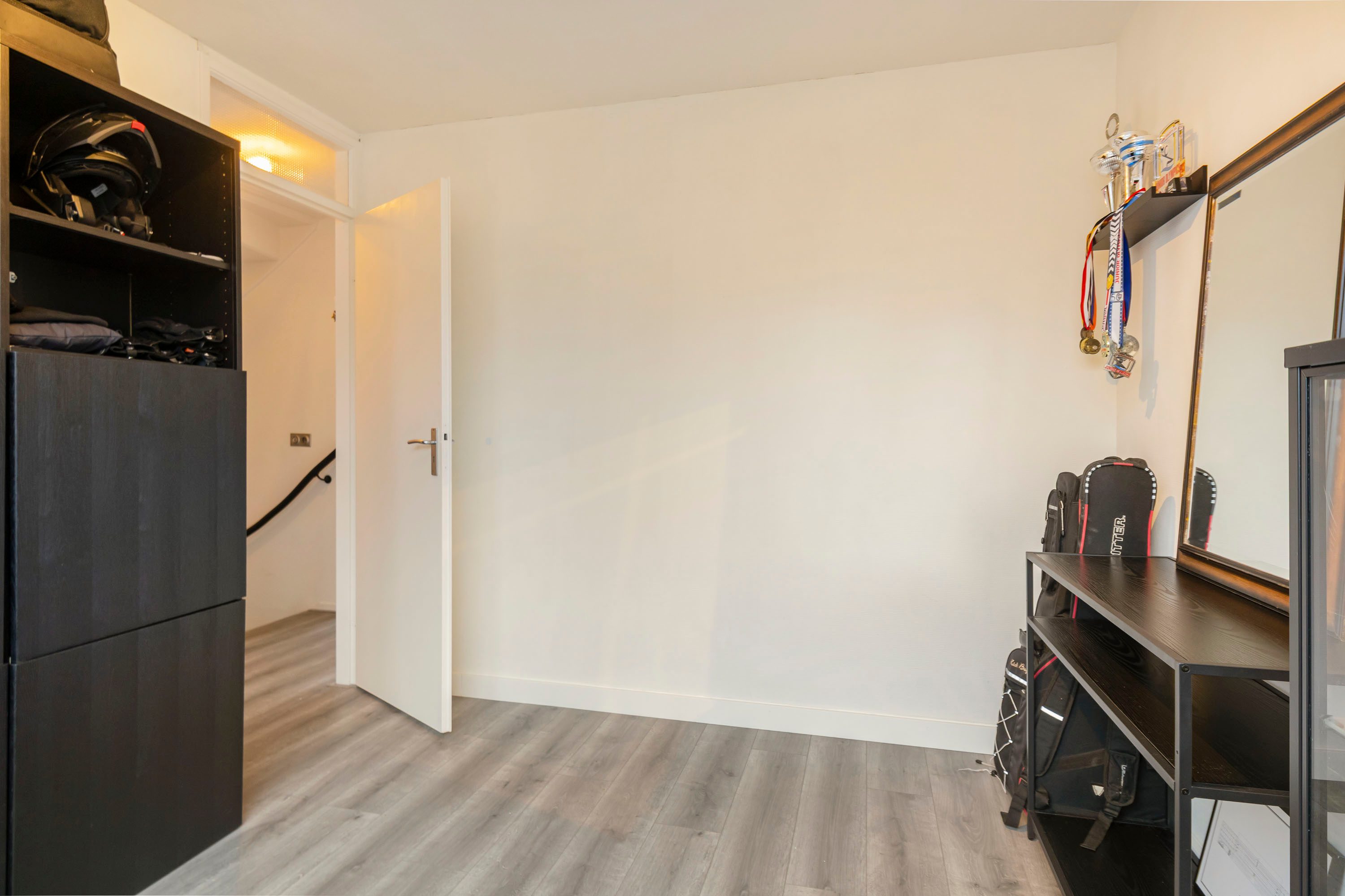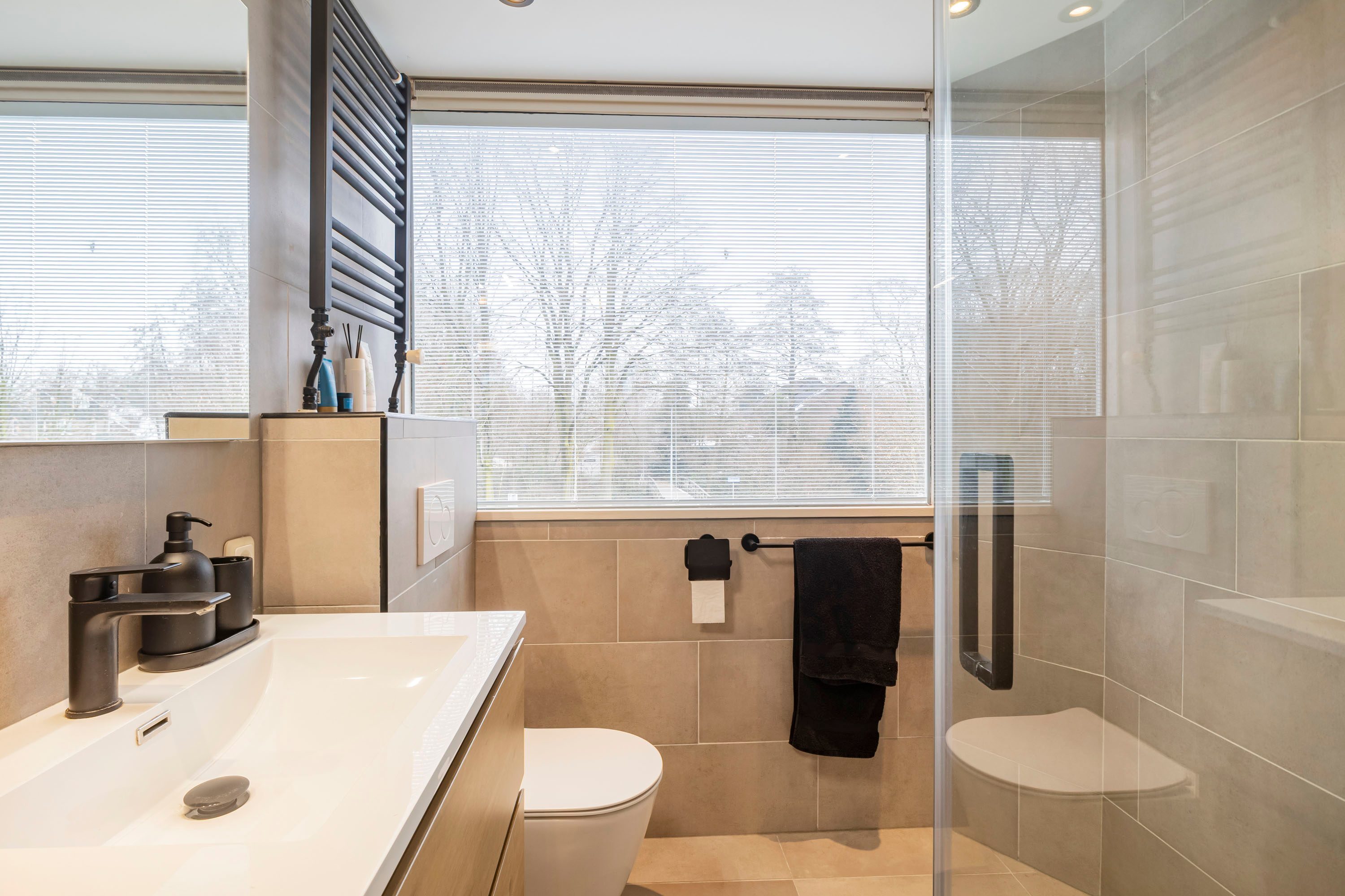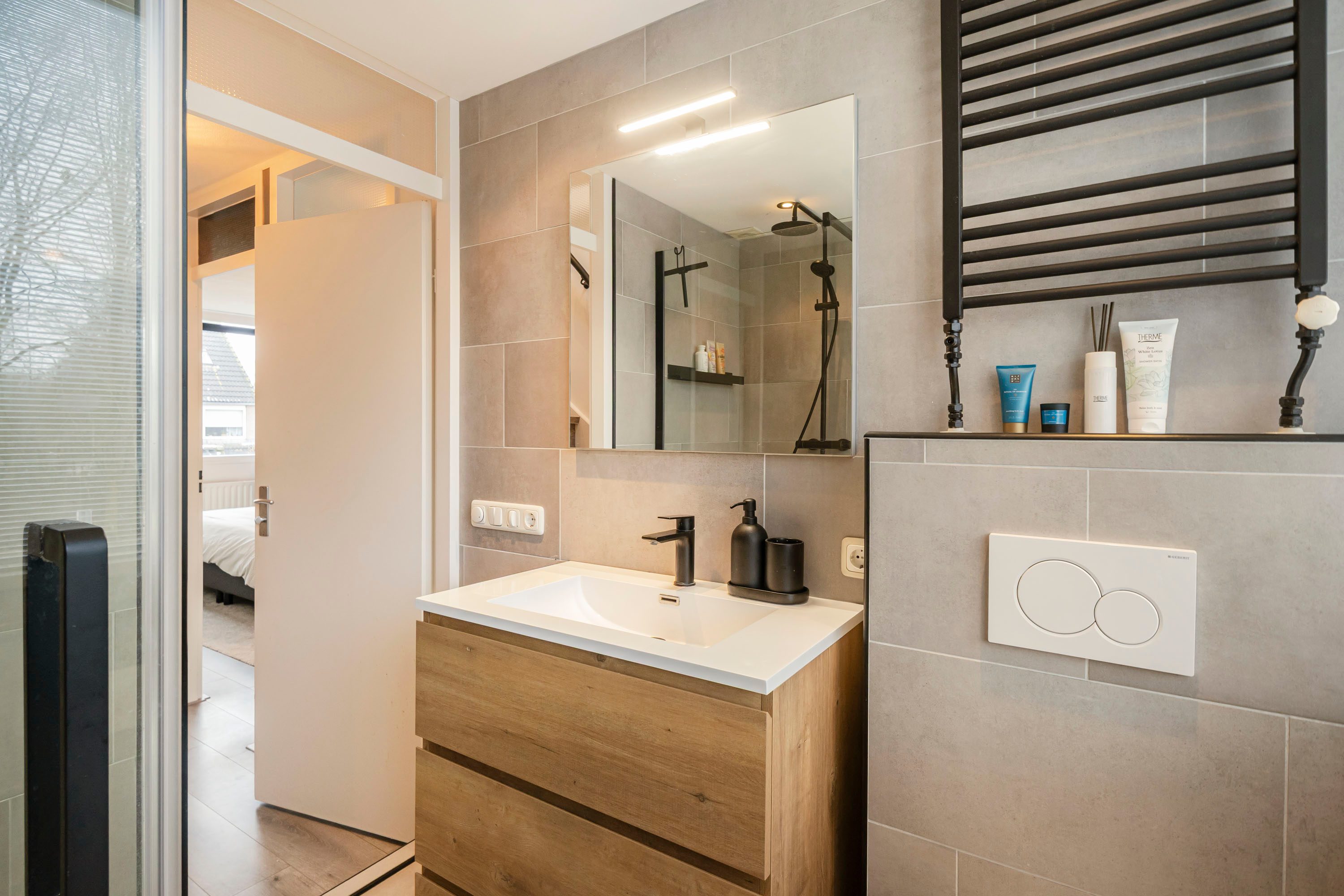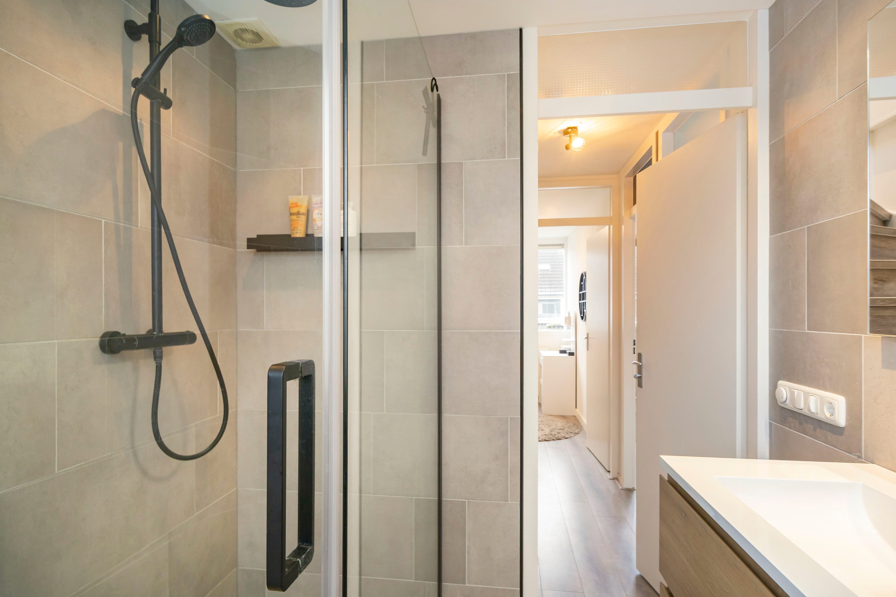 Op de eerste verdieping bevinden zich drie slaapkamers van circa 12 m², 9 m² en 6 m². De badkamer, vernieuwd in 2021, is uitgevoerd in rustige zandkleurige tinten en voorzien van een inloopdouche, toilet, wastafel met meubel en designradiator.