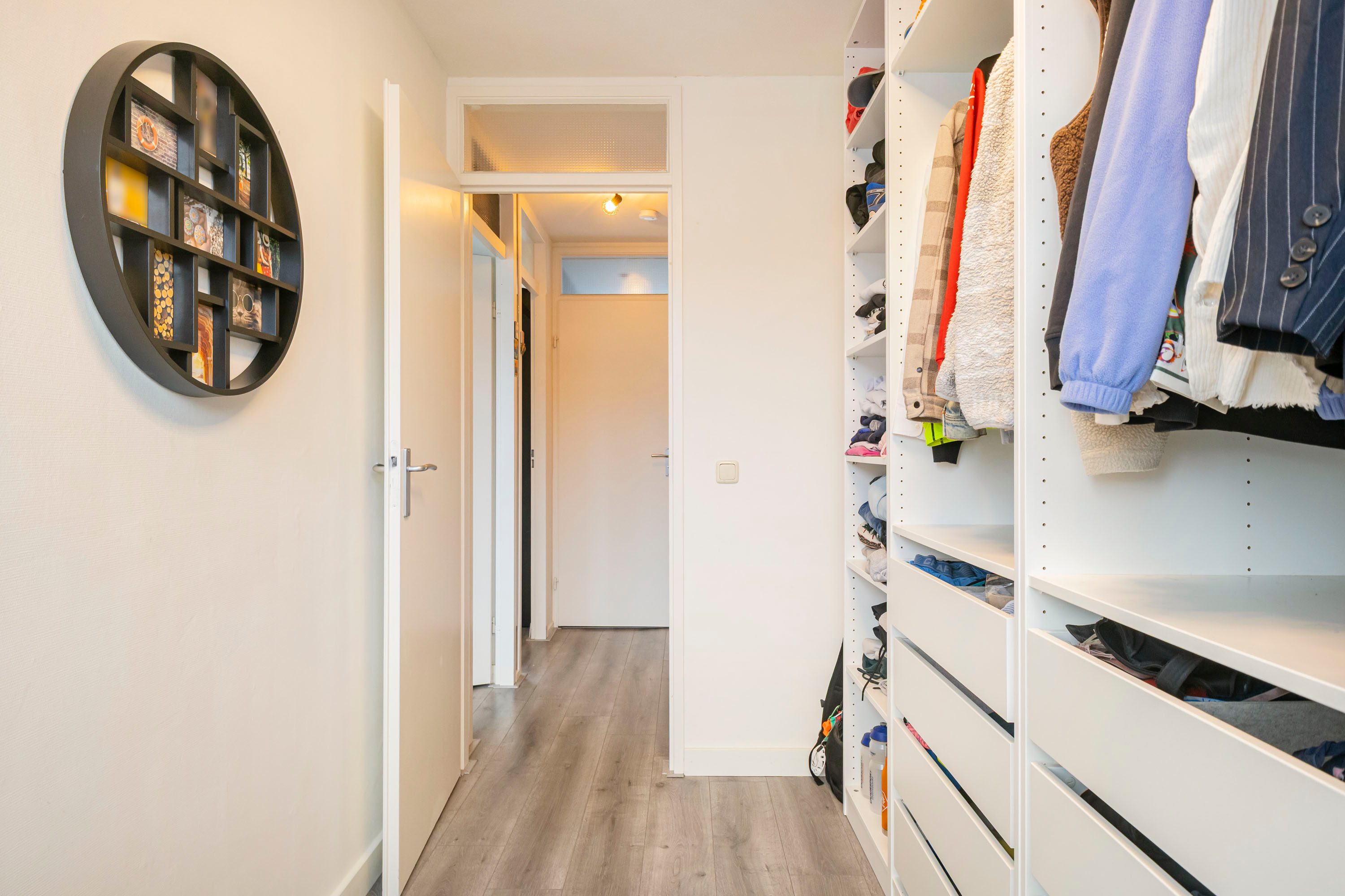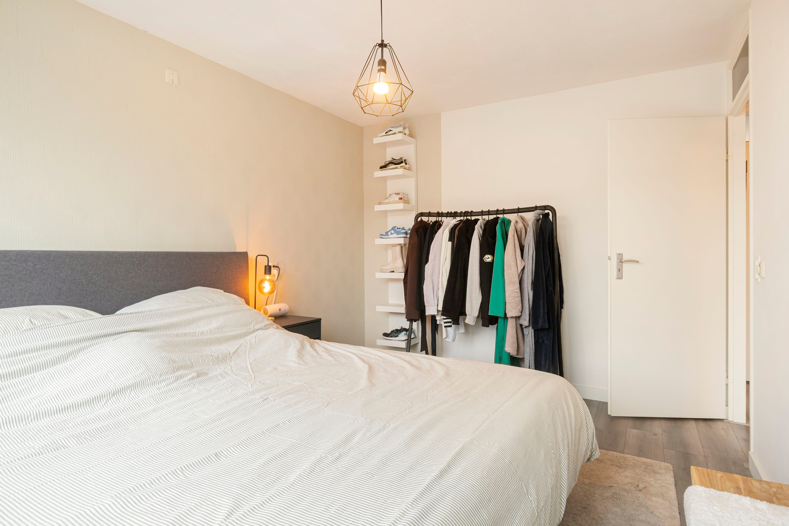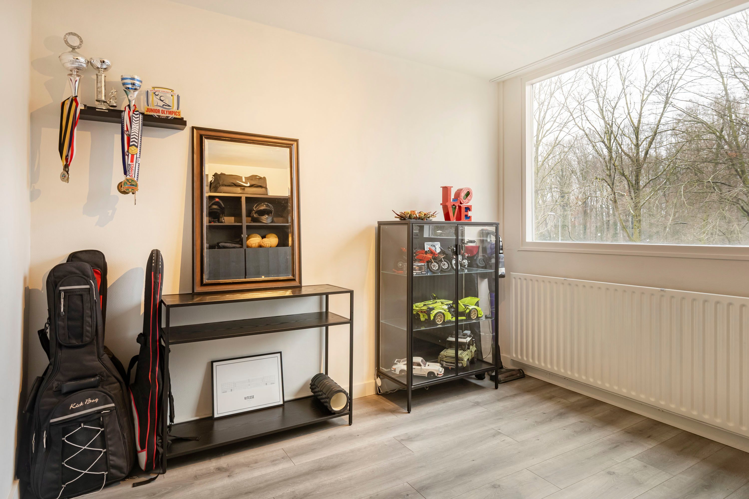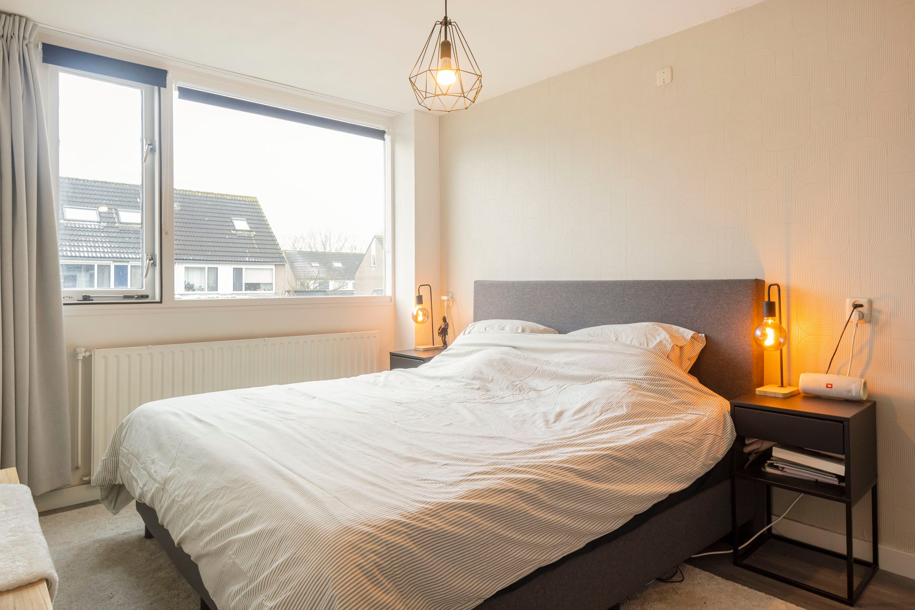 Op de eerste verdieping bevinden zich drie slaapkamers van circa 12 m², 9 m² en 6 m². De badkamer, vernieuwd in 2021, is uitgevoerd in rustige zandkleurige tinten en voorzien van een inloopdouche, toilet, wastafel met meubel en designradiator.