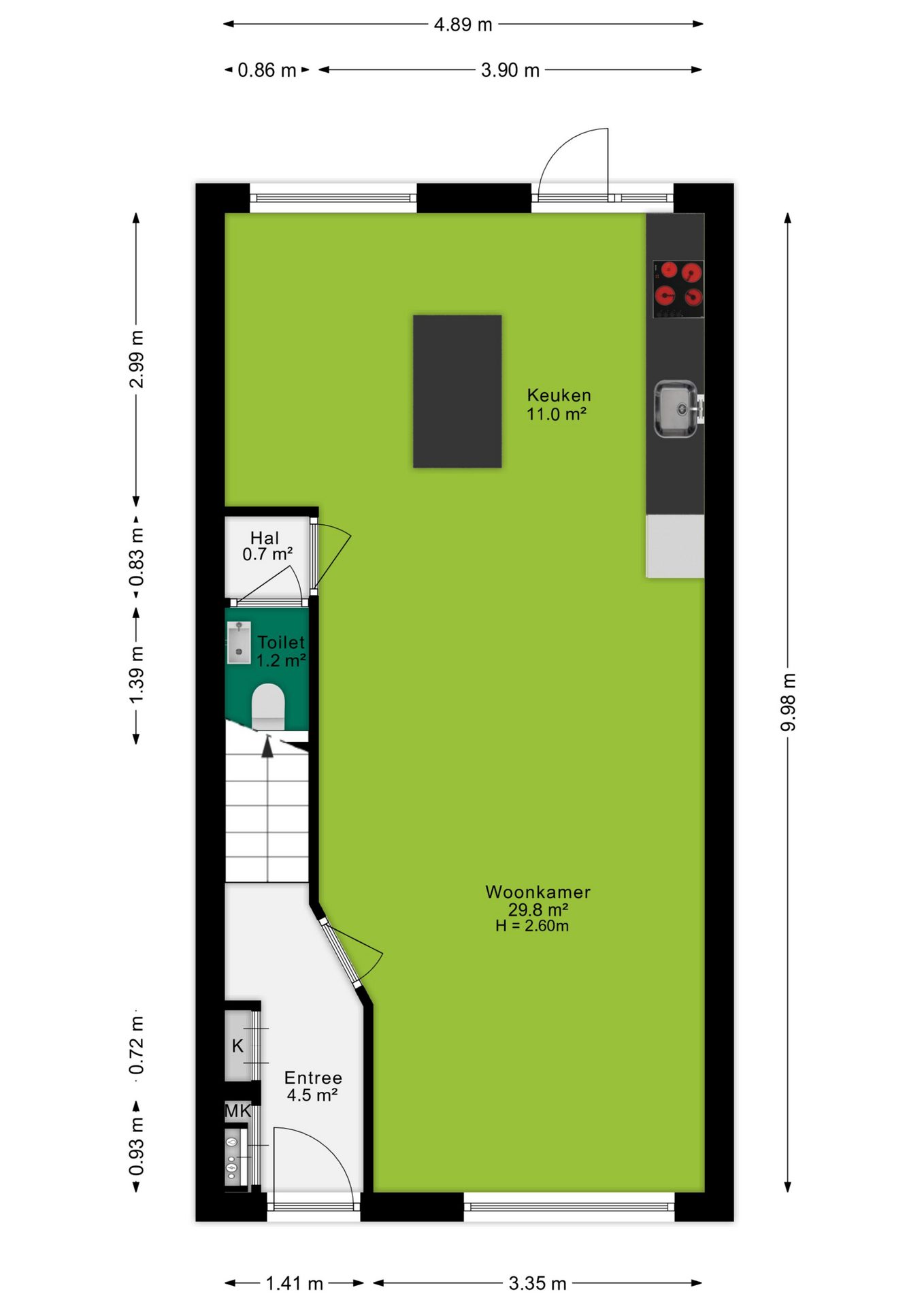 Via de entree kom je in de hal met de meterkast en de trapopgang naar de eerste verdieping. Vanuit hier stap je de leefruimte binnen, die dankzij de grote raampartijen aan zowel de voor- als achterzijde direct licht en ruim aanvoelt. De open indeling creëert een natuurlijke verbinding tussen de woonkamer en de keuken, waardoor je altijd gemakkelijk contact hebt met elkaar, of je nu ontspannen op de bank zit of aan het koken bent. Zowel de woonkamer als de keuken zijn voorzien van vloerverwarming, wat zorgt voor extra comfort.