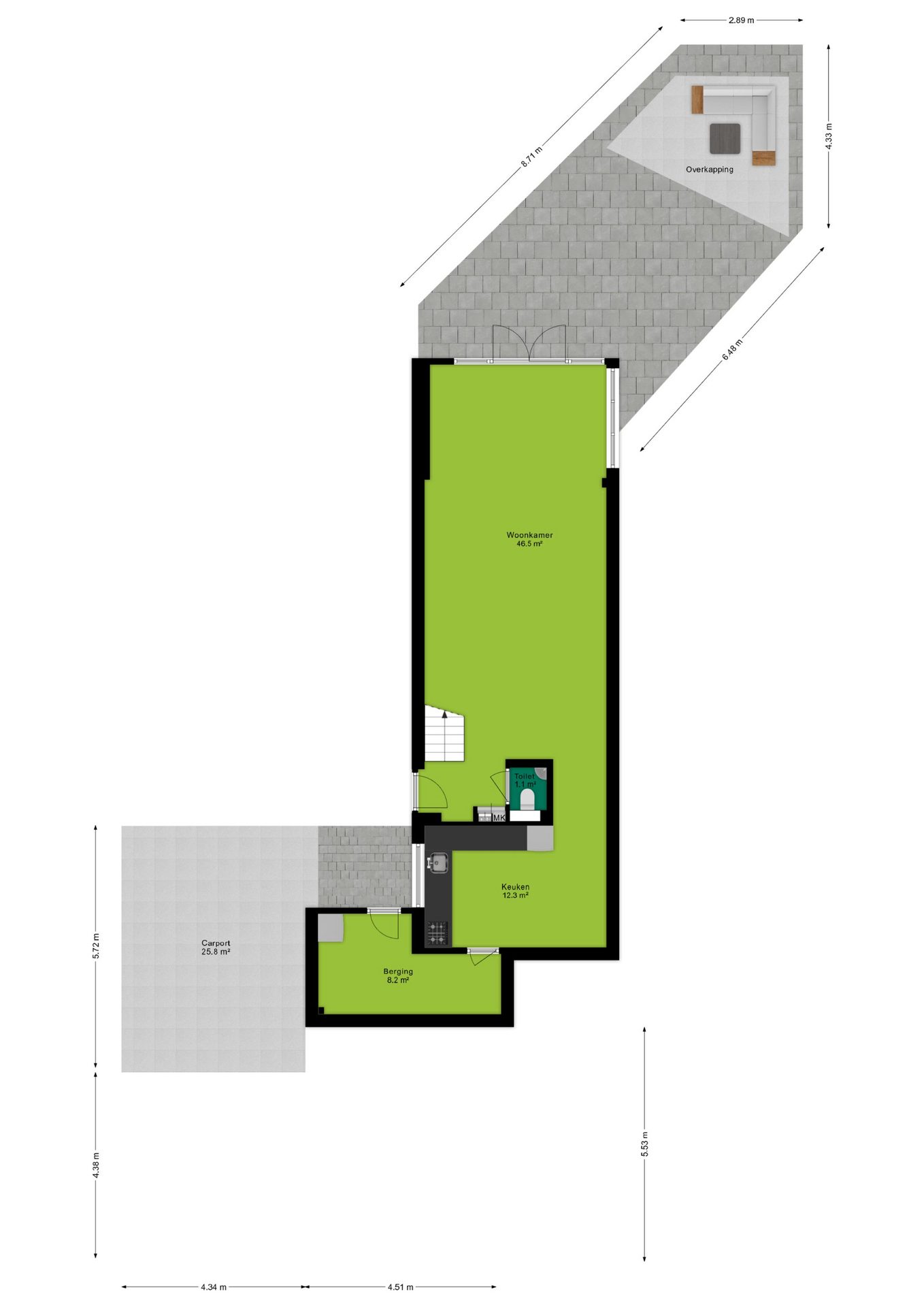 Via de carport en de beschutte binnenplaats bereik je de entree van de woning. In de hal is ruimte voor een garderobe, tref je de vernieuwde meterkast (2023), een moderne toiletruimte met hangend toilet en de trapopgang naar de eerste verdieping.