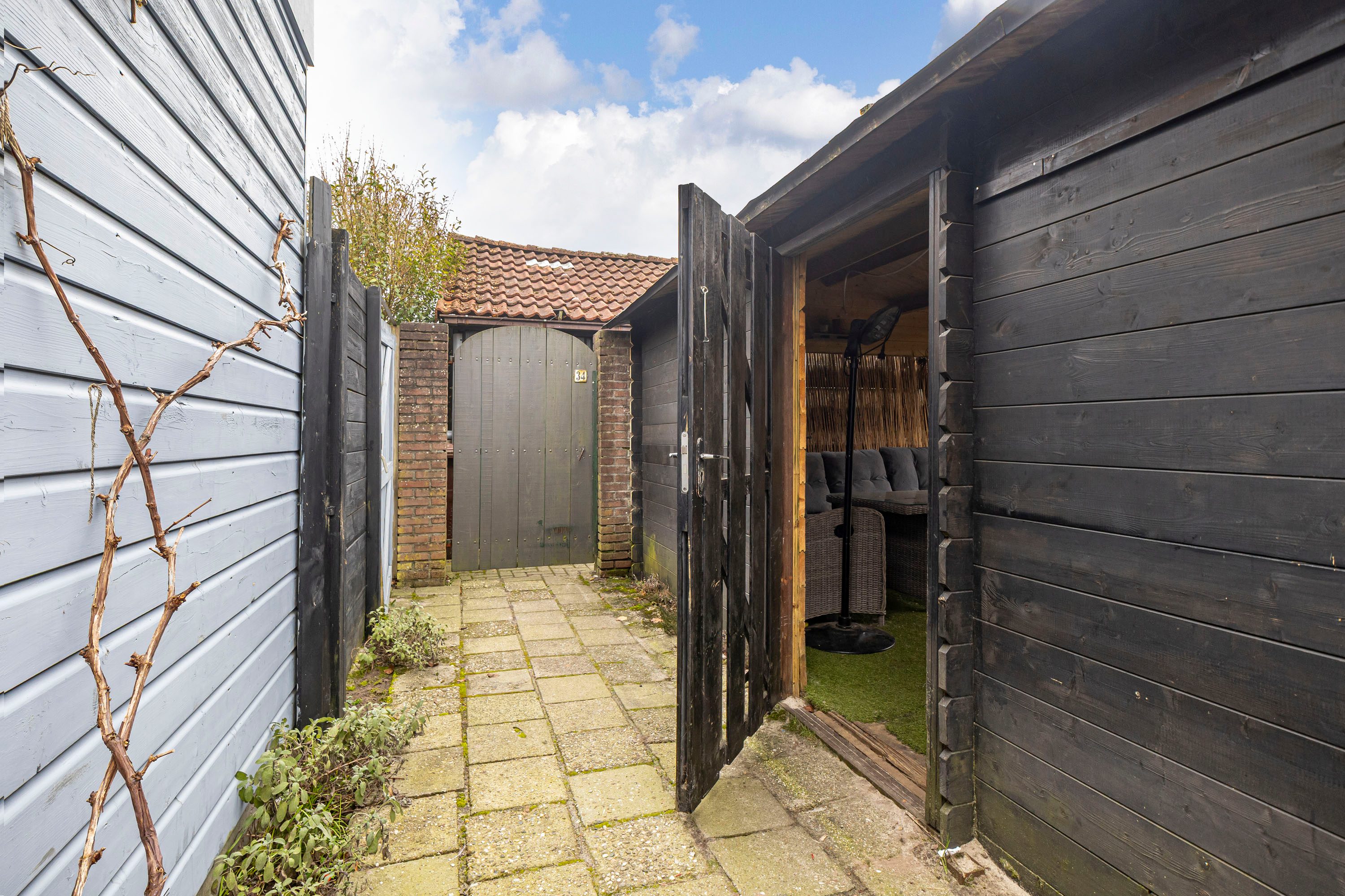 De tuin is bereikbaar via een achterom en je komt hierbij uit onder een overkapping, een fijne plek om ook bij minder mooi weer buiten te zitten. Daarnaast is er een houten berging aanwezig voor het opbergen van fietsen en tuingereedschap.