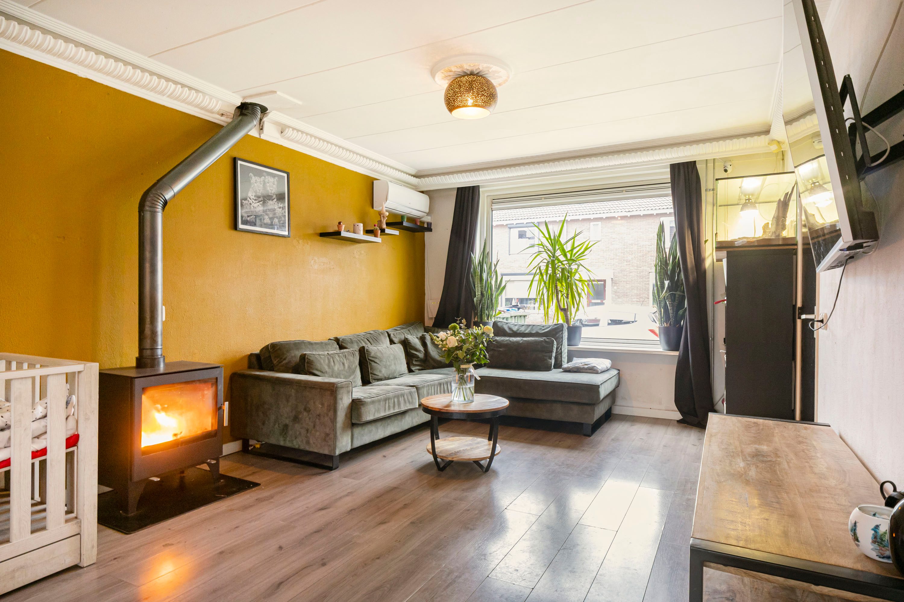 Via de entree kom je binnen in de hal met toegang tot het toilet, de keuken en de trapopgang naar de eerste verdieping. De woonkamer is direct een fijne verrassing: door de gerealiseerde uitbouw is een royale leefruimte ontstaan van circa 10 meter diep. De houtkachel zorgt voor extra sfeer en warmte.