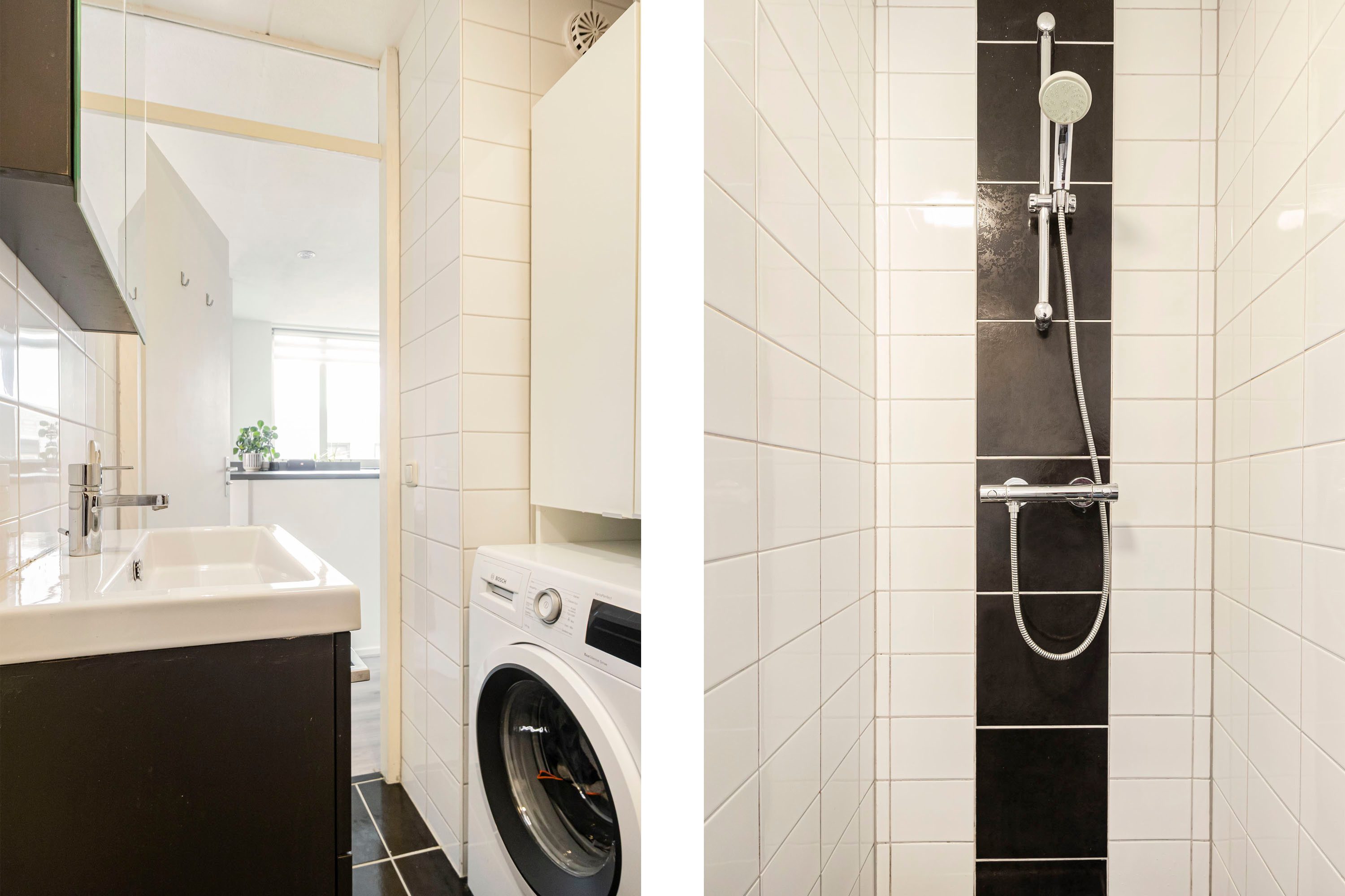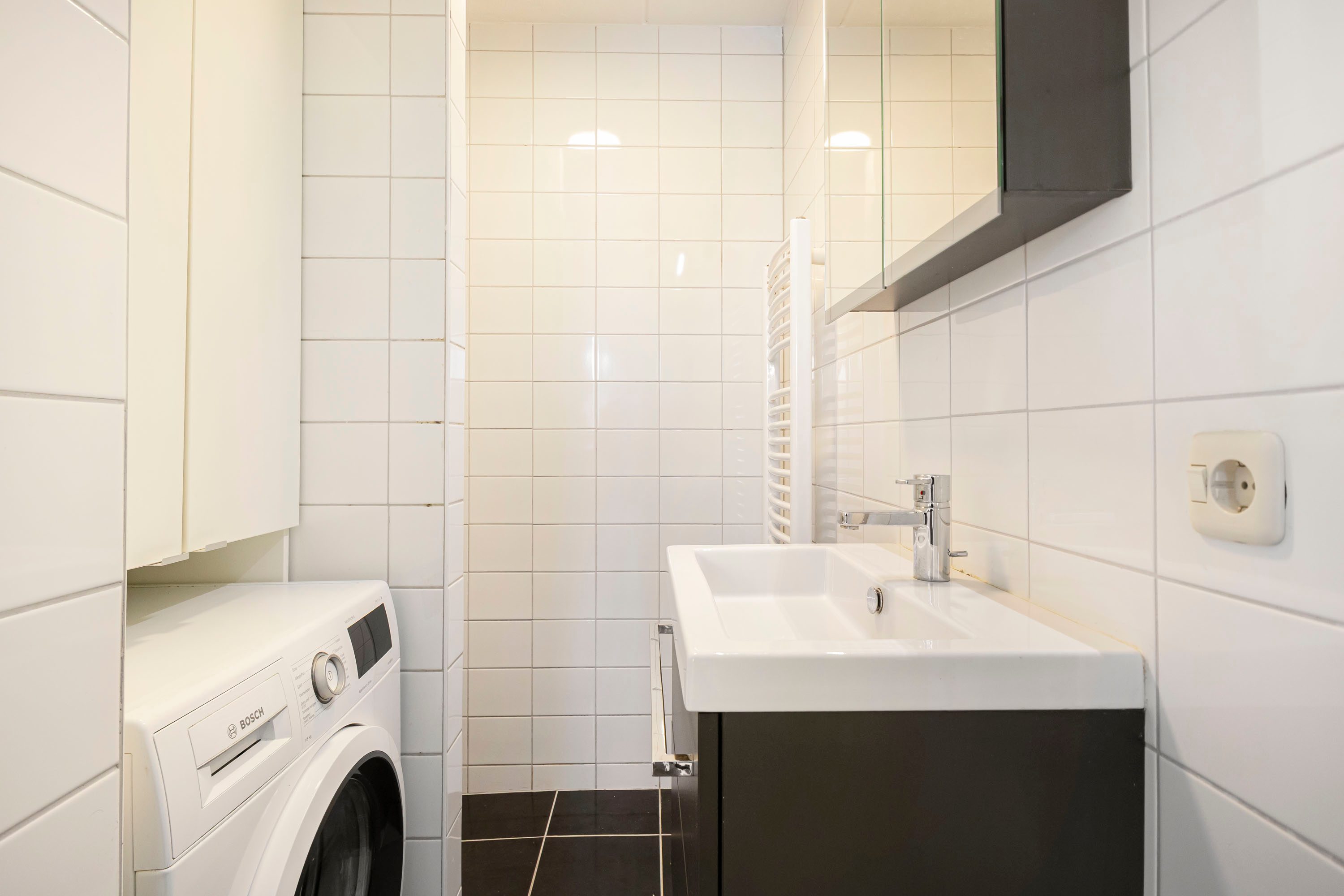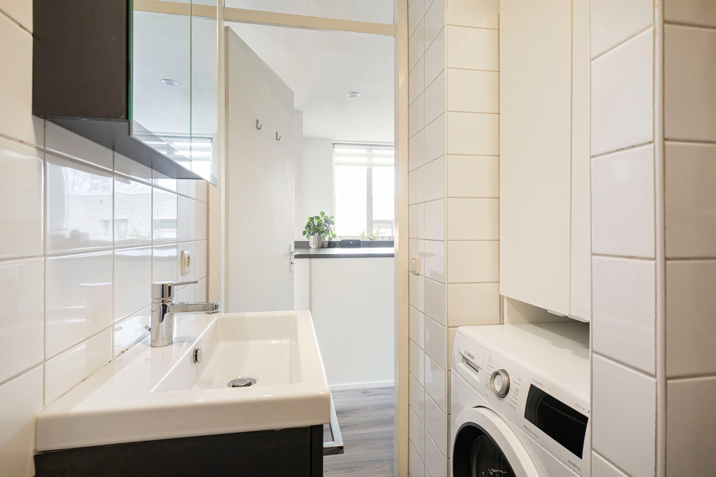 De badkamer is netjes uitgevoerd en voorzien van een inloopdouche, wastafel met meubel, designradiator, spiegelkast en wasmachineaansluiting. Het toilet is separaat van de badkamer, wat extra comfort biedt.