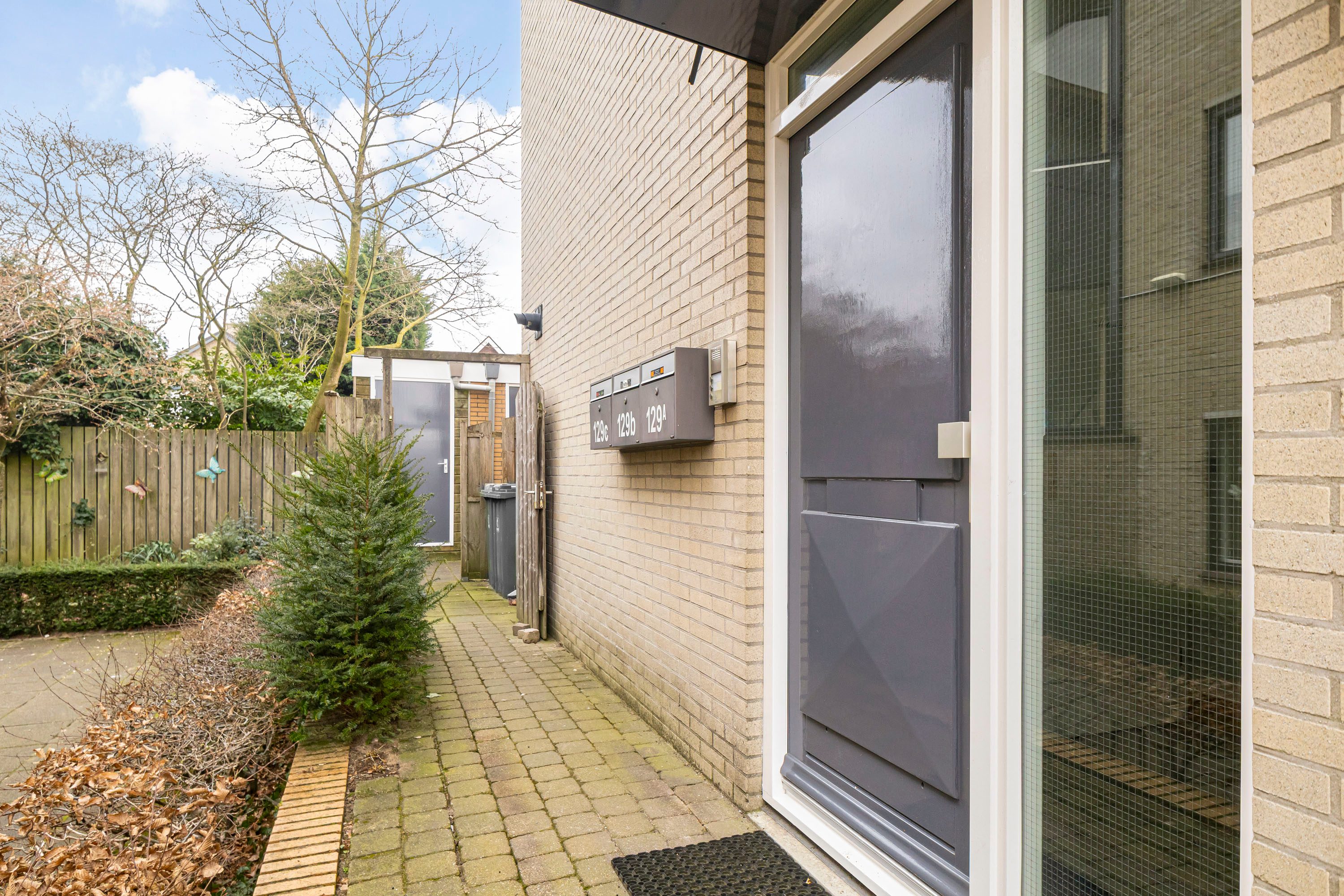 De entree van het complex bevindt zich aan de zijkant en wordt gedeeld met slechts twee andere appartementen, wat zorgt voor een kleinschalig en rustig geheel.