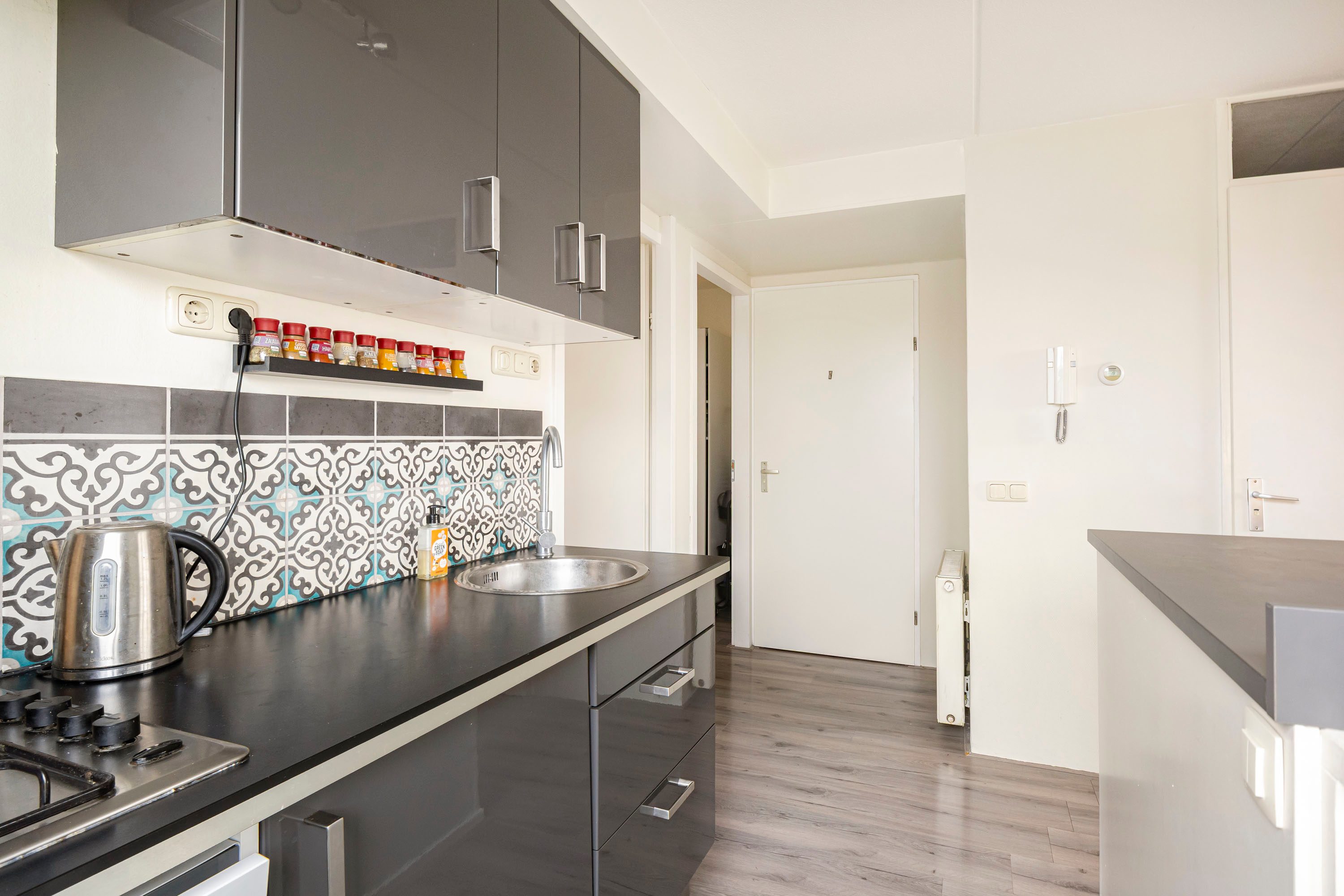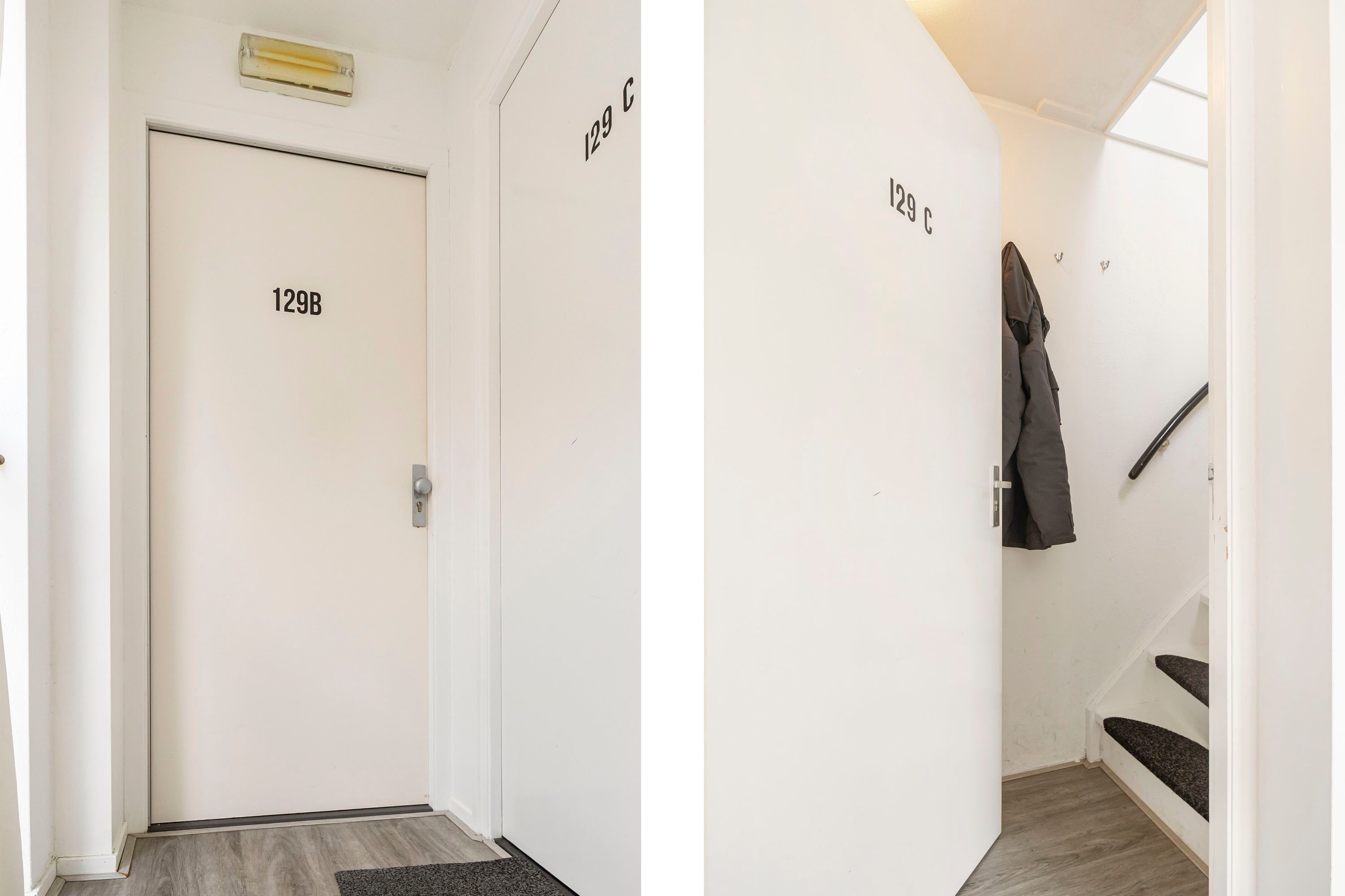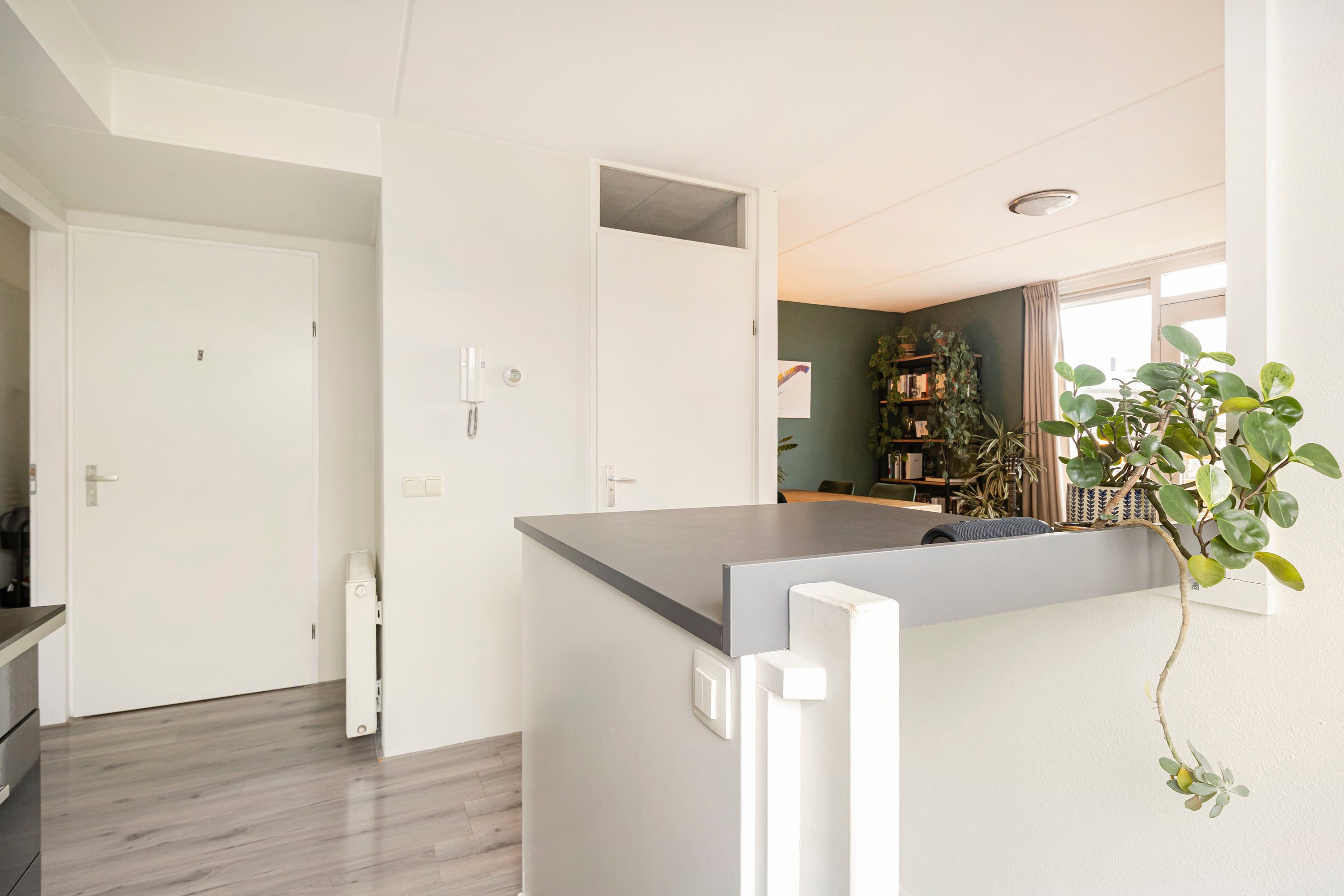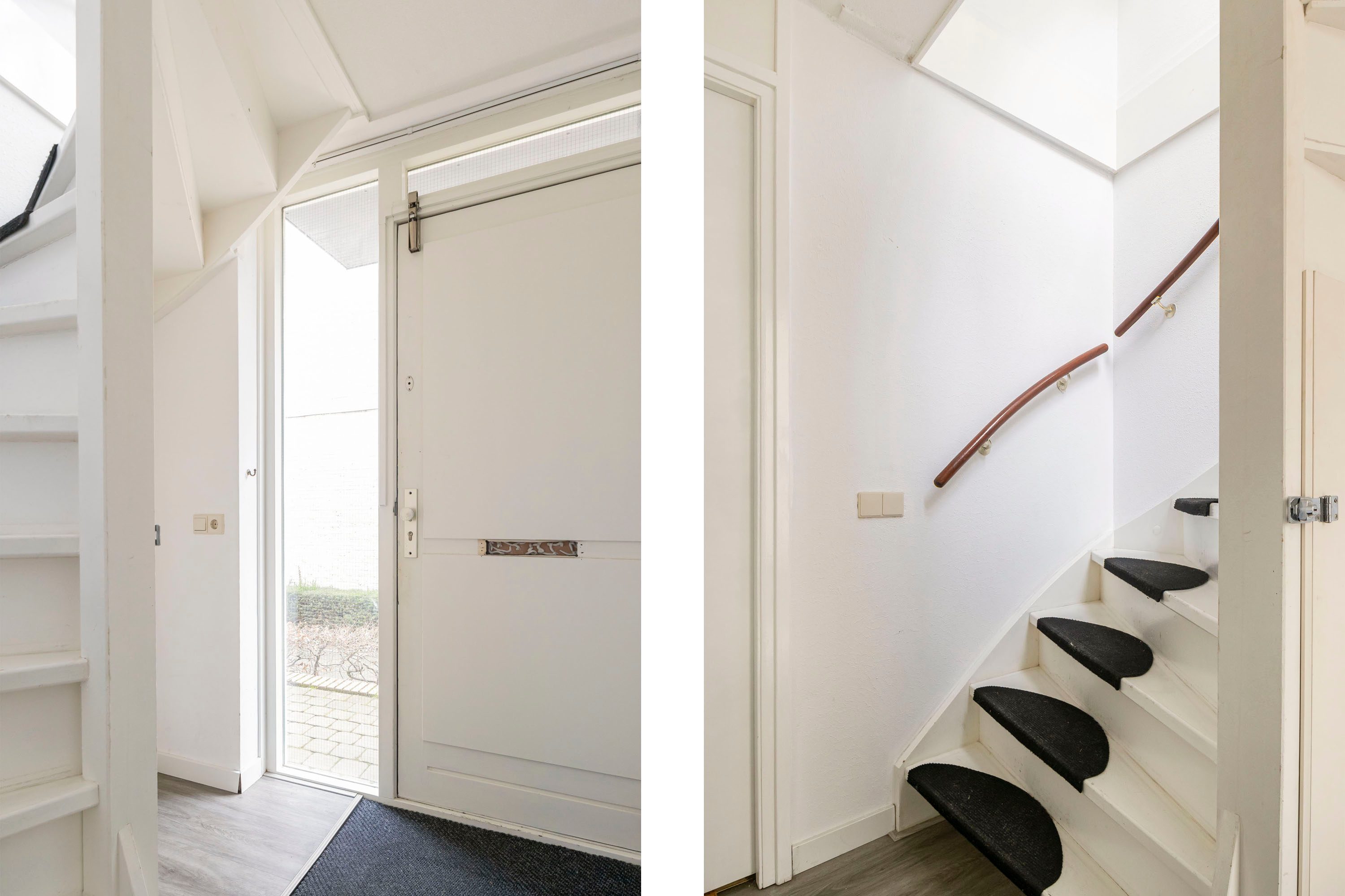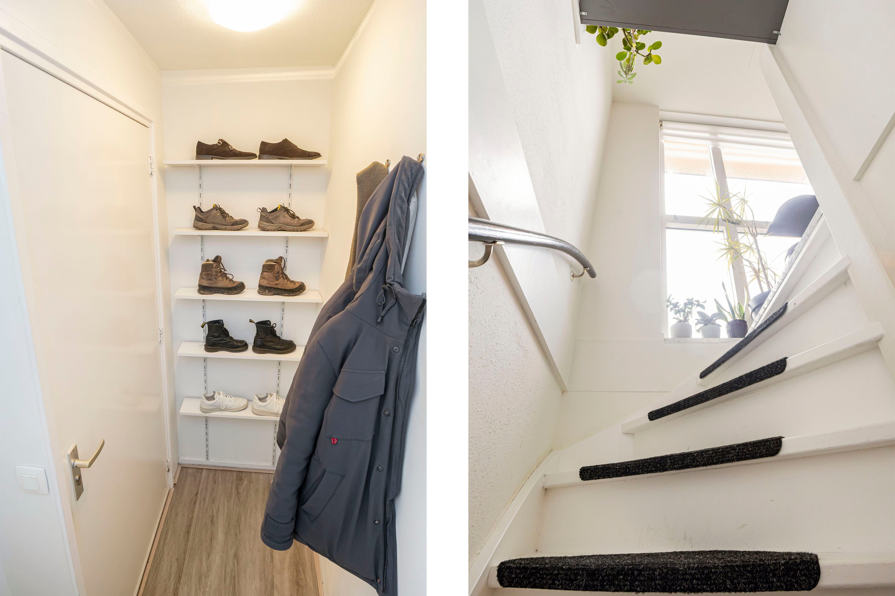 Via de gezamenlijke entree bereik je de eerste verdieping, waar de voordeur van het appartement zich bevindt. In de hal is ruimte om jassen en schoenen netjes op te bergen. Vanuit hier leidt een trap naar de woonverdieping.
