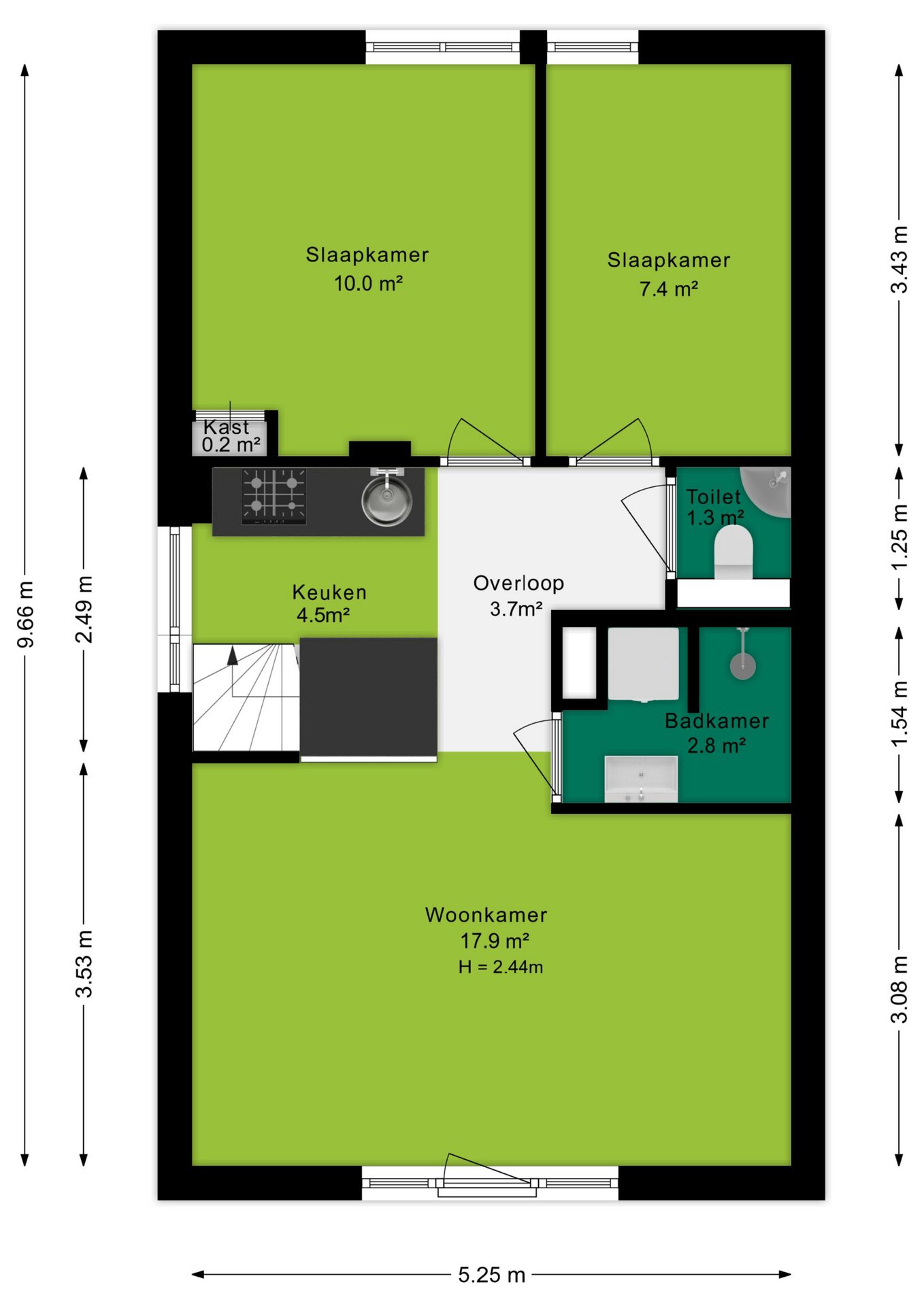 Vanuit de woonkamer heb je toegang tot twee slaapkamers, gelegen aan de achterzijde van de woning. De slaapkamers zijn circa 10 m² en 7 m² groot en zijn naast slaapkamer ook uitstekend geschikt als thuiswerkplek of hobbyruimte.
