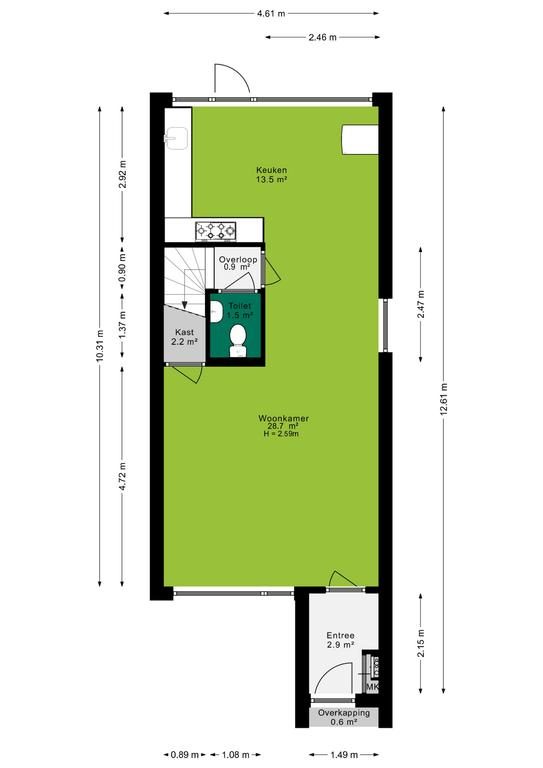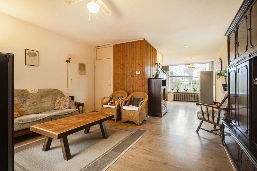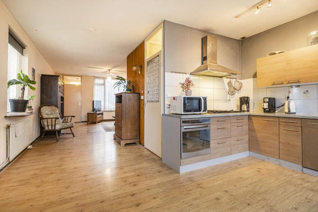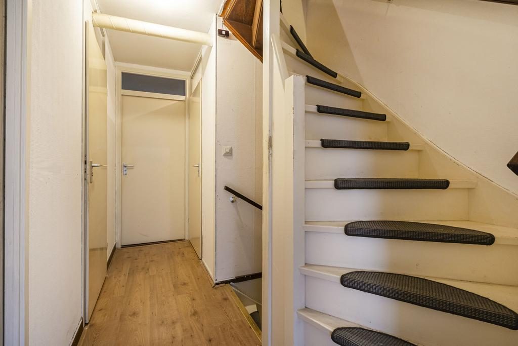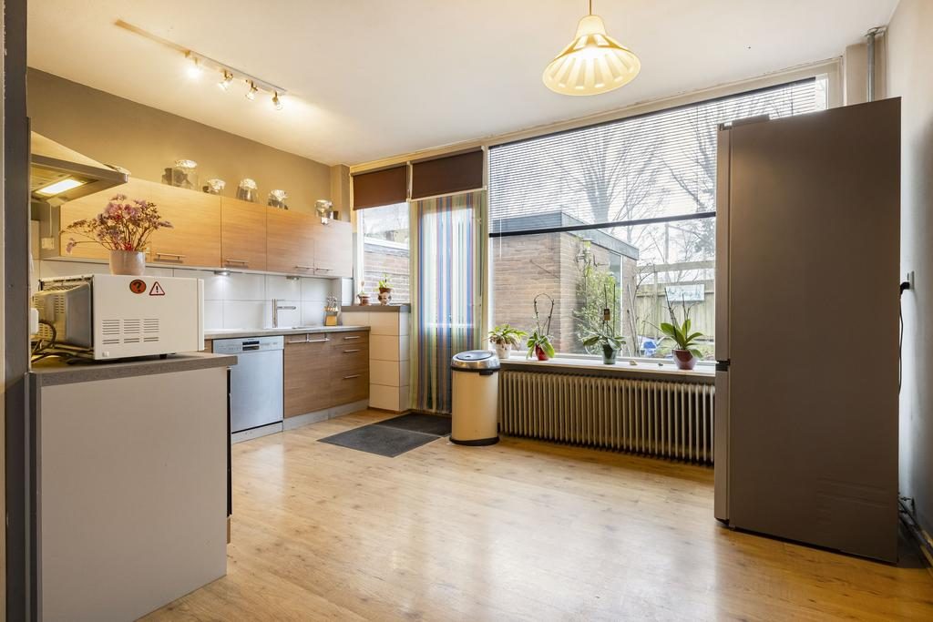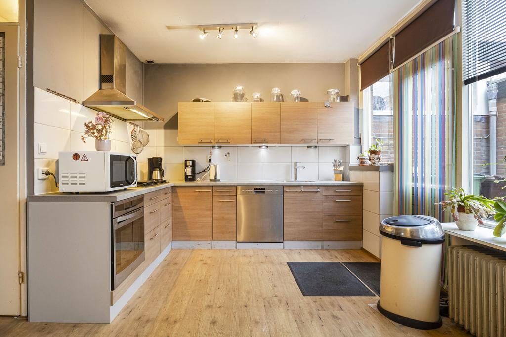 Binnenkomst in de hal met meterkast, een ruime woonkamer van ongeveer 29 m² die veel natuurlijk licht ontvangt, en een opbergruimte onder de trap. De keuken biedt uitzicht op de tuin en is uitgerust met diverse inbouwapparaten, waaronder een gasfornuis, afzuigkap, oven en vaatwasser. Vanuit de hal is er toegang tot het toilet met fonteintje en de trap naar de eerste verdieping.