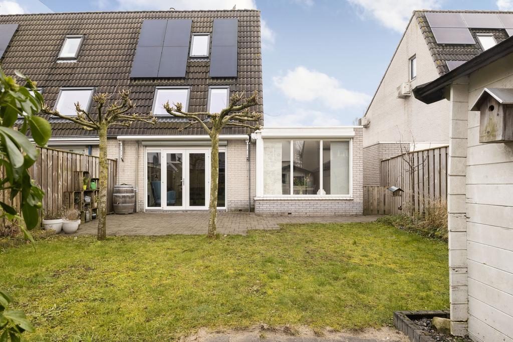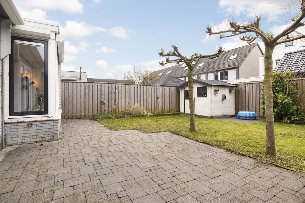 Vanuit de woonkamer en via een pad aan de zijkant van de woning stap je zo de tuin in, die op het zuidwesten is gelegen. Dit zorgt ervoor dat je volop kunt genieten van de zon in de middag en avond. in 2023 is er een nieuw zonnescherm geplaatst, waardoor je ook, indien gewenst, in de schaduw kunt zitten. De tuin is verzorgd aangelegd, met een mooi grasveld aan de achterkant. Daar vind je ook een compacte berging.