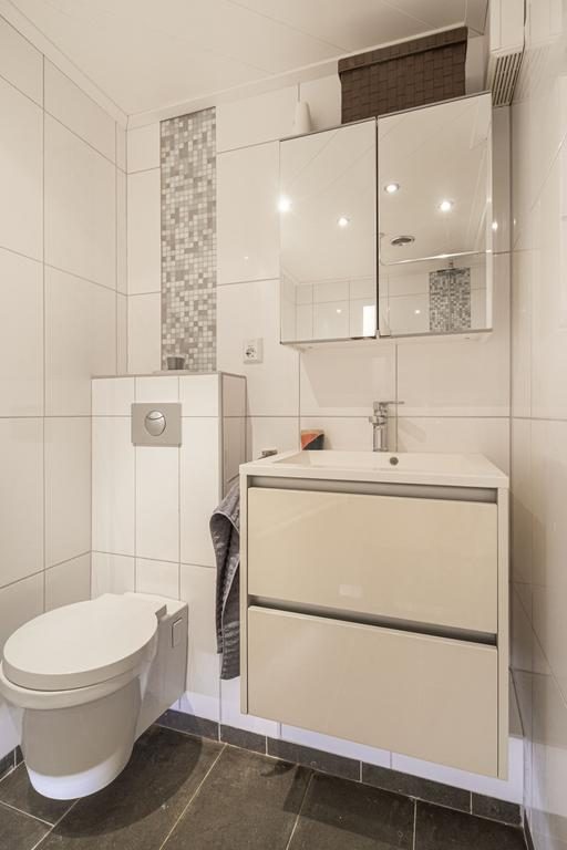 De badkamer op deze verdieping is uitgevoerd in een lichte kleurstelling. De badkamer is voorzien van een moderne douche, een comfortabel ligbad voor ontspannen momenten, een wastafel met opbergruimte en een toilet. Deze goed uitgeruste badkamer biedt alles wat je nodig hebt voor je dagelijkse routine en momenten van ontspanning.