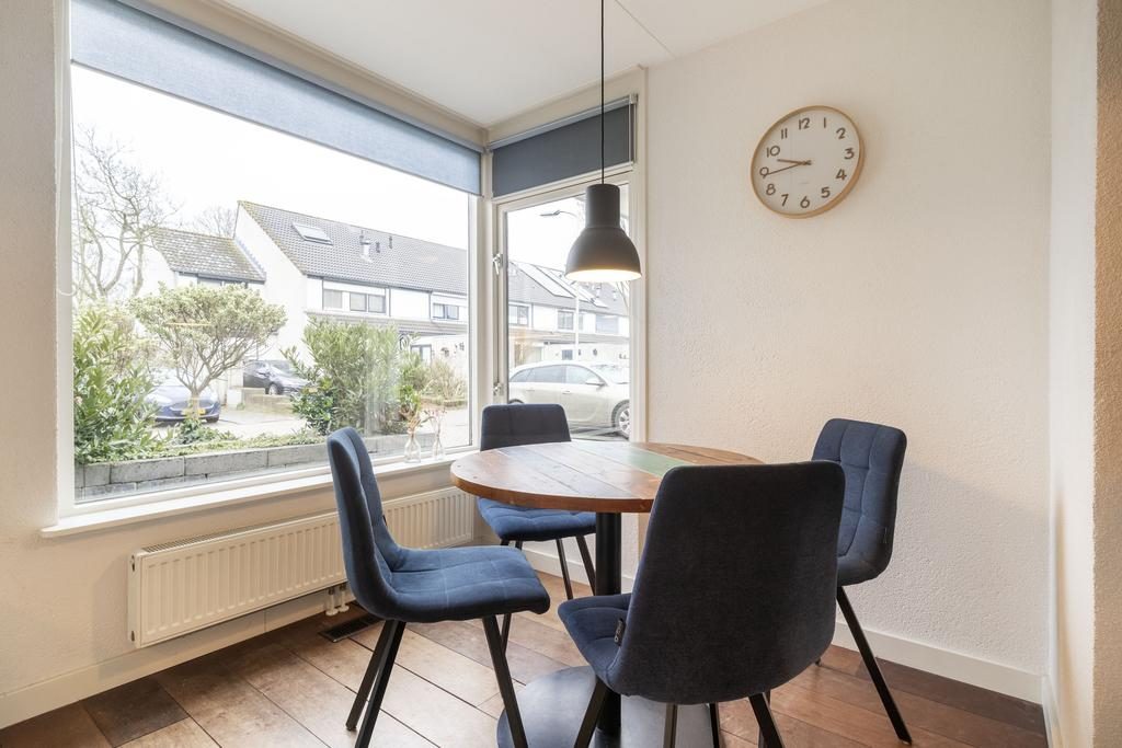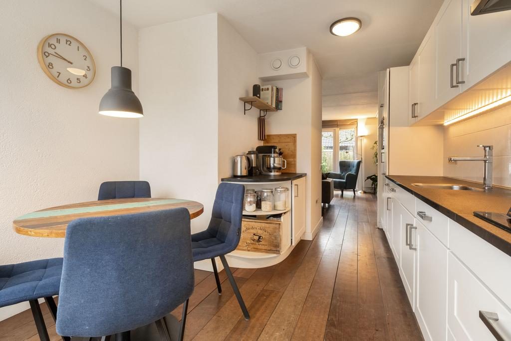 De keuken, die je vanuit de woonkamer bereikt, is uitgevoerd in een lichte kleurstelling met een stijlvol donker werkblad. Deze is uitgerust met moderne gemakken, waaronder een vierpits gasfornuis, afzuigkap, koelkast, diepvries (2021) combioven (2023) en vaatwasser. Daarnaast is er voldoende ruimte voor een eettafel, waar je kunt genieten van het uitzicht op de straatzijde.